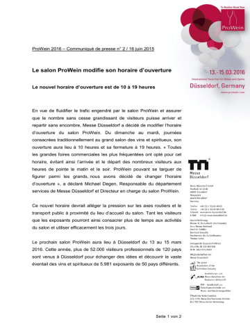 ProWein 2016 – Communiqué de presse n° 2 / 16 juin 2015 Le salon ProWein modifie son horaire d’ouverture Le nouvel horaire d’ouverture est de 10 à 19 heures En vue de fluidifier le trafic engendré par le salon ProWein et assurer que le nombre sans cesse grandissant de visiteurs puisse arriver et repartir sans encombre, Messe Düsseldorf a décidé de modifier l’horaire d’ouverture du salon ProWein. Du dimanche au mardi, journées consacrées traditionnellement au grand salon des vins et spiritueux, son ouverture aura lieu à 10 heures et sa fermeture à 19 heures. « Toutes les grandes foires commerciales les plus fréquentées ont opté pour cet horaire, évitant ainsi l’arrivée et le départ des nombreux visiteurs aux heures de pointe le matin et le soir. ProWein pouvant se targuer de figurer parmi les grands, nous avons décidé de changer l’horaire d’ouverture », a déclaré Michael Degen, Responsable du département services de Messe Düsseldorf et Directeur en charge du salon ProWein. Ce nouvel horaire devrait alléger la pression sur les axes routiers et le transport public à proximité du lieu d’accueil du salon. Tant les visiteurs que les exposants pourront ainsi consacrer plus de temps aux activités du salon et utiliser efficacement les trois jours. Le prochain salon ProWein aura lieu à Düsseldorf du 13 au 15 mars 2016. Cette année, plus de 52.000 visiteurs professionnels de 120 pays sont venus à Düsseldorf pour échanger des idées et découvrir le vaste éventail des vins et spiritueux de 5.981 exposants de 50 pays différents. Seite 1 von 2 Les photos de presse de ProWein 2015 sont disponibles sur notre base de données photos de la section « Service Presse » sur www.prowein.de. Contacts pour la presse : Messe Düsseldorf GmbH, Press Office ProWein Christiane Schorn Brigitte Küppers (Assistante) Tél. : +49(0)211/4560 –598/–929 [email protected], [email protected] Pour en savoir plus, rendez-vous sur : www.prowein.de ou les réseaux sociaux Facebook : www.facebook.com/ProWein.tradefair Twitter : https://twitter.com/ProWein Seite 2 von 2