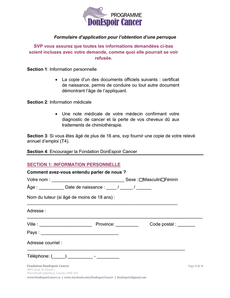 Formulaire d’application pour l’obtention d’une perruque SVP vous assurez que toutes les informations demandées ci-bas soient incluses avec votre demande, comme quoi elle pourrait se voir refusée. Section 1: Information personnelle La copie d’un des documents officiels suivants : certificat de naissance, permis de conduire ou tout autre document démontrant l’âge de l’appliquant. Section 2: Information médicale Une note médicale de votre médecin confirmant votre diagnostic de cancer et la perte de vos cheveux dû aux traitements de chimiothérapie. Section 3: Si vous êtes âgé de plus de 16 ans, svp fournir une copie de votre relevé annuel d’emploi (T4). Section 4: Encourager la Fondation DonEspoir Cancer SECTION 1: INFORMATION PERSONNELLE Comment avez-vous entendu parler de nous ? Votre nom : _____________________________ Sexe : Masculin Féminin Âge : __________ Date de naissance : ____ / _____ / ______ Nom du tuteur (si âgé de moins de 18 ans) : ____________________________________________________________ Adresse : ______________________________________________________________________ Ville : _____________________ Province: _________ Code postal : _______ Pays : _______________________________ Adresse courriel : _______________________________________________________________ Téléphone: (_____) __________ - _________ Fondation DonEspoir Cancer 4891 boul. St-Charles Pierrefonds (Québec), Canada H9H 3E4 www.DonEspoirCancer.ca | www.facebook.com/DonEspoirCancer | [email protected] Page 1 de 4 Année scolaire (si à l’école) : _____________ Vous avez déjà été récipiendaire d’une perruque de notre organisme ? Date de votre dernière demande : ____/____/____ Oui Non SECTION 2 : INFORMATION MÉDICALE Raison de la perte de vos cheveux : ________________________ Quel est votre condition médicale : ______________________________ Vous avez déjà perdu vos cheveux dans le passé ? Oui Non Vous suivez des traitements de chimiothérapie présentement ? Oui Date de début de vos traitements : _________________ Non Vous avez une prescription pour une perruque ou une prothèse capillaire ? Oui Non Nom de votre hôpital : ______________________________________ Nom de votre personne contact (infirmière pivot, travailleur social) : _____________________ VOTRE ASSUREUR (Si applicable): Vous avez une assurance médicale ? Oui Non Si oui, quel est le nom de votre compagnie d’assurances : ______________________________________ Votre assureur couvre-t-il le coût d’une perruque et/ou d’une prothèse capillaire ? Oui Non SECTION 3: REVENU FAMILIAL Notre mission est d’aider les plus démunis à obtenir une perruque, et vu le très haut taux de demandes que nous recevons, nous nous devons malheureusement de faire des choix basés sur le revenu familial de l’appliquant. Le pourquoi nous vous demandons de fournir quelques informations sur le sujet. Ces informations ne s’appliquent que pour les appliquants de 16 ans et plus. Revenu annuel de l’appliquant : __________________$ Revenu annuel de votre conjoint : ______________$ Est-ce que vous travaillez présentement ? Oui Non Recevez-vous une pension et/ou un revenu d’invalidité présentement ? Seriez-vous en mesure de payer une partie du coût pour une perruque ? Fondation DonEspoir Cancer 4891 boul. St-Charles Pierrefonds (Québec), Canada H9H 3E4 www.DonEspoirCancer.ca | www.facebook.com/DonEspoirCancer | [email protected] Oui Oui Non Non Page 2 de 4 Si oui, quel serait votre investissement maximum possible ? _____________$ Si vous avez des questions et/ou des idées pour améliorer ce questionnaire, svp nous en faire part ici. Merci! ______________________________________________________________________ ______________________________________________________________________ ______________________________________________________________________ ______________________________________________________________________ *** Le coût de fabrication et d’ajustements d’une perruque varie entre 850$ et 1050$ SECTION 4: APPUYER LA FONDATION DONESPOIR Créez votre propre levée de fonds La Fondation DonEspoir Cancer couvre les coûts de fabrication, de consultation et de service personnalisé pour votre perruque et, en tant qu’organisme de charité, nous cherchons à aider nos récipiendaires à couvrir tous ces coûts. Notre plateforme Web Don de Soi vous offre la possibilité d’amasser les fonds pour venir en aide à la fondation; vous n’avez qu’à y écrire votre histoire et votre/vos objectifs. Nous vous fournirons un lien que vous pourrez partager avec votre entourage par l’entremise de courriels ou de vos pages dans les medias sociaux, et ainsi nous aider à amasser des fonds pour aider d’autres personnes. En signant plus bas, vous acceptez de nous aider par l’envoi de vos informations personnelles et par la mise sur pied de votre propre levée de fonds. Cochez cette case si vous acceptez de nous faire parvenir des photos de “avant” et “après” ainsi qu’une lettre de remerciements après réception de votre perruque. J’accepte de participer à une levée de fonds DonEspoir en ligne X________________________________________ Signature de l’appliquant Date: ____________ X________________________________________ Date: ____________ Signature du tuteur (si moins de 18 ans) Fondation DonEspoir Cancer 4891 boul. St-Charles Pierrefonds (Québec), Canada H9H 3E4 www.DonEspoirCancer.ca | www.facebook.com/DonEspoirCancer | [email protected] Page 3 de 4 SVP cochez toute autre activité à laquelle vous souhaiteriez participer afin d’aider la Fondation DonEspoir Cancer : Je me porte volontaire pour parler de mon expérience à un, ou plusieurs, événements de levée de fonds de la Fondation DonEspoir Cancer. J’organiserai un événement de coupe de cheveux, et/ou un levée de fonds avec un partenaire autre que ceux de la fondation, afin d’amasser des fonds et de sensibiliser les gens à l