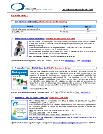 Les Brèves du mois de juin 2012 Quoi de neuf ? Les nouveaux adhérents (validation du CA du 10 mai 2012) Société Artemis Information Management S.A. IL COSMETICS Activité Effectif IT 25 Commerce 190 Forum des Responsables Qualité : Mystery Shopping-12 juillet 2012 Le Mouvement Luxembourgeois pour la Qualité en partenariat avec AUTOPOLIS et TNS ILRES vous invitent au prochain Forum des Responsables Qualité ayant pour thème le Mystery Shopping. Cet événement se déroulera le 12 juillet 2012 à 17h00 dans les locaux d’Autopolis (Zone d'activités Bourmicht - L-8070 BERTRANGE). La présentation théorique sera suivie d’un retour d’expérience, puis d’un forum de discussion et se clôturera par un cocktail de qualité. Les places étant limitées, inscrivez-vous sans plus tarder. Informations et inscriptions : MLQ - Tél.: 42 59 91 - 4580 - E-mail : [email protected] - Web : www.mlq.lu 1 nouvel ouvrage : Bibliothèque Qualité: L’entrepreneur durable Dans ce livre, Vincent Lacolare provoque l'envie de manager l'entreprise, comme un système, en utilisant tous ces leviers. Sans entrer dans le détail des normes et des concepts, il intègre le développement durable et la responsabilité sociétale des entreprises de management opérationnel. Ce livre constitue, en fait, le toit de "l'entreprise durable" construite au fil des livres, avec une vision transverse qui lui donne une véritable portée stratégique et propose une étude de cas qui accompagne le lecteur tout au long des différentes étapes aboutissant à la naissance de l'entrepreneur moderne et durable qui seul pourra faire face aux défis du XXIe siècle. Edition décembre 2011. Pour emprunter cet ouvrage, contactez-nous : MLQ -Tél.: +352 545.580.582 – E-mail : [email protected] Formation Lean Six Sigma Green Belt: du 04 au 07 juin 2012 Opex Management en partenariat avec MLQ a décidé de promouvoir l’approche méthodologique LEAN SIX SIGMA. Cette méthode est devenue un standard incontournable pour améliorer la performance de l’entreprise, garantir le succès des initiatives d’amélioration continue et obtenir des résultats tangibles. Date : Du 04 au 07 juin 2012: tous les jours de 8:30 à 17:30 Prix sans certification : 1.980 € HTVA Prix avec certification de la British Quality Foundation: 2.250 € HTVA Les adhérents du Mouvement Luxembourgeois pour la Qualité bénéficient d’un tarif préférentiel de 20%. Informations et inscriptions : OpEx Management : [email protected] Tél.:621 22 11 98 1 Les Brèves du mois de juin 2012 Présentation de la norme ISO 50001: Un référentiel énergétique : 27 juin 2012 AIB-Vinçotte Luxembourg vous invite à un événement portant sur La norme mondiale ISO 50001 «Systèmes de management de l’énergie – exigences et recommandations de mise en œuvre » .Cette nouvelle norme ISO 50001 est un outil performant pour aider les organisations à réduire la consommation et les coûts de l’énergie. Date : 27 juin 2012 à partir de 16h00 Prix : Participation gratuite avec inscription préalable. Programme : Accueil des participants / Management de l’énergie et ISO 50001/ Les services d’AIB-Vinçotte Luxembourg / Questions – Réponses/ Mot de clôture / Cocktail. Informations et inscriptions : Christophe EISCHEN- 48 18 58 40 ou 691 48 18 40 [email protected] Formation : Managez la Qualité de vos formations: 07 juin 2012 Dans le domaine de la formation professionnelle, les acteurs se basent sur des processus d'ingénierie de formation qui ont fait leurs preuves. La réflexion sur ces processus et la façon de les améliorer sur base de normes et de labels existants n'est cependant pas à l'ordre du jour de nombreuses sociétés. But : Cette formation a pour objectif de vous aider à réfléchir sur la meilleure façon d'améliorer vos processus de formation en vous aidant à choisir une approche qualité qui correspond à vos besoins. Date : 7 juin 2012 de 08h30 à 12h30 Lieu : CRP Henri Tudor | 29, avenue John F. Kennedy Luxembourg-Kirchberg Prix : 335 € HT Informations et inscriptions : SITec® / Tel : 42 59 91 300/ [email protected] / inscrivez- vous en ligne Présentation du livre blanc « La confiance numérique» : 11 juin 2012 Conscients du rôle incontournable des technologies de l’information et de la communication (TIC) au cœur de l’économie luxembourgeoise, et de l’impact que la confiance des utilisateurs, tant professionnels que privés, peut avoir dans l’utilisation de ces technologies, l’ILNAS et le CRP Henri Tudor ont souhaité analyser en profondeur la problématique de la confiance numérique. Date : 11 juin 2012 de 16h30 à 18h30 Prix : Gratuit Lieu : CRP Henri Tudor | 29, avenue John F. Kennedy Luxembourg-Kirchberg Informations: Aurélie COUVIDAT -Tel : 46 97 46 70/ [email protected]/ inscription en ligne Adaptez votre offre de formation aux besoins du marché: 12 et 13 juin 2012 Les professionnels de la formation doivent sans cesse actualiser leur offre pour accompagner/ guider les entreprises en fonction des composantes de leur environnement (économique, technologique, législative...). L’anticipation des métiers et compétences leur fournit une réponse pour qu’ils puissent concevoir des formations répondant aux besoins du marché. La formation proposée ici leur permettra d’acquérir un outil de prospective qui les aidera à analyser les évolutions des métiers de demain. Date : 12 et 13 juin 2012 de 09h00 à 17h30 Lieu : CRP Henri Tudor | 29, avenue John F. Kennedy Luxembourg-Kirchberg Prix : 865 € HT Informations et inscriptions : SITec® / Tel : 42 59 91 300/ [email protected] / inscrivez- vous en ligne 2 Les Brèves du mois de juin 2012 Bon à savoir Prix de l’innovation de la Fedil 2012 : Appel à candidatures Avec son Prix de l'innovation industrielle, créé en 1982, la Fedil - Business Federation Luxembourg aspire à récompenser des travaux originaux et innovants, issus de la créativité i