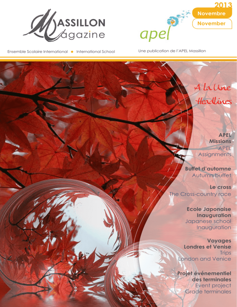 2013 ASSILLON Ensemble Scolaire International • International School Novembre November Une publication de l’APEL Massillon A la Une Headlines APEL Missions APEL Assignments Buffet d’automne Autumn buffet Le cross The Cross-country race Ecole Japonaise Inauguration Japanese school Inauguration Voyages Londres et Venise Trips London and Venice Projet événementiel des terminales Event project Grade terminales Edito Edito Massillon Magazine Directeur de publication Jean-François Vest Coordination et rédaction : Sandrine Laville - Labre Rédaction et corrections : Alexandra Ford-Antignac Armelle Balvay - Perraud Clémence Cojean Thérèse Bonnet La communauté éducative Conception et réalisation : Sandrine Laville - Labre Sommaire Contents Pour nous faire part de vos idées et suggestions : [email protected] L e buffet d’automne du vendredi 4 octobre a été comme chaque année un succès, avec de nombreuses familles amenant des spécialités de leurs pays ou de leurs régions . Egalement traditionnel , le cross de Massillon a vu nos enfants du primaire s’affronter, le jeudi 17 octobre, dans la bonne humeur et le fair-play. Je tiens à remercier les parents qui ont accepté d’être parents relais au primaire et parents délégués au secondaire dans les classes de nos enfants. Dans ce numéro vous découvrirez les portraits des membres du bureau et du conseil d’administration de l’Apel de Massillon, et un rappel des missions de l’association des parents d’élèves. Nous nous devons d’être utiles à l’école que nous avons choisis pour nos enfants. Je vous souhaite un mois plein d’échanges fructueux. Jean-François Vest The autumn buffet on Friday, October 4th was like every year a success, with many families bringing specialties of their countries or their regions. Also traditional, Massillon cross-country race saw our primary school children compete, Thursday, Oct. 17, in good humor and fair play. I want to thank the parents who agreed to be welcome parents at the primary school and delegate parents in the high school in our childrens’classes. In this issue you will find portraits of officers and board members of the Apel of Massillon, and a reminder of the mission of parents’ association. We have to be useful to the school we chose for our children. I wish you a month full of fruitful exchanges. Jean-François Vest 2-3 Edito • Agenda • Bourse aux vêtements Editorial • Agenda • Second hand clothing sale 4-5 Présentation APEL et Conseil d’Administration Presentation of APEL and Board of Directors 6-7 Parents relais et parents délégués Welcome parents and parents class representatives 8-9 Subventions APEL • Buffet d’automne Grants from APEL • Autumn buffet 10 La vie à Massillon Life at Massillon 11 - 13 Cross Cross-country race 14 - 15 La vie à Massillon Life at Massillon 16 - 17 Voyages scolaires, Londres et Venise School trips, London and Venice 18 - 19 Inauguration de l’école japonaise • Initiative des terminales Inauguration of Japanese school • Initiative from the terminales 2 Contour artistique - pinceau - 2pt APEL Agenda jeudi 17 jeudi 7 & vendredi 8 Jeudi 17 Ecole jeudi 28 & vendredi 29 jeudi 12 October 2013 Cross • Cross-country race Novembre 2013 Bourse aux vêtements • Hand clothing sale Couronnes de l’Avent • Advent wreaths Décembre 2013 Marché de Noël • Christmas Market Christmas Market vendredi 13 & samedi 14 Marché créatif • lundi 16 Messe de Noël • Christmas Mass Concert de Noël • Christmas Carol mardi 17 jeudi 6 jeudi 30 jeudi 27 Février 2014 Journée internationale • International Day Carnaval • Primary school costume parade Mars 2014 Bourse aux vêtements Dans un esprit de famille et pour aider les parents (acheteurs et vendeurs), l’APEL organise une bourse aux vêtements 2 fois par an. La bourse aux vêtement d’hiver qui s’est déroulée au foyer du lycée (entrée rue Bansac) vendredi 8 novembre a rencontré un vif succès. Parents et enfants sont venus nombreux faire de bonnes affaires et profiter des prix bas et attractifs. Rappelons que les achats sont ouverts à tous, ce qui permet un rayonnement de L’APEL à l’extérieur de notre établissement. Un grand merci à Valentine Jausions et l’équipe de bénévoles pour l’organisation de l’événement ! Second hand Clothing sale In a familiar atmosphere and to help parents (buyers and sellers), APEL organizes a second hand clothing sale twice a year. The winter second hand clothing sale that was held at the high school foyer (entrance rue Bansac) on Friday, November 8 was a resounding success. Parents and children were numerous to find great deals on great clothes. Let’s remember that the purchases are open to all, allowing APEL to reach outside the school. A great thanks to Valentine Jausions and the team of volunteers for organizing the event! 3 APEL assillon M L E P A l’ e d Les missions Accueillir et encourager la communauté de Massillon à participer à la vie de l’école en participant à des événements et activités. Informer les parents, élèves et communauté éducative des activités de l’Apel / actions par l’intermé diaire d’un magazine numérique. Apporter une aide financière et logistique aux projets de classe, au Conseil de Vie Lycéenne (CVL) et aux projets de Pastorale. 3 mots représentent l’APEL Massillon : Richesse, Accueil et Partage. Nous sommes heureux de vous présenter les parents bénévoles qui ont un rôle actif au sein de l’APEL. D’autres parents s’investissent également de manière régulière ou occasionnelle. Bienvenue à l’APEL Massillon ! Sylvie Jourdet Jean-François Vest Vice-Présidente Parents correspondants Parent class representatives Président Isabelle Carnesechi Dorothée Vialle Secrétaire Secretary Secrétaire adjointe Assistant seretary Anne-Sophie Blanchet Brigitte Dufour Trésorière adjointe Assistant treasurer Trésorière treasurer Welc