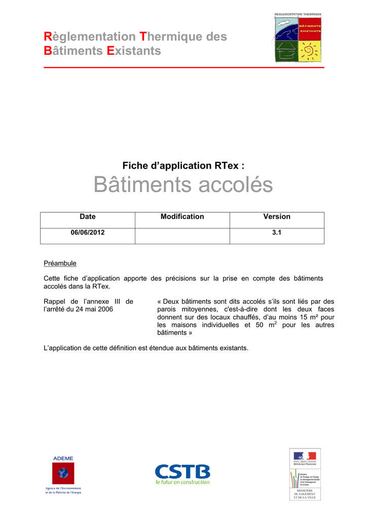 Règlementation Thermique des Bâtiments Existants Fiche d’application RTex : Bâtiments accolés Date Modification 06/06/2012 Version 3.1 Préambule Cette fiche d’application apporte des précisions sur la prise en compte des bâtiments accolés dans la RTex. Rappel de l’annexe III de l’arrêté du 24 mai 2006 « Deux bâtiments sont dits accolés s’ils sont liés par des parois mitoyennes, c'est-à-dire dont les deux faces donnent sur des locaux chauffés, d’au moins 15 m² pour les maisons individuelles et 50 m2 pour les autres bâtiments » L’application de cette définition est étendue aux bâtiments existants. Règlementation Thermique des Bâtiments Existants PRECISIONS SUR LES PAROIS MITOYENNES ENTRE DEUX BÂTIMENTS On considère que des parois sont mitoyennes entre deux bâtiments si leurs deux faces donnent sur des locaux chauffés. Ces parois peuvent être aussi bien verticales qu’horizontales. Les surfaces sont calculées selon le fascicule 1 chapitre II des règles Th-U. EST-IL POSSIBLE DE FAIRE UN CALCUL GLOBAL POUR DES BÂTIMENTS ACCOLÉS ? Oui à condition qu’ils soient accolés selon la définition citée plus haut et qu’ils appartiennent à des catégories qui permettent de faire un calcul global (voir plus bas). COMMENT PROCÉDER ? Tout d’abord il faut : vérifier que les bâtiments sont bien accolés au sens de l’arrêté du 24 Mai 2006. Un ensemble de bâtiments (plus que 2) sont accolés s’ils le sont deux à deux c’est-à-dire que chaque bâtiment doit être mitoyen avec l’autre bâtiment par une paroi d’au moins 15m² pour les maisons individuelles et de 50m² pour les autres bâtiments dont les deux faces donnent sur des locaux chauffés.et ce quel que soit l’usage des bâtiments mitoyens. En présence d’un joint de dilatation permettant une circulation d'air traversante entre les deux bâtiments, ceux-ci ne peuvent pas être considérés comme mitoyens. Dans le cas où il n'y a pas de circulation d'air entre les deux bâtiments, cas du joint de dilatation complètement fermé et bien isolé de l'extérieur, on considére les bâtiments mitoyens. identifier la catégorie de chacun des bâtiments car certains bâtiments même accolés ne peuvent faire l’objet d’un calcul global si leurs catégories respectives ne le permettent pas. La liste qui suit répertorie les cas où il est impossible de faire un calcul global. Pour l’accolement d’un bâtiment A et d’un bâtiment B. Règlementation Thermique des Bâtiments Existants Catégorie1 (Bâtiment A) Bâtiments d’habitation Catégorie 2 (Bâtiment B) Pourquoi le calcul global est il impossible ? Tout bâtiment de catégorie autre que bâtiments d’habitation Différence entre la catégorie 1 et la catégorie 2 pour : - garde fou sur le Ubat (article 44) Tableau n° 1 - Cas d’interdiction de calcul global en fonction des catégories de bâtiments Choix du volet de la RT existants pour les bâtiments accolés : 1. Cas de deux bâtiments accolés, chacun étant rénové et soumis séparément à la RT élément par élément parce que leur surface est inférieure à 1000 m² et qui, accolés, représentent alors une surface totale supérieure à 1000m² : - s’il y a deux maître d’ouvrage, le volet élément par élément s’applique, - s’il y a un seul maîtres d’ouvrage, on laisse le choix du volet. 2. Cas de deux bâtiments accolés, chacun étant rénové et soumis séparément à la RT globale : - le volet global s’applique, 3. Cas de deux bâtiments accolés, chacun étant rénové et séparément l’un soumis à la RT élément par élément, l’autre soumis au volet global : - pour le bâtiment soumis séparément au volet élément par élément on laisse le choix du volet. 4. Cas de deux bâtiments accolés, chacun faisant l’objet d’une demande de label : - s’il y a deux maître d’ouvrage, il faut faire deux demandes de label, s’il y a un seul maîtres d’ouvrage, il est possible de faire une ou deux demandes de label. Pour qu’une maison individuelle soit accolée avec un bâtiment autre qu’une maison individuelle, chaque bâtiment doit être mitoyen avec l’autre bâtiment par une paroi d’au moins 15m². Règlementation Thermique des Bâtiments Existants Schéma explicatif pour la prise en compte des bâtiments accolés dans le calcul de C (autre que les maisons individuelles) : Surface de parois mitoyennes supérieure à 50m² inférieure ou égale à 50m² Une seule catégorie avec usage majoritaire* / bâtiment ? Oui Calcul global possible Un seul calcul pour tous les bâtiments Non Calcul global impossible Un calcul pour chaque bâtiment Schéma n° 1 - Schéma explicatif pour la prise en compte des bâtiments accolés dans le calcul de C (autre que les maisons individuelles) Règlementation Thermique des Bâtiments Existants Exemples d’application : Les exemples respectent les critères de surface de l’annexe III de l’arrêté du 24 mai 2006. Catégorie 1 Catégorie 2 Maison individuelle Maison individuelle Maison individuelle Logements collectifs Bâtiment d’habitation Autre usage Batiment d’habitation autre que Batiment d’habitation Exemples interdit autre que Règlementation Thermique des Bâtiments Existants *Précisions sur la notion de catégorie avec usage majoritaire : L’usage majoritaire s’entend en termes de surface prépondérante utile ou habitable. Zones de Bureaux Zone d’industrie Un bâtiment à usage majoritaire est un bâtiment à deux usages dont l’usage dit minoritaire a une surface inférieure à 150 m² et occupe moins de 10 % de la surface du bâtiment. Le bâtiment ci-dessus est un exemple de bâtiment à usage majoritaire. Il est composé de deux zones : une zone à usage de bureaux et une zone à usage industriel. La perméabilité de ce bâtiment peut être calculée de deux façons : - sa perméabilité est celle d’un bâtiment industriel puisque c’est l’usage majoritair