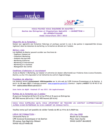 VOUS POUVEZ VOUS INSCRIRE EN MASTER 1 Gestion des Entreprises et Organisations Spécialité : « MARKETING » EN APPRENTISSAGE Année Universitaire 2011-2012 Objectifs de la formation : Donner aux apprentis une formation théorique et pratique ouvrant la voie à des postes à responsabilités (niveau ingénieur) dans les domaines du marketing. La formation se déroule sur 2 années. Métiers visés Les diplômés du Master peuvent accéder aux fonctions de : - Ingénieur Commercial - Consultant Marketing - Analyste des marchés - Marketing d’affaires - Marketing à l’international - Marketing et e-business - Management des ventes Conditions d’admission et recrutement Accès en Master 1 Marketing, sur dossier et entretien (si dossier sélectionné) aux titulaires d’une Licence Economie, Gestion, ou d’un titre équivalent et de l’obtention du contrat d’apprentissage. Procédure de sélection : Les dossiers seront exclusivement téléchargeables sur le site web de l’UFR Sciences Economiques et de Gestion à partir du 15 mars 2011 à l’adresse suivante : www.ecogestion-paris13.fr (Contact : Sophie LAMBERT 01 49 40 37 62 mail : [email protected]) Date limite de dépôt : Vendredi 27 mai 2011 16h impérativement. Rythme de la formation sur 2 années : 2 jours en formation (à Paris 13 et/ou CFA) et 3 jours en Entreprise M1 500 heures (60 ects) // M2 400 heures (60 ects) NOUS VOUS RAPPELONS QU’IL VOUS APPARTIENT DE TROUVER UN CONTRAT D’APPRENTISSAGE AUPRES D’UNE ENTREPRISE OU D’UN CABINET DE CONSULTANTS. Veuillez notez qu’il est possible de valider l’année du M1 au titre de la Maîtrise. LIEUX DE FORMATION : Université Paris 13 UFR Sciences Economiques et de Gestion 99 avenue Jean Baptiste Clément 93430 VILLETANEUSE CFA Sup 2000 Moulin de la Chaussée Place Jean Jaurès 94410 SAINT MAURICE ANNEE UNIVERSITAIRE 2011-2012 PROGRAMME - MASTER 1ère année G.E.O. MARKETING ENSEIGNEMENTS heures ECTS 40 40 20 5 5 2 50 40 30 30 5 5 4 4 30 40 30 40 40 3 5 3 4 5 20 20 30 3 3 4 SEMESTRE 1 (30 ects) UE 1 : L’entreprise et son environnement (12 ects) Modélisations et prévisions L’entreprise à l’international Anglais des affaires UE 2 : Les outils de gestion (18 ects) Méthodes quantitatives de gestion Informatique de gestion Théorie & analyse financière Contrôle de gestion SEMESTRE 2 (30 ects) UE 3 : Marketing (20 ects) Marketing et communication commerciale Études de marché Comportement du consommateur Distribution et force de vente Études de cas marketing (techniques d’enquêtes, traitement et analyse des résultats) UE 4 : Activités de synthèse (10 ects) Jeux marketing d’entreprise Gestion de projet Méthodologie (expression écrite et orale, préparation à la rédaction du rapport d’activité en entreprise et à la soutenance) Fiche mise à jour le 25 février 2011 VOUS POUVEZ VOUS INSCRIRE EN MASTER 2 Gestion des Entreprises et Organisations Spécialité : « MARKETING » EN APPRENTISSAGE Année Universitaire 2011-2012 Objectifs de la formation : Développer les aspects théoriques et pratiques dans le cadre d’une formation professionnalisante. Acquérir et maîtriser les outils approfondis de gestion et acquérir en marketing la capacité d’aide à la décision dans le cadre d’une formation de niveau ingénieur. Métiers visés Les diplômés du Master peuvent accéder aux fonctions de - Ingénieur Commercial - Consultant Marketing - Analyste des marchés - Marketing d’affaires - Marketing à l’international - Marketing et e-business -Management des ventes Conditions d’admission et recrutement Accès en Master 2 Marketing sur dossier et entretien pour les étudiants ayant validé l’année de M1 Marketing ou Commercial ou titulaires d’un titre équivalent, ainsi que l’obtention ou le renouvellement d’un contrat d’apprentissage. Procédure de sélection : Etude du dossier et entretien pour tous les candidats. Les dossiers seront exclusivement téléchargeables sur le site web de l’UFR Sciences Economiques et de Gestion à partir du 15 mars 2011 à l’adresse suivante : www.ecogestion-paris13.fr. (contact : Mme Sophie LAMBERT (01 49 40 37 62 mail : [email protected]) Date limite de dépôt : Vendredi 27 mai 2011. Rythme de la formation : 2 jours en formation (à Paris 13 et/ou CFA) et 3 jours en Entreprise M1 500 heures (60 ects) // M2 400 heures (60 ects) NOUS VOUS RAPPELONS QU’IL VOUS APPARTIENT DE TROUVER UN CONTRAT D’APPRENTISSAGE AUPRES D’UNE ENTREPRISE OU D’UN CABINET DE CONSULTANTS. LIEUX DE FORMATION : Université Paris 13 UFR Sciences Economiques et de Gestion 99 avenue Jean Baptiste Clément 93430 VILLETANEUSE CFA Sup 2000 Moulin de la Chaussée Place Jean Jaurès 94410 SAINT MAURICE ANNEE UNIVERSITAIRE 2011-2012 PROGRAMME - MASTER 2ème année G.E.O. MARKETING ENSEIGNEMENTS HEURES ECTS 30 30 4 4 30 40 40 4 6 5 30 7 30 40 30 40 30 30 5 5 5 5 5 5 Semestre 1 (30 ects) UE 1 : L’entreprise et son environnement (8 ects) Politique générale et stratégie Management à l’international UE 2 : Les outils de gestion (15 ects) Gestion de trésorerie Analyse des données Contrôle de gestion UE 3 : Activités de synthèse (7 ects) Méthodologie (expression écrite et orale, préparation à la rédaction du mémoire de fin d’étude et à la soutenance, aide à la décision) SEMESTRE 2 (30 ects) UE 4 : Marketing Marketing B to B Marketing approfondi Marketing et prospective Marketing à l’international Marketing et e-business Études de cas marketing Fiche mise à jour le 25 février 2011