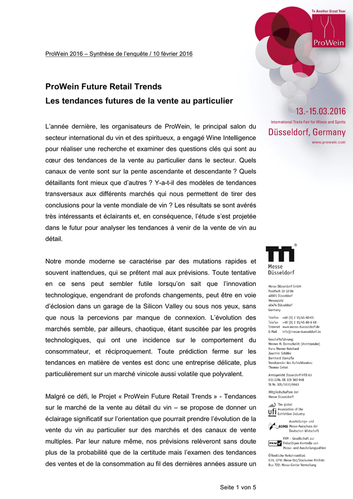 ProWein 2016 – Synthèse de l’enquête / 10 février 2016 ProWein Future Retail Trends Les tendances futures de la vente au particulier L’année dernière, les organisateurs de ProWein, le principal salon du secteur international du vin et des spiritueux, a engagé Wine Intelligence pour réaliser une recherche et examiner des questions clés qui sont au cœur des tendances de la vente au particulier dans le secteur. Quels canaux de vente sont sur la pente ascendante et descendante ? Quels détaillants font mieux que d’autres ? Y-a-t-il des modèles de tendances transversaux aux différents marchés qui nous permettent de tirer des conclusions pour la vente mondiale de vin ? Les résultats se sont avérés très intéressants et éclairants et, en conséquence, l’étude s’est projetée dans le futur pour analyser les tendances à venir de la vente de vin au détail. Notre monde moderne se caractérise par des mutations rapides et souvent inattendues, qui se prêtent mal aux prévisions. Toute tentative en ce sens peut sembler futile lorsqu’on sait que l’innovation technologique, engendrant de profonds changements, peut être en voie d’éclosion dans un garage de la Silicon Valley ou sous nos yeux, sans que nous la percevions par manque de connexion. L’évolution des marchés semble, par ailleurs, chaotique, étant suscitée par les progrès technologiques, qui ont une incidence sur le comportement du consommateur, et réciproquement. Toute prédiction ferme sur les tendances en matière de ventes est donc une entreprise délicate, plus particulièrement sur un marché vinicole aussi volatile que polyvalent. Malgré ce défi, le Projet « ProWein Future Retail Trends » - Tendances sur le marché de la vente au détail du vin – se propose de donner un éclairage significatif sur l’orientation que pourrait prendre l’évolution de la vente du vin au particulier sur des marchés et des canaux de vente multiples. Par leur nature même, nos prévisions relèveront sans doute plus de la probabilité que de la certitude mais l’examen des tendances des ventes et de la consommation au fil des dernières années assure un Seite 1 von 5 niveau de fiabilité de ces prévisions qui peut difficilement être meilleur et c’est la raison pour laquelle, elles devraient être utiles à ceux qui s’intéressent à l’avenir de la vente de vin au détail. Six marchés clés et cinq tendances Le rapport couvre six marchés clés, choisis pour leur diversité géographique et culturelle, ainsi que leur taille non négligeable. Conjugués, ces six marchés constituent un échantillon croisé du marché mondial du vin. Nous avons analysé des interviews du secteur par des experts américains (le plus grand marché du vin), allemands et britanniques (qui occupent respectivement la 1ère et 2ème place en matière d’importations de vin), la France ensuite (dont le marché est en déclin tout en pouvant se vanter d’être n° 1 en consommation par tête d’habitant), le Japon (où les volumes n’ont cessé d’augmenter les dernières années) et l’Australie (un grand marché et un producteur crucial du Nouveau Monde). Plusieurs tendances observables les dernières années sont toujours prédominantes et aideront probablement à configurer l’avenir de la vente de vin au détail. Nous mentionnerons à cet égard l’ascension inexorable de la vente en ligne qui en est indubitablement l’élément le plus marquant. En effet, dans tous les marchés étudiés, à des degrés variables, la vente en ligne aura une incidence significative sur l’avenir du commerce et le comportement du consommateur. Tendance 1 : Les ventes en ligne ne cessent de grimper Ce qui peut être plus intéressant concernant cette tendance du commerce en ligne est sa fluidité, qui dicte de plus en plus la vitalité des modèles économiques des canaux de vente plus traditionnels tout en étant un canal de vente en soi. Bien que le commerce en ligne sera important pour le modèle traditionnel et en tant que modèle indépendant, c’est sans doute dans le premier cas de figure que son influence sera plus perceptible sur l’environnement de la vente au détail de vin et le comportement du consommateur, comme le démontre le succès du « click & collect » ou du « drive », en France, qu’adoptent de plus en plus les super- et hypermarchés en France. Seite 2 von 5 Tendance 2 : Le modèle traditionnel se défend Si le commerce en ligne s’affirme universellement, la singularité des environnements locaux de vente au particulier et des habitudes des consommateurs dans différentes cultures indique que d’autres tendances seront propres à des marchés précis. Sur la plupart des marchés, les supermarchés sont coincés entre des pressions venant d’en haut, des consommateurs, qui interviennent de plus en plus, et d’en bas, des discounters. Ils essaient tant bien que mal de faire naviguer leur stratégie entre ces deux pressions. Leur démarche stratégique relèvera sans doute plus de l’expérimentation, du « à tâtons », à l’avenir. Tendance 3 : Les indépendants surfent sur la vague de la personnalisation et de l’engagement Au RU, en Australie, en Allemagne et en France, le succès des indépendants, souvent présents sur les marchés de niche ou optant pour des modèles économiques alternatifs, révèle la réaction au caractère impersonnel de la vente de masse et en ligne. Cette évolution sera intéressante à suivre à l’avenir dans ces pays, mais ce sera sans doute moins le cas dans des pays comme le Japon où les magasins de proximité conservent leur mainmise et freine toute envie du consommateur d’un contact plus direct. Tendance 4 : Le magasin de proximité demeure crucial La force du magasin de proximité jouera un rôle majeur sur ce marché, notamment au RU, en France et aux États-Unis, et cette tendance corrobore celle observée l’année dernière, à savoir le glis