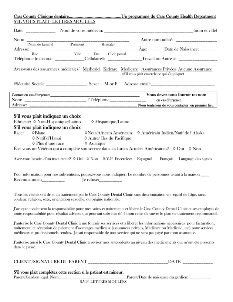 Cass County Clinique dentaire………………………………………..Un programme du Cass County Health Department S’IL VOUS PLAÎT- LETTRES MOULÉES Date: _____________ Nom de votre médecin: _______________________________________(nom et ville) Nom: _____________________________________________ (Nom de famille) (Prénom) Autre nom utilisé: __________________ (Initiale) Adresse: ______________________________________________ Âge: _____ Date de Naissance:________ Rue Ville État Code postal Téléphone (maison#: _____________Cellulaire#: _______________Travail ou Autre #: _________________ Avez-vous des assurances médicales? Medicaid Kidcare Medicare Assurances Privées Aucune Assurance (S’il vous plaît encerclé ce qui s’applique) #Sécurité Sociale __________________ Sexe: M or F Adresse email:____________________________ Contact en cas d’urgence:_______________________________________ Vous devez nous fournir un nom Nom: ___________________________ #Téléphone________________ en cas d’urgence. Adresse: _______________________________________________ Nous tenterons de vous contacter en premier lieu S’il vous plaît indiquez un choix Ethnicité: ◊ Non-Hispanique/Latino ◊ Hispanique/Latino S’il vous plaît indiquez un choix Race: ◊Blanc ◊Noir/Africain Américain ◊ Américain Indien/Natif de l’Alaska ◊ Natif d’Hawai ◊ Autre/ Iles du Pacifique ◊ Plus d’une race ◊ Asiatique Êtes vous un Vétéran qui a complété son service dans les forces Armées Américaines? ◊ Oui ◊ Non Avez-vous besoin d’un traducteur? ◊ Oui ◊ Non S.V.P. Encerclez: Espagnol Français Language des signes Pour information pour nos subventions, pouvez-vous nous indiquer: Le nombre de personnes vivant à la maison ____ Revenu annuel:__________ Je refuse:__________ Tous les clients ont droit au traitement par le Cass County Dental Clinic sans discrimination en regard de l’âge, race, couleur, religion, sexe, orientation sexuelle, ou origine nationale. J’accepte totalement la responsabilité pour mes soins et traitements et libère le Cass County Dental Clinic et ses employés de toute responsabilité pour résultat adverse qui pourrait subvenir dû à mon refus de suivre le plan de traitement recommandé. J’autorise le Cass County Dental Clinic à me fournir ses services et à libérer les informations nécessaires pour facturation, traitement, et réception de paiement d’avantages médicaux (assurances privées, Medicare ou Medicaid, etc) pour services médicaux et professionnels rendus. Je sui responsable de tout service qui ne sera pas payé par mon assurance. J’autorise aussi le Cass County Dental Clinic à réviser mes antécédents au niveau des médicaments qui m’ont été prescrits dans le passé. CLIENT /SIGNATURE DU PARENT ___________________________________DATE _____________ S’il vous plaît complétez cette section si le patient est mineur. Parent/Gardien légal Nom:________________________________Parent/Date de naissance du gardien:___________ S.V.P. LETTRES MOULÉES Histoire médicale Date:____________ NOM DU PATIENT:_______________________________ DATE DE NAISSANCE:__________________ Bien que le personnel dentaire traite principalement la région intérieure et autour de la bouche, votre bouche est une partie de votre corps. Les problèmes de santé que vous pouvez avoir, ou les médicaments que vous prenez, peuvent avoir une relation importante avec les services dentaires que vous allez recevoir. Merci de répondre aux questions suivantes. Êtes-vous sous les soins d’un médecin présentement? ◊ Oui Avez-vous déjà été hospitalisé ou avez-vous eu des chirurgies majeures? ◊ Oui ◊ Non Si oui, s.v.p. expliquez:________________________ ◊ Non Si oui, s.v.p. expliquez:________________________ Avez-vous déjà subi de sérieuses blessures à la tête ou au cou? ◊ Oui ◊ Non Si oui, s.v.p. expliquez:________________________ Prenez-vous des médicaments? ◊ Non Si oui, sv.p. lesquels: __________________________ ◊ Oui ____________________________________________________________________________________________________________ Prenez-vous, ou avez-vous déjà pris du Phen-Fen, Redux? ◊ Oui ◊ Non Prenez-vous, ou avez-vous déjà pris du, Fosamax, Boniva, Actonel ou toute autre médication contenant du bisphosphonate? Oui ◊ Non Suivez-vous une diète alimentaire spéciale? ◊ Oui ◊ Non Faites-vous usage de tabac? ◊ Oui ◊ Non Utilisez-vous des substances contrôlées? ◊ Oui ◊ Non ◊ Femmes, Êtes-vous: Enceinte/Essayez de devenir enceinte ◊ Oui ◊ Non - Prenez-vous des contraceptif oraux ◊ Oui ◊ Non - Allaitement ◊ Oui ◊ Non Êtes-vous allergique à l’un de ces médicaments?: ◊Aspirine ◊Pénicilline ◊Codéine ◊Acrylique ◊Métal ◊Latex ◊Anesthésie locale ◊Autre-Si oui, s.v.p. expliquez:________________________________________________________________ ◊Aucune allergie connue Avez-vous, ou avgez-vous eu dans le passé, l’une des conditions suivantes: SIDA/VIH Positif ◊ Oui Médicament cortisone ◊ Oui Hémophilie ◊ Oui Traitement de radiation ◊ Oui Maladie d”Alzheimer ◊ Oui Diabète ◊ Oui Hépatite A ◊ Oui Perte de poids récente ◊ Oui Anaphylaxie ◊ Oui Dépendance aux drogues ◊ Oui Hépatite B ou C ◊ Oui Dialyse rénale ◊ Oui Anémie ◊ Oui Facilement essouflé ◊ Oui Herpès ◊ Oui Fièvre rhumastismale ◊ Oui Angine ◊ Oui Emphysème ◊ Oui Haute tension artérielle◊ Oui Rhumatisme ◊ Oui Arthrite/Goutte ◊ Oui Épilepsie ou Convulsions ◊ Oui Cholestérol élevé ◊ Oui Valve artificielle au coeur ◊ Oui Saignement excessif ◊ Oui Urticaire ou rougeur ◊ Oui Zona ◊ Oui Joint artificiel ◊ Oui Soif excessive ◊ Oui Hypoglycémie ◊ Oui Asthme ◊ Oui Pertes de connaissance/Étourdissements◊Oui Battements irréguliers (Coeur) ◊ Oui ◊ Oui Fièvre scarlatine Maladie cellule de faucille ◊ Oui Problème de sinus ◊ Oui Maladie du s