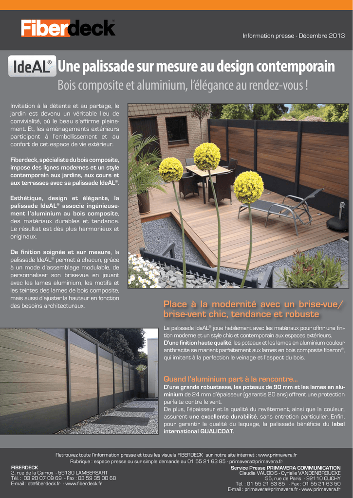 Information presse - Décembre 2013 Une palissade sur mesure au design contemporain Bois composite et aluminium, l’élégance au rendez-vous ! Invitation à la détente et au partage, le jardin est devenu un véritable lieu de convivialité, où le beau s’affirme pleinement. Et, les aménagements extérieurs participent à l’embellissement et au confort de cet espace de vie extérieur. Fiberdeck, spécialiste du bois composite, impose des lignes modernes et un style contemporain aux jardins, aux cours et aux terrasses avec sa palissade IdeAL®. Esthétique, design et élégante, la palissade IdeAL® associe ingénieusement l’aluminium au bois composite, des matériaux durables et tendance. Le résultat est dès plus harmonieux et originaux. De finition soignée et sur mesure, la palissade IdeAL® permet à chacun, grâce à un mode d’assemblage modulable, de personnaliser son brise-vue en jouant avec les lames aluminium, les motifs et les teintes des lames de bois composite, mais aussi d’ajuster la hauteur en fonction des besoins architecturaux. Place à la modernité avec un brise-vue/ brise-vent chic, tendance et robuste La palissade IdeAL® joue habilement avec les matériaux pour offrir une finition moderne et un style chic et contemporain aux espaces extérieurs. D’une finition haute qualité, les poteaux et les lames en aluminium couleur anthracite se marient parfaitement aux lames en bois composite fiberon®, qui imitent à la perfection le veinage et l’aspect du bois. Quand l’aluminium part à la rencontre... D’une grande robustesse, les poteaux de 90 mm et les lames en aluminium de 24 mm d’épaisseur (garantis 20 ans) offrent une protection parfaite contre le vent. De plus, l’épaisseur et la qualité du revêtement, ainsi que la couleur, assurent une excellente durabilité, sans entretien particulier. Enfin, pour garantir la qualité du laquage, la palissade bénéficie du label international QUALICOAT. Retrouvez toute l’information presse et tous les visuels FIBERDECK sur notre site internet : www.primavera.fr Rubrique : espace presse ou sur simple demande au 01 55 21 63 85 - [email protected] FIBERDECK Service Presse PRIMAVERA COMMUNICATION 2, rue de la Carnoy - 59130 LAMBERSART Claudia VAUDOIS - Cyrielle VANDENBROUCKE Tél. : 03 20 07 09 69 - Fax : 03 59 35 00 68 55, rue de Paris - 92110 CLICHY E-mail : [email protected] - www.fiberdeck.fr Tél. : 01 55 21 63 85 - Fax : 01 55 21 63 50 E-mail : [email protected] - www.primavera.fr ... Du bois composite Avec l’apparence du bois et les qualités mécaniques des matériaux polymères en milieu humide, les lames en boiss composite fiberon® (Horizon et Professional) contribuent à la préservation des forêts tropicales et de l’environnement. Imputrescibles, elles sont réalisées à partir de : - 50 % de fibres d’érable (déchets de scieries finement broyés et séchés), une essence qui ne contient pas de tanin, ce qui permet une meilleure stabilité de la couleur, - 50 % de polyéthylène haute densité recyclé. Cette forte teneur en polyéthylène HD limite les variations dimensionnelles du bois. 100 % recyclable, le bois composite fiberon® ne contient pas de produit chimique toxique et ne dégage pas de formaldéhyde. Les lames en bois composite fiberon® résistent naturellement, sans traitement, aux attaques d’insectes et de termites, ainsi qu’aux conditions climatiques (variations de températures, rayons UV ...), ce qui assure une cloison de jardin solide et durable, et permet d’envisager l’implantation d’une palissade végétale. Un concept modulable Sur mesure, la palissade IdeAL® est personnalisable suivant les motifs et les teintes des lames fiberon® proposées, le nombre de lames aluminium et de bois composite, et la hauteur désirée (0,6 m à 2,2 m). Ainsi, elle peut se fixer sur un muret ou s’installer en terre comme une clôture ou un brisevent. La palissade IdeAL® offre le choix parmi les lames en bois composite : fiberon® Horizon : cette nouvelle génération de lames conserve durablement sa couleur et résiste à la décoloration pendant 25 ans grâce au procédé révolutionnaire Permatech® (revêtement protecteur). Elles offrent un rendu magnifique grâce à une pigmentation aléatoire. Le bois exotique et son veinage sont parfaitement imités. Elles sont proposées en teintes Rosewood, Ipé, Brique, Ardoise, et en teintes multichromatiques Castle, un gris ancien, et Tudor, un marron cuivré. fiberon® Professional : avec un profil microrainuré, ces lames en bois composite présentent un aspect brossé, une couleur soutenue et intense, ainsi qu’un décor imitant parfaitement le bois. Disponibles en 3 coloris : gris, beige et brun. Facile à mettre œuvre Les poteaux se fixent soit en terre, sur une dalle béton, soit sur une terrasse, à l’aide de platine de fixation, ou sur un muret. Une fois le premier poteau scellé, il faut insérer les lames dans la feuillure du poteau, les glisser jusqu’au sol puis positionner et régler le 2eme poteau. Ensuite, il suffit de continuer la progression lames/poteaux sur la longueur désirée. Les lames composites fiberon® sont assemblées entre elles avec des languettes de jonction. En option, il est proposé un pied de poteau (inox ou aluminium), un chapeau de poteau aluminium et une porte aluminium. 1 3 Palissade IdeAL® : (1) Lame de finition en aluminium 24 x 100 mm - L : 180 cm (2) Lame en aluminium de 24 x 100 mm – L : 180 cm (3) Profil U en aluminium de 120 cm - 180 cm - 200 cm - 220 cm (4) Poteau en aluminium 90 x 90 mm - 120 cm - 180 cm - 200 cm - 220 cm Pied de poteau en inox L : 60 cm - ø : 60 mm Pied de poteau en aluminium L : 150 cm - ø : 60 mm Chapeau de poteau en aluminium 90 x 90 mm Languette de jonction L : 178 cm Porte Aluminium H : 180 cm - L : 100 cm Set de vis spécial inox autoforantes (5) Lames en bois composite fiberon® Prix public indicatif le m/linéaire : xx euros TTC Points de ve