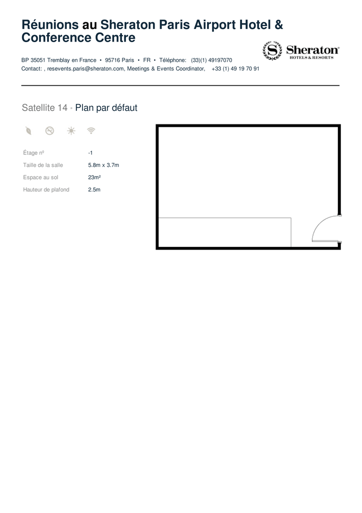 Réunions au Sheraton Paris Airport Hotel & Conference Centre BP 35051 Tremblay en France • 95716 Paris • FR • Téléphone: (33)(1) 49197070 Contact: , [email protected], Meetings & Events Coordinator, +33 (1) 49 19 70 91 Satellite 14 • Plan par défaut Étage nº -1 Taille de la salle 5.8m x 3.7m Espace au sol 23m² Hauteur de plafond 2.5m