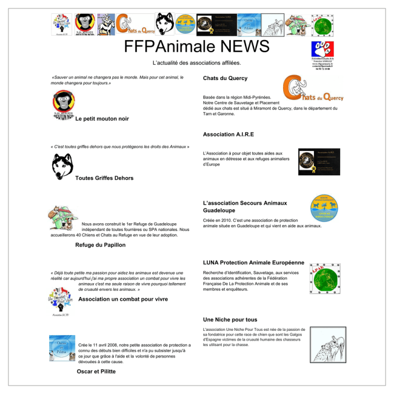 FFPAnimale NEWS L’actualité des associations affilées. «Sauver un animal ne changera pas le monde. Mais pour cet animal, le monde changera pour toujours.» Chats du Quercy Basée dans la région Midi-Pyrénées. Notre Centre de Sauvetage et Placement dédié aux chats est situé à Miramont de Quercy, dans le département du Tarn et Garonne. Le petit mouton noir Association A.I.R.E « C'est toutes griffes dehors que nous protégeons les droits des Animaux » L’Association à pour objet toutes aides aux animaux en détresse et aux refuges animaliers d’Europe Toutes Griffes Dehors L’association Secours Animaux Guadeloupe Nous avons construit le 1er Refuge de Guadeloupe indépendant de toutes fourrières ou SPA nationales. Nous accueillerons 40 Chiens et Chats au Refuge en vue de leur adoption. Créée en 2010. C’est une association de protection animale située en Guadeloupe et qui vient en aide aux animaux. Refuge du Papillon LUNA Protection Animale Européenne « Déjà toute petite ma passion pour aidez les animaux est devenue une réalité car aujourd'hui j'ai ma propre association un combat pour vivre les animaux c'est ma seule raison de vivre pourquoi tellement de cruauté envers les animaux. » Recherche d’Identification, Sauvetage, aux services des associations adhérentes de la Fédération Française De La Protection Animale et de ses membres et enquêteurs. Association un combat pour vivre Une Niche pour tous Crée le 11 avril 2008, notre petite association de protection a connu des débuts bien difficiles et n'a pu subsister jusqu'à ce jour que grâce à l'aide et la volonté de personnes dévouées à cette cause. Oscar et Pilitte L'association Une Niche Pour Tous est née de la passion de sa fondatrice pour cette race de chien que sont les Galgos d'Espagne victimes de la cruauté humaine des chasseurs les utilisant pour la chasse. FFPAnimale NEWS L’actualité des associations affilées. Cette fédération gérée de manière désintéressée, à pour but toutes actions qui contribuent à la protection, le sauvetage, la lutte contre la maltraitance sous toutes ses formes, l’application, le respect des lois en vigueur et leurs mises à jour selon les besoins du terrain tant pour les animaux domestiques que sauvages. La plus belle des récompenses est celle de voir un animal heureux et en pleine santé Président de la Fédération Française de la Protection Animale. http://www.ffpanimale.fr/ FFPAnimale News n° 1 Avril 2015. - Toutes Griffes Dehors - Le petit mouton noir va à l’école - Chats du Quercy - Une Niche Pour Tous FFPAnimale NEWS L’actualité des associations affilées. Communiqué de presse du 23 octobre 2014. Ses projets. Une Jeune association de protection Animale Saumuroise. L'association à plusieurs projets en cours d'élaboration, tel que, créer et entretenir des relations cordiales et amicales avec d'autres associations œuvrant dans la protection Animale et environnementale dans toute la région des Pays de la Loire. Ce projet ambitieux a pour but d'améliorer la condition et la cause Animale. Crée le 27 février 2014, L'association « Toutes Griffes Dehors » est une association dont les statuts sont disponibles en sous-préfecture de Saumur. Sont but est de : lutter contre la maltraitance et la cruauté Animale. Les membres-fondateurs sont composés d'anciens soigneurs animalier et d'actuels ou anciens bénévoles œuvrant dans la protection animale. Son siège social est également établi à Saumur. Une association à bureau collégial. Les membres-fondateurs de l'association ont opté pour un statut, loi 1901 à bureau collégial, privilégiant ainsi la rapidité des prises de décision du collège et de ses mises en application et diminuant les lourdeurs protocolaires d'une association à structure « classique ». Coordonner les publications d’avis de recherche, enquêtes, interventions et sauvetages d’animaux en péril ou en états de négligences voire, de maltraitance. Ou encore, la création d'une structure d'aide alimentaire aux bénéfices des Animaux de particuliers ayant des difficultés financières pour subvenir à leurs besoins. En collaboration avec des professionnels. Un titre percutant. L'association a choisi comme titre « Toutes Griffes Dehors », qui reflète parfaitement l'attitude des membres de l'association, qui s'attèlent à défendre les droits des animaux, partout ou cela doit être fait. Le crédo de l'association : « C'est toutes griffes dehors que nous protégeons les droits des Animaux » avertit d'emblée, la persévérance de l'association à mener à bien la mission dont elle s'est investie. Dans le but de mener son action dans les meilleures conditions, l'association recherche des professionnels et intervenants tels que : vétérinaires, comportementalistes, éducateurs, mais aussi des bénévoles, adhérents, donateurs, familles d'accueil, particuliers ou entreprises, contacts presse... Toutes aides permettant la poursuite de son objet, étant la bienvenue. Une association adhérente de la Fédération Française de la Protection Animale. L'association « Toutes Griffes Dehors » est une association adhérente de la Fédération Française de la Protection Animale. Par conséquent, Antenne des Pays de la Loire. « Nous avons choisi de rejoindre la Fédération, car nous constatons, à l'instar de la Fédération, que la protection Animale en France, souffre d'un manque évident de coordination et de communication entre les différents acteurs de la défense des droits des Animaux. Adhérer à la Fédération nous permet entre autre de bénéficier de son réseau de communications via internet, et nous accorde plus de crédit dans nos actions. Nous avons par ailleurs, la volonté de nous investir dans le développement de la Fédération, à proprement parler. Précise Monsieur Arnaud Guillon, membre administrateur de l'association « Toutes Griffes dehors ». http://toutesgriffesdehors.