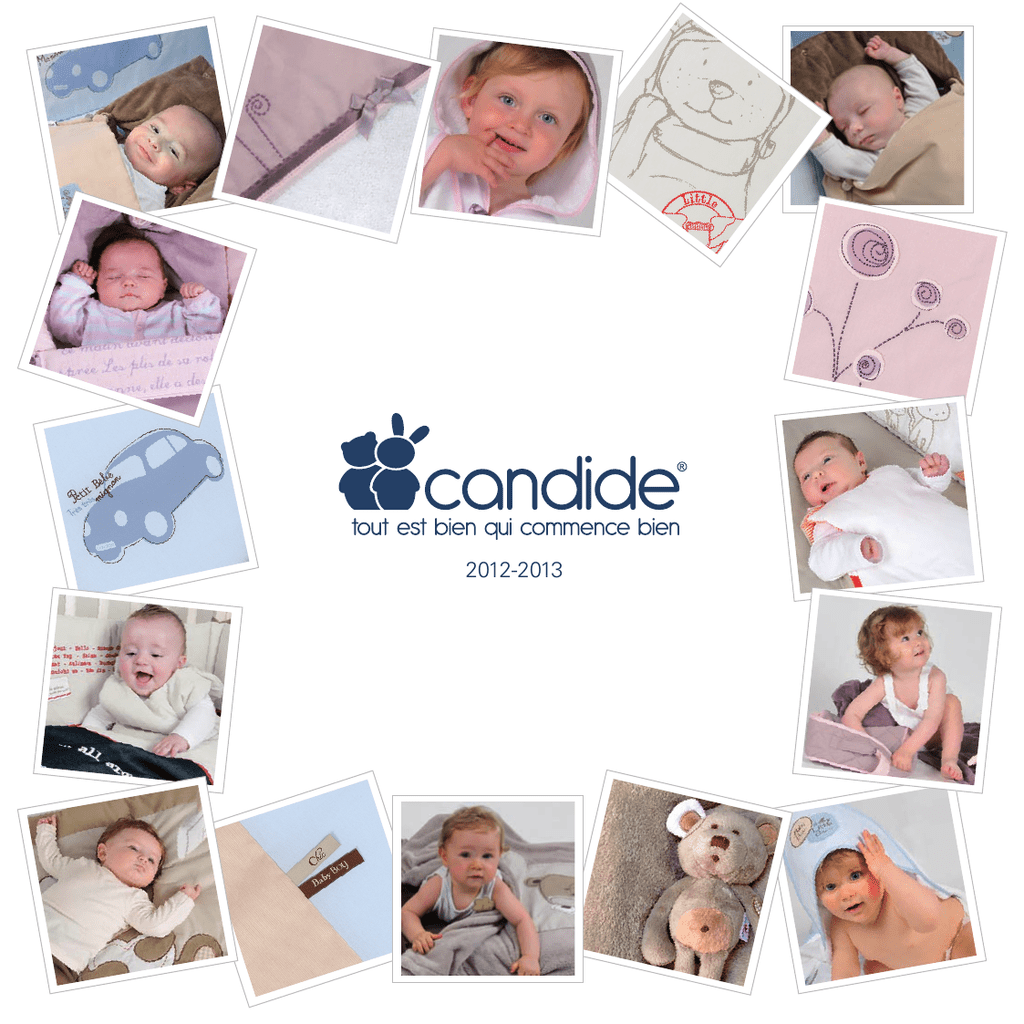 2012-2013 ‘‘ Parce que vous recherchez ce qu’il y a de meilleur pour votre bébé, Candide travaille depuis plus de 25 ans à mettre au point des produits de qualité au plus proche des attentes des jeunes parents.Tous nos produits sont créés, développés et fabriqués par Candide. Nous suivons donc toutes les étapes de leur développement pour en assurer la qualité. Vous trouverez dans ce guide tous les produits indispensables pour préparer l’arrivée de votre tout petit. Notre gamme Matelas d’abord : fabriquée en France, elle a fait l’objet de nombreuses recherches pour assurer un confort optimal aux tout-petits. Textile de chambre, sac à langer… ‘‘ À découvrir également, notre produit exclusif, mis au point par Candide pour vous et votre bébé : Le MULTIRELAX +, le 1er coussin de maternité transformable en position relax pour bébé, un produit intelligent créé par des mamans pour des mamans. Enfin pour votre sérénité, Candide à mis au point une gamme Experte, composée de produits techniques, issus d’une expertise de professionnels sur le bien-être et le confort des nouveaux-nés. Sommaire 3 La Chambre 15 Le Confort 19 Le Voyage 23 La Toilette 25 Le Sommeil 31 La Gamme Experte 36 Liste de naissance 2 La Chambre Q préparer un nid douillet. C’est toujours dans cet esprit de douceur et de uel bonheur de décorer la chambre de bébé : choisir de jolies couleurs et lui modernité que Candide crée ses collections. Ambiance traditionnelle ou plus colorée, chaque thème raconte une histoire différente autour du linge de lit et des produits coordonnés pour que bébé fasse de jolis rêves. 3 2 Dandy 9 11 7 6 4 1 10 4 8 Petit Dandy 3 5 12 13 14 1 5 9 13 Nid d’ange 173590 2 Douillette naissance 103590 3 Douillette réglable 113590 4 Tour de lit 133590 Couvre lit 143590 6 Matelas à langer 153590 7 Sortie de bain 183590 8 Fauteuil club 163590 Décors muraux 293590 10 Tapis 373590 11 Trousse de toilette 403590 12 Poncho de bain 183591 Protège carnet de santé 293591 14 Coussin de chaise 193590 Ciel de lit/Rideaux 223590 5 3 9 12 13 6 7 4 1 2 5 16 8 10 6 Poème 18 11 19 17 14 20 15 1 Nid d’ange 173360 2 Douillette naissance 103360 3 Douillette réglable 113360 4 Tour de lit 133360 / 133361 5 Couvre lit 143360 6 Matelas à langer 153360 7 Sortie de bain 183361 8 Fauteuil club 163360 9 Décors muraux 293360 10 Tapis 373360 11 Couffin souple 253360 12 Trousse de toilette 403360 13 Mobile musical 333360 14 Poncho de bain 183362 15 Poupée Louise 313360 16 Sac week-end 243360 17 Panière tissu 403362 18 Protège carnet de santé 293361 19 Valisette + plaid 413364 20 Tapis d’éveil 373362 Coussin de chaise 193360 Ciel de lit/Rideaux 223361 9 6 1 8 2 8 Paris 3 5 4 7 10 1 Nid d’ange 173350 2 Douillette naissance 103350 3 Douillette réglable 113350 4 Tour de lit 133350 5 Couvre lit 143351 6 Matelas à langer 153350 7 Sortie de bain 183350 8 Fauteuil club 163350 9 Décors muraux 293350 10 Tapis 373350 Ciel de lit/Rideaux 223351 8 5 8 2 6 1 4 7 1 10 Little Aviator 5 3 6 1 Douillette naissance 102801 2 Douillette réglable 112801 3 Tour de lit 132801 4 Plaid 142801 5 Matelas à langer 152802 6 Sortie de bain 182801 7 Fauteuil club 162800 8 Décors muraux 292800 Ciel de lit/Rideaux 222805 3 13 9 14 6 7 4 1 8 10 12 Bébé Tradition 9 12 19 17 15 2 18 11 16 5 1 Nid d’ange 172741 2 Douillette naissance 102741 3 Douillette réglable 112742 4 Tour de lit 132740 5 Plaid 142742 6 Matelas à langer 152743 7 Sortie de bain 182741 8 Fauteuil club 162742 9 Décors muraux 292740 10 Tapis 372740 11 Couffin souple 252742 12 Range malin 292741 13 Mobile musical 332740 14 2 corbeilles 402741 15 Plaidou 142743 16 Tapis d’éveil 372741 17 Protège carnet de santé 292742 18 Poncho de bain 182742 19 Ourson Basile 312740 Coussin de chaise 192740 Ciel de lit/ Rideaux 222743 Mobilier Stockholm Les meubles Stockholm sont vendus avec des poignées blanches. Chaque pièce est personnalisable avec le lot de poignées assorties au linge de lit. 2 Photos présentées assorties à la collection BB Tradition. 170 cm 1 91 cm .8 3 12 66 95 c cm m 52 cm Option : lot de 3 poignées cm 5 6 7 3 Plan à langer 3 55 x 10 x 73 cm 4 91 cm Option : 1 plaque décorative 8 95 c m 53 9 10 cm 11 12 13 48 cm 24 cm 36 c m 14 1 Lit 652000 2 Armoire 652003 3 Plan à langer 652002 4 Commode 652001 5 Lot de 3 poignées Bébé tradition 402744 6 Lot de 3 poignées Poème 403364 7 Lot de 3 poignées Petit Dandy 403592 8 Plaque décorative Bébé tradition 402745 9 Plaque décorative Poème 403365 10 Plaque décorative Petit Dandy 403593 11 Lot de 2 corbeilles tissu Bébé Tradition 402743 12 Lot de 2 corbeilles tissu Poème 403363 13 Lot de 2 corbeilles tissu Petit Dandy 403591 Le Confort Pune large gamme de produits de confort. À découvrir le MULTIRELAX, le seul arce que le confort des mamans et des bébés est essentiel, Candide propose coussin de maternité transformable en position relax pour bébé. Un produit intelligent mis au point par des mamans pour des mamans. 15 en Coussin de maternité multifonction Fabriqué PVC sans Innovation PVC sans en maternité transformable en position Le 1er coussin de brevetée relax phtalate France phtalate pour bébé, à la fois confortable et sûr grâce à sa culotte Confortable pendant la grossesse Pratique durant l’allaitement Le a été conçu pour couvrir bébé dans son . Bien au chaud, il profitera agréablement des moments de jeu et de repos. La couverture amovible permet de couvrir ou découvrir bébé facilement. Disponible en 3 coloris. 16 401023 401021 401022 Innovation brevetée Microbilles sans phtalate Relaxant pour bébé Osez la couleur et les différentes matières de nos 683271 Qu’il soit ultra doux, en jersey tout confort ou en polycoton aux motifs rigolos, le multirelax + est indispensable. 683132 « Idéal pour les mamans allaitant et même pour donner le biberon, un grand soulagement pour le dos ! Bébé y est super à l’aise, 