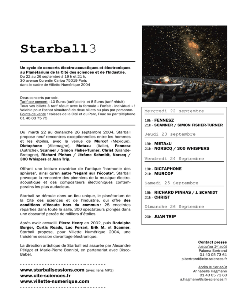 Starball3 Un cycle de concerts électro-acoustiques et électroniques au Planétarium de la Cité des sciences et de l'Industrie. Du 22 au 26 septembre à 19 h et 21 h, 30 avenue Corentin Cariou 75019 Paris dans le cadre de Villette Numérique 2004 Deux concerts par soir. Tarif par concert : 10 Euros (tarif plein) et 8 Euros (tarif réduit) Tous vos billets à tarif réduit avec la formule « Forfait - individuel » ! Valable pour l'achat simultané de deux billets ou plus par personne. Points de vente : caisses de la Cité et du Parc, Fnac ou par téléphone 01 40 03 75 75 Du mardi 22 au dimanche 26 septembre 2004, Starball propose neuf rencontres exceptionnelles entre les hommes et les étoiles, avec la venue de Murcof (Mexique), Dictaphone (Allemagne), Metaxu (Italie), Fennesz (Autriche), Scanner / Simon Fisher-Turner, Christ (GrandeBretagne), Richard Pinhas / Jérôme Schmidt, Norscq / 300 Whispers et Juan Trip. Offrant une lecture novatrice de l'antique "harmonie des sphères", ainsi qu'un autre "regard sur l'écoute", Starball provoque la rencontre des pionniers de la musique électroacoustique et des compositeurs électroniques contemporains les plus audacieux. Starball se déroule dans un lieu unique, le planétarium de la Cité des sciences et de l'industrie, qui offre des conditions d’écoute hors du commun : 28 enceintes réparties dans toute la salle, 300 spectateurs plongés dans une obscurité percée de milliers d’étoiles. Mercredi 22 septembre 19h - FENNESZ 21h - SCANNER / SIMON FISHER-TURNER Jeudi 23 septembre 19h - METAxU 21h - NORSCQ / 300 WHISPERS Vendredi 24 Septembre 19h - DICTAPHONE 21h - MURCOF Samedi 25 Septembre 19h - RICHARD PINHAS / J. SCHMIDT 21h - CHRIST Dimanche 26 Septembre 20h - JUAN TRIP Après avoir accueilli Pierre Henry en 2002, puis Rodolphe Burger, Curtis Roads, Luc Ferrari, Erik M. et Scanner, Starball propose, pour Villette Numérique 2004, une troisième session davantage électronique. La direction artistique de Starball est assurée par Alexandre Périgot et Marie-Pierre Bonniol, en partenariat avec DiscoBabel. - - - - - - - - - - - - - - - - - - - - - - - -- - - - - - - www.starballsessions.com (avec liens MP3) www.cite-sciences.fr www.villette-numerique.com - - - - - - - - - - - - - - - - - - - - - - - -- - - - - - - - Contact presse Jusqu’au 1er août Paloma Bertrand 01 40 05 73 61 [email protected] Après le 1er août Annabelle Hagmann 01 40 05 73 60 [email protected] Mercredi 22 septembre 19h FENNESZ C’est à partir d’une guitare et d’un laptop, que Fennesz offre un nouveau langage audacieux, à la musicalité et aux harmoniques chatoyantes, et où le naturalisme s’empare de chaque morceaux. Les modifications qu’il apporte aux sons analogiques, font de ses compositions des expérimentations riches et lumineuses qui peuvent rappeler une sorte de microvie en forêt tropicale ou les circonstances atmosphériques naturelles. Après avoir participé au dernier album de David Sylvian, il est revenu au printemps avec un nouvel album "Venice", sur le label Touch. www.fennesz.com 21h SCANNER/SIMON FISHER-TURNER Edité par les labels Sub Rosa, collaborateur régulier de David Shea et DJ Spooky, l’anglais Scanner - ou Robin Rimbaud - est l'architecte méticuleux d'ambiances sonores, piratant ses premières sources dans les discussions téléphoniques des gens. Il a depuis mis en volume ses pièces dans des installations sonores, notamment dans le cadre de l'exposition "Sonic Boom" organisée par David Toop à Londres, ainsi qu’à l’exposition Sonic Process au Centre Georges Pompidou. Pour inaugurer ce nouveau cycle Starball, Scanner, qui accompagnait Luc Ferrari l’an passé, invite aux claviers et aux machines le talentueux Simon Fisher-Turner. Connu pour ses projets personnels tels que "Shwarma" (Mute) et "Oh Venus", ou son groupe The King of Luxembourg, il a surtout travaillé pour le cinéma : notamment avec Derek Jarman, et il a été nominé aux Oscars pour le film "Loaded" de Anna Campion. Son travail, particulièrement cinématographique, se porte sur la superposition de voix, d’ambiances et de boucles. www.scannerdot.com www.simonfisherturner.com www.mute.com Jeudi 23 septembre 19h METAxU Première représentation en France Metaxu est un duo fondé à Rome en 1997 par Maurizio Martusciello (aka Martux) et Filippo Paolini (aka Økapi). Alors que le napolitain Maurizio Martusciello a joué avec Musica Elettronica Viva, Chris Cutler ou Otomo Yoshihide, c’est davantage sur un terrain d’expérimentation électroacoustique que se retrouvent les deux compositeurs et improvisateurs. Leur utilisation de bandes, échantillons, techniques de «scratch» et moyens «lo-fi» leur permet d’atteindre une sorte de «microscopie acoustique», riche en débris et en mémoires perdues. Passés maîtres dans le plagiat et le collage, Paolini et Martusciello développement ainsi leur idée d’«écoute réduite», typique de l’expérience acousmatique. Auteurs de deux disques, "Metaxu" (Plate Lunch / Allemangne) et "Rumors of... War" (No-Type / Canada), Martusciello est également l'auteur d’un disque dans la collection « Cinéma pour l’Oreille » du label Metamkine. Ce sera là leur premier concert français. www.metaxu.it www.metamkine.com http://www.notype.com/drones/cat.e/imnt_089.press.html 21h NORSCQ/300 WHISPERS Création Norscq, musicien électronique basé à Paris, est l’un des instigateurs clé de la scène underground française depuis plus de 15 ans, notamment au sein du groupe culte et iconoclaste The Grief. Les deux premiers albums dessinaient une direction ethnique par le biais de sonorités empruntées à la culture orientale, faisant voyager au cœur d'un continent arabe futuriste, qui capturait les ambiances séduisantes et mystérieuses d'un ciel protecteur ou l'énergie frénétique de derviches en transe. Depuis 2000, Norscq est retourné à l'électronique pure et exclusive, où les textures minima