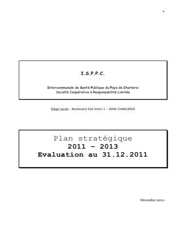 1. I.S.P.P.C. Intercommunale de Santé Publique du Pays de Charleroi Société Coopérative à Responsabilité Limitée Siège social : Boulevard Zoé Drion 1 – 6000 CHARLEROI Plan stratégique 2011 – 2013 Evaluation au 31.12.2011 Décembre 2011. 2. 1ère Partie : Plan stratégique Avant-propos 4 I. Préambule A. Le plan stratégique fondateur de l'I.S.P.P.C. B. Missions de service public 5 6 II. Institutions du secteur hospitalier A. Préambule B. Etat des lieux et répartition des lits par site et par indice au 31.12.08 B.1. Répartition des lits par site, par indice B.2. Hôpital Civil de Charleroi B.3. Hôpital André Vésale B.4. Hôpital Léonard de Vinci B.5. Hôpital Vincent Van Gogh B.6. Clinique Léon Neuens B.7. Polyclinique de La Madeleine C. Hôpital Civil Marie Curie C.1. Historique C.2. Principes généraux de conception du nouvel hôpital C.2.1. Les options fonctionnelles principales C.2.2. Les circulations C.2.3. L'amélioration du confort du patient C.2.4. Les options architecturales C.2.5. Accessibilité du site C.2.6. Intégration du complexe hospitalier dans l'environnement C.3. Coût et financement de la construction C.3.1. Calcul du plafond subsidiable C.3.2. Estimation du projet C.3.3. Travaux prioritaires C.3.4. Financement C.3.4.1. Financement alternatif C.3.4.2. Financement par le Budget des Moyens financiers C.3.4.3. Financement sur fonds propres D. Déploiement d'une polyclinique à l'Espace Santé E. Hôpital Civil de Charleroi F. Hôpital André Vésale G. Hôpital Léonard de Vinci H. Hôpital Vincent Van Gogh I. Clinique Léon Neuens J. Polyclinique de la Madeleine K. Les polycliniques extérieures L. Politique médicale M. Partenariats N. Recherche, enseignement et statut universitaire 7 8 9 10 11 12 13 14 15 16 17 18 19 20 21 3. O. Relations avec les médecins généralistes P. Relations avec les patients III. Institutions du secteur non hospitalier A. Préambule B. Hébergement non hospitalier : MR-MRS / MSP / lits de convalescence B.1. Maisons de repos – Maisons de repos et de soins B.1.1. Reconditionnement des MR/MRS B.1.2. Heureux Séjour à Courcelles B.1.3. Quiétude à Montigny-le-Tilleul B.1.4. Ouverture de la MR/MRS Pierre Paulus à Châtelet B.1.5. Autres perspectives d'avenir pour le secteur MR/MRS B.2. Maisons de soins psychiatriques B.3. Lits de convalescence C. Secteur de l'aide à la jeunesse C.1. Cité de l'Enfance C.1.1. Agréments C.1.2. Objectifs poursuivis C.1.3. La Maison de l'Adolescent C.2. Auberge du Maréchal Ney C.2.1. Activité C.2.2. Pérenniser l'équilibre financier D. Crèche "Les Bambis" E. Crèche à Lodelinsart F. Immeuble "Rayon de Soleil" G. Logements IV. Gestion générale A. Développement informatique B. Restructuration des services ressources C. Maîtrise de la masse salariale D. Stratégie financière E. Qualité et Risk management V. Prévisions budgétaires A. Avertissement B. Réserves du secteur non hospitalier 22 23 24 25 26 27 28 29 30 31 32 33 34 35 4. Avant-propos. L'article L1523-14 2°) du code wallon de la démocratie locale et de la décentralisation édicte que l'Assemblée Générale est seule compétente pour "l'approbation du plan stratégique et son évaluation annuelle". Conformément à l'article L1523-13 §4, l'Assemblée Générale du 21 décembre 2 0 1 0 a approuvé le plan stratégique de l'I.S.P.P.C. pour les années 2 0 1 1 à 2 0 1 3 . Il convient donc d ' é v a l u e r l ' é t a t d e l a m i s e e n œ u v r e d e c e plan stratégique e n c e t t e f i n d'année 2011 et de la modifier s'il échet. Afin de faciliter la compréhension de cette évaluation, il a été décidé de reprendre l'intégralité du document approuvé le 21 décembre 2007 et de le compléter par des commentaires ou compléments d'information reprenant, secteur d'activité par secteur d'activité, le degré de concrétisation de ce plan stratégique. Ces commentaires ou compléments d'informations sont imprimés avec la même police de caractère que cet avant‐propos. Ce plan stratégique est accompagné de prévisions budgétaires extrapolées sur base de l'évaluation du plan stratégique 2 0 1 1 -2 0 1 3 au 31 décembre 2 0 1 1 ainsi que sur les hypothèses d'activités validées par les différents responsables de l'intercommunale en fonction de leurs stratégies et contraintes respectives. 5. I. Préambule. A) Le plan stratégique fondateur de l'I.S.P.P.C. Le 28 décembre 2000, l'Assemblée Générale approuvait les premiers plans stratégiques de l'I.S.P.P.C. pour ses secteurs hospitalier et non hospitalier. x x x Dans le secteur hospitalier, un projet médical était arrêté. Affiné durant les mois qui précédèrent l'adoption des modifications statutaires qui allaient donner naissance à l'I.S.P.P.C. le 30 juin 2000, il alliait spécialisation et complémentarité en fonction des sites. L'Hôpital Civil de Charleroi et l'Hôpital A. Vésale se voyaient confier chacun une fonction d'hôpital général aigu abritant en complémentarité des services médico-chirurgicaux spécialisés. Par ailleurs, le développement d'un hôpital de revalidation multidisciplinaire – l'actuel L. De Vinci – était programmé à Montigny-le-Tilleul avec notamment la construction d'un hôpital d'un jour de revalidation. Quant à l'Hôpital V. Van Gogh à Marchienne-au-Pont, il était destiné à offrir la gamme complète des services psychiatriques hospitaliers et s'articulait sur un réseau régional de soins psychiatriques. L'accent était également mis, dans ce plan stratégique fondateur, sur le développement des hôpitaux de jour, l'intégration d'un réseau commun de polycliniques ainsi que sur la promotion de la recherche et de l'enseignement en partenariat privilégié avec l'U.L.B. Pour réaliser ce projet médical, plusieurs grands chantiers ont été poursuivis ou ouverts et des transferts de services ainsi que des regroupements d'activités furent opérés. Le plan stratégique fondateur entérin