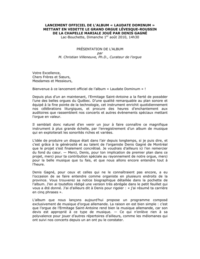 LANCEMENT OFFICIEL DE L’ALBUM « LAUDATE DOMINUM » METTANT EN VEDETTE LE GRAND ORGUE LÉVESQUE-ROUSSIN DE LA CHAPELLE MARIALE JOUÉ PAR DENIS GAGNÉ Lac-Bouchette, Dimanche 1er août 2010, 14h30 PRÉSENTATION DE L’ALBUM par M. Christian Villeneuve, Ph.D., Curateur de l’orgue Votre Excellence, Chers Frères et Sœurs, Mesdames et Messieurs, Bienvenue à ce lancement officiel de l’album « Laudate Dominum » ! Depuis plus d’un an maintenant, l’Ermitage Saint-Antoine a la fierté de posséder l’une des belles orgues du Québec. D’une qualité remarquable au plan sonore et équipé à la fine pointe de la technologie, cet instrument enrichit quotidiennement nos célébrations liturgiques, et procure des heures d’enchantement aux auditoires que rassemblent nos concerts et autres évènements spéciaux mettant l’orgue en valeur. Il semblait donc naturel d’en venir un jour à faire connaître ce magnifique instrument à plus grande échelle, par l’enregistrement d’un album de musique qui en exploiterait les sonorités riches et variées. L’idée de produire un disque était dans l’air depuis longtemps, si je puis dire, et c’est grâce à la générosité et au talent de l’organiste Denis Gagné de Montréal que le projet s’est finalement concrétisé. Je voudrais d’ailleurs ici l’en remercier du fond du cœur. — Merci, Denis, pour ton implication de premier plan dans ce projet, merci pour ta contribution spéciale au rayonnement de notre orgue, merci pour la belle musique que tu fais, et que nous allons encore entendre tout à l’heure. Denis Gagné, pour ceux et celles qui ne le connaîtraient pas encore, a eu l’occasion de se faire entendre comme organiste en plusieurs endroits de la province. Vous trouverez sa notice biographique détaillée dans la pochette de l’album. J’en ai toutefois rédigé une version très abrégée dans le petit feuillet qui vous a été donné. J’ai d’ailleurs dit à Denis pour rigoler : « j’ai résumé ta carrière en cinq phrases ». L’album que nous lançons aujourd’hui propose un programme composé exclusivement de musique d’orgue allemande. La raison en est bien simple : c’est que l’orgue de l’Ermitage Saint-Antoine rend bien la musique allemande, car son devis est approprié à ce type de musique. — Ce qui n’enlève rien à sa polyvalence pour jouer d’autres répertoires d’ailleurs, comme les mélomanes qui ont suivi nos concerts depuis un an ont pu le constater. 2 Vous trouverez donc sur ce CD des pièces représentant les principaux courants de la musique d’orgue en Allemagne, depuis Buxtehude, le plus grand compositeur pour l’orgue avant Bach, jusqu’à Siegfried Karg-Elert, mort au début du XXe siècle. Au cœur de l’album, Jean-Sébastien Bach occupe évidemment une place d’honneur. Les deux tiers des pièces sont tirés du trésor de la musique d’église, d’où le titre de l’album : « Laudate Dominum », c’est-à-dire : « Louez le Seigneur ». Il convient de s’attarder un peu ici sur ce caractère transcendant de l’orgue et de sa musique. Dernièrement, je relisais avec bonheur quelques pages de Stephen Bicknell, éminent facteur d’orgues et historien de l’orgue anglais décédé prématurément en 2007. Évoquant le profond symbolisme religieux de l’orgue, Bicknell faisait remarquer que la forme d’un orgue, — et cela est d’ailleurs légèrement perceptible dans notre buffet, — la forme d’un orgue, dis-je, évoque une ville fortifiée flanquée de tours, et dans laquelle chaque tuyau, avec sa « bouche », ses « lèvres », sa « langue », représente un être humain qui chante. D’une part, chaque tuyau est unique, à la fois par sa matière, sa forme, ses dimensions, son timbre, ses harmoniques, et bien sûr par la note de la gamme qu’il chante. D’autre part, tous les tuyaux sont ordonnés entre eux, suivant un ensemble complexe de principes géométriques, physiques et mathématiques, pour produire une seule et même musique. Eh bien : il est facile d’y voir là une analogie de la création tout entière, rassemblant une multitude d’êtres variés et complémentaires, régis par un ordre mystérieux, et ordonnés à chanter ensemble les louanges de Dieu. L’orgue serait donc, par excellence, l’instrument de musique le plus apte à représenter la cité céleste, rassemblant les humains — et les anges — glorifiant Dieu d’une même voix. Ainsi, dans les sonorités envoûtantes et mystiques de l’orgue, l’homme déchu pourrait percevoir un avant-goût du monde céleste où se trouve sa destinée ultime… Voilà donc pour les considérations théologiques sur le « Roi des instruments », comme l’appelait Mozart. Au plan sonore, maintenant, je vous dirai que l’album permet de faire entendre les couleurs les plus variées de notre orgue. Vous y trouverez à la fois du moelleux et du caractère, « et bien d’autres bonnes choses encore ». Je n’élaborerai pas sur ce chapitre, le mini-récital de tout à l’heure vous en donnera une meilleure illustration. J’attirerai enfin votre attention sur une dernière caractéristique, tout à fait sensationnelle d’ailleurs, de cet album, et qu’on ne rencontre vraiment pas tous les jours : je veux parler ici de l’utilisation qui a été faite de la technologie pour l’enregistrement des pièces. 3 Le disque, tel que vous l’entendrez, n’a pas été enregistré « en direct » comme on fait d’ordinaire, mais bien « en différé », dans le sens suivant. Vous savez peut-être qu’un système de gestion électronique dernier cri a été installé dans l’orgue — l’Ermitage serait d’ailleurs l’un des rares endroits au Canada à en posséder un. Ce système permet à l’organiste d’enregistrer des pièces et de les conserver indéfiniment en banque dans l’orgue. Eh bien : nous avons tiré parti de cette fonctionnalité pour produire le présent 