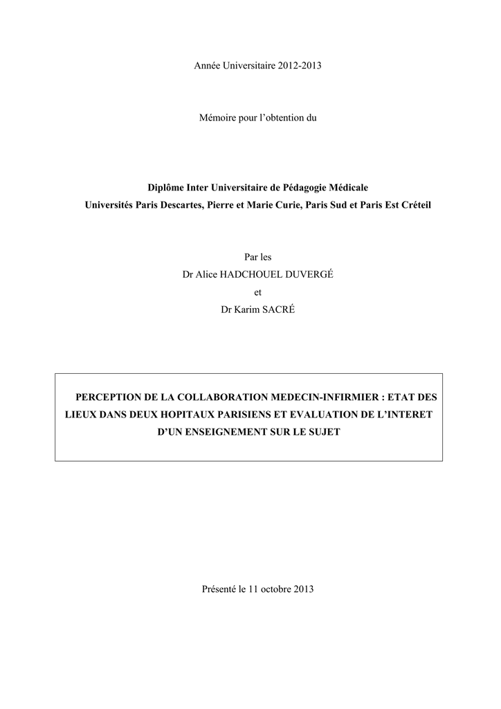 Année Universitaire 2012-2013 Mémoire pour l’obtention du Diplôme Inter Universitaire de Pédagogie Médicale Universités Paris Descartes, Pierre et Marie Curie, Paris Sud et Paris Est Créteil Par les Dr Alice HADCHOUEL DUVERGÉ et Dr Karim SACRÉ PERCEPTION DE LA COLLABORATION MEDECIN-INFIRMIER : ETAT DES LIEUX DANS DEUX HOPITAUX PARISIENS ET EVALUATION DE L’INTERET D’UN ENSEIGNEMENT SUR LE SUJET Présenté le 11 octobre 2013 TABLE DES MATIERES RESUME………………………………………………………………………………………2 INTRODUCTION……………………………………………………………………………..3 MATERIELS ET METHODES………………………………………………………………..4 1. Organisation générale et population de l’étude…………………………..………………….4 2. Questionnaire..………………………………………………………………………………4 3. Analyses statistiques………………………………………………………………………...6 RESULTATS…………………………………………………………………………………..7 1. Caractéristiques de la population……………………………………………………………7 2. Collaboration Médecin-Infirmier: score total……………………………………………….8 3. Collaboration Médecin-Infirmier : score par domaine………………………………………9 4. Enseignement de la relation Médecin-Infirmier…………………………………………...10 DISCUSSION………………………………………………………………………………...11 REFERENCES………………………………………………………………………………..16 LEGENDES DES TABLEAUX……………………………………………………………...18 LEGENDES DES FIGURES…………………………………………………………………19 TABLEAU 1………………………………………………………………………………….21 TABLEAU 2………………………………………………………………………………….22 TABLEAU 3………………………………………………………………………………….23 TABLEAU 4………………………………………………………………………………….24 FIGURE 1…………………………………………………………………………………….25 FIGURE 2…………………………………………………………………………………….26 FIGURE 3…………………………………………………………………………………….27 FIGURE 4…………………………………………………………………………………….28 ANNEXE 1…………………………………………………………………………………...29 ANNEXE 2…………………………………………………………………………………...32 1 RESUME Rationnel. La qualité de la collaboration médecin-infirmier a un impact sur la qualité des soins et le devenir du patient. Peu d’études ont évalué la perception et la qualité de cette collaboration dans les hôpitaux français. Un enseignement sur ce thème pourrait être proposé. Objectifs. 1- Evaluer la façon dont médecins et infirmiers perçoivent leur collaboration dans le domaine des soins, et 2- Interroger cette même population sur l’intérêt et les modalités d’un enseignement sur ce thème. Méthodes. Le travail a été réalisé de façon prospective au sein des Hôpitaux Universitaires Necker-Enfants Malades et Bichat-Claude Bernard à Paris. Treize services de l’hôpital Necker comptant 288 infirmiers et 197 médecins et 5 services de l’hôpital Bichat comptant 94 infirmiers et 78 médecins ont participé. Une échelle psychométrique américaine, The Jefferson Scale of Attitudes Toward Physician Nurse Collaboration (JSAPNC), de 15 items côtés par une échelle de Likert à 4 réponses, a été utilisée pour évaluer la perception de la collaboration médecin-infirmier. La JSAPNC interroge 4 domaines distincts: le travail en équipe (7 items), le soin (3 items), l’autonomie de l’infirmier (3 items) et la dominance du médecin (2 items). Trois questions à choix unique et deux questions à choix multiples interrogeaient également l’intérêt et les modalités d’un enseignement de la relation médecininfirmier. Résultats. Cent trente quatre infirmiers (47% de la population testable) et 86 médecins (43%) de l’hôpital Necker, et 84 infirmiers (89%) et 66 médecins (85%) de l’hôpital Bichat ont répondu au questionnaire. L’analyse a porté sur les 336 questionnaires (85.9% des questionnaires recueillis) totalement complétés pour la JSAPNC. Le score total moyen est significativement plus élevé chez les infirmiers (51,7 ± 3,5) que chez les médecins (49,1 ± 4,6 ; p<0.0001) traduisant une perception plus positive de la collaboration chez les infirmiers. Le score total par profession est indépendant de l’âge, du sexe, du grade et de la spécialité. Les scores par domaine (équipe, soin, autonomie, dominance) sont tous significativement plus élevés chez les infirmiers. Les scores des domaines « équipe » et « soin » varient selon la spécialité et le grade. Le score « dominance » est dépendant de l’âge et du sexe. Le stage infirmier effectué par les étudiants en médecine en 2ème année est jugé inutile à l’apprentissage de la relation médecin-infirmier par environ 30% des répondants. Soixantehuit pourcent des médecins et 87,3% des infirmiers pensent qu’un autre enseignement de la relation médecin-infirmier est nécessaire. Soixante sept pourcent des sujets pensent que cet enseignement devrait avoir lieu en deuxième cycle des études. Soixante-dix sept pourcent 