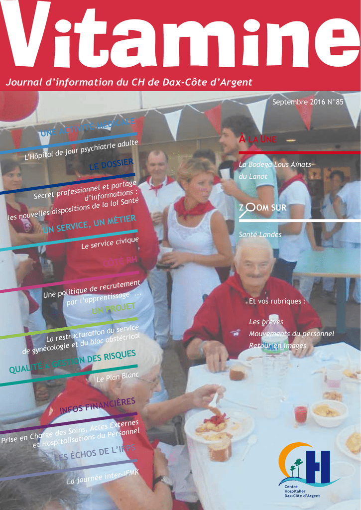 Journal d’information du CH de Dax-Côte d’Argent Septembre 2016 N°85 édicale ivité m Une act te trie adul ia h c y s p l de jour L’Hôpita ier Le doss age l et part : e n n o i s s rofe ations Secret p d’inform té a loi San l e d s n o dispositi ouvelles les n ice, un Un serv Le À LA UNE La Bodega Lous Aïnats du Lanot Z om sur métier ivique service c Santé Landes côté RH ent ecrutem r e d e u tiq .. Une poli issage . t n e r p p a par l’ et un proj ervice tion du s ical a r u t c u r tétr la rest bloc obs u d t e ie olog de gynéc UES ESTION DES G & é t i qual RISQ lanc Le Plan B cières inan Infos f ernes ctes Ext A , s n i o el S Personn rge des u a d h C s n n o e i Prise talisat et Hospi os Les éch de l’IFPS -IFM ée inter La journ K Et vos rubriques : Les brèves Mouvements du personnel Retour en images La Bodega Lous Aïnats du Lanot À LA UNE depuis cette année, le Lanot a sa propre Bodega ! Les Fêtes de Dax au Lanot, ça paraissait un peu fou. Et pourtant, grâce aux résidants, à leurs familles, grâce aux bénévoles, aux animatrices et à l’Unité Centrale de Restauration, la Bodega lous Aïnats a remporté un franc succès le vendredi 12 août 2016 ! entourés par les équipes soignantes, les médecins, les animatrices et la direction, les résidants et leurs familles se sont retrouvés autour d’un repas animé au centre de gériatrie du Centre Hospitalier de Dax-Côte d’Argent. Depuis le mois de janvier 2016, ce projet occupe l’équipe d’animation et la direction du centre de gériatrie. L’idée était de permettre aux résidants de s’investir dans la préparation de cette journée et de profiter de la fête tout en étant dans un cadre sécurisé. La commission d’animation des Fêtes, composée de résidants et d’animateurs, a donc réalisé un travail de définition du projet, en commençant par le choix du nom de la Bodega, le choix des affiches réalisées par nos aînés et bien sûr le choix du repas ! L’Unité Centrale de Restauration a concocté un menu des fêtes des plus gourmands : salade melon et pastèque, assiette de charcuterie, cœurs de canards et saucisses grillées, piperade, profiteroles et glaces. La sangria et le mojito sans alcool ont permis de se désaltérer par cette belle journée. Au total,185 couverts ont été servis. 185 couverts ont été servis Les équipes soignantes, notamment les kinés, les diététiciennes et les psychologues, mais également les bénévoles de l’Hospitalité Landaise et Sœur Valérie du service de l’Aumônerie, ont été de très précieuses aides auprès des résidants. Deux danseuses sévillanes ont animé le repas, dansant parfois avec un résidant ou un membre de la famille. Après le café, ce sont les Gouyats de l’Adou contactés par l’une de nos résidantes qui sont venus en démonstration pour le plus grand plaisir de tous. Puis, l’après-midi s’est poursuivie au son de l’accordéon. Belle réussite en 2016, la Bodega Lous Aïnats reviendra l’année prochaine pour animer les fêtes traditionnelles de nos chers aînés. Emmanuelle Dumas, Attachée d’Administration Hospitalière, Centre de Gériatrie 2 Une activité médicale L’Hôpital de jour de psychiatrie adulte En photo, de gauche à droite : Dr Gabriel Razafindrabesoa, psychiatre, responsable médical de la structure - Alexia Brouyez, infirmière - Sandrine Vraine, cadre supérieur de santé assistante du pôle de psychiatrie - Anaïs Groud, infirmière - Isabelle Fernandez, infirmière - Sylvain Voisin, psychologue L’Hôpital de jour de psychiatrie adulte de Dax a ouvert le 8 février 2016, sur le site du thermal, dans l’environnement urbain des structures ambulatoires de psychiatrie regroupant : les consultations pour adulte (CSM), l’Équipe Mobile Psychiatrie Précarité, les Consultations et le Centre d’accueil thérapeutique à temps partiel de pédopsychiatrie (CATTP), la Maison des adolescents et prochainement l’unité de soins de pédopsychiatrie à l’attention des enfants âgés de moins de 6 ans. Cet Hôpital de jour est une structure de soins de proximité de psychiatrie adulte, une alternative à l’hospitalisation complète à laquelle il peut se substituer ou dont il peut être le prolongement sur indication médicale psychiatrique. Cet outil renforce et diversifie l’offre de soin ambulatoire du Centre hospitalier de Dax pour : - Accueillir des personnes souffrant de troubles mentaux sévères - Intensifier, diversifier et enrichir les thérapies de prestations de soins relationnels médiatisés - Lutter contre l’isolement, la dégradation des capacités cognitives, relationnelle du sujet. Du lundi au vendredi, les patients sont accueillis pour des soins relationnels médiatisés en complément d’une prise en charge individuelle de type psychothérapie. Ces soins recherchent la participation pleine et entière du sujet autour de l’expression, la socialité, la corporalité et la santé. L’équipe se compose d’un temps de médecin psychiatre, de cadre supérieur de santé, de psychologue, d’infirmiers à compétences psychiatriques et d’un temps de secrétariat. Un fort travail clinique hebdomadaire soutien et entretien la pratique autour de l’analyse des pratiques, l’étude de cas et la formation d’équipe pour un savoir-faire spécialisé. Les soins à l’hôpital de jour permettent de maintenir l’insertion sociale des plus vulnérables et aide à la réinsertion des patients les plus affectés. L’ambition est de maintenir les malades mentaux, avec le soutien d’un cadre soignant étayant et rassurant hors des murs de l’hôpital, ‘‘hors de l’asile d’autrefois’’ , veiller à la continuité de leurs soins et prévenir d’éventuelles rechutes. L’ouverture de cette structure répond au besoin de soins psychiatriques des patients Landes Ouest du département et est l’occasion d’une belle aventure professionnelle pour 