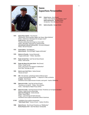 1 Sosno Expositions Personnelles 1972 Studio Ferrero - Nice (France) Préface : Pierre Restany "Le révélateur moral" Galleria Beniannino - San Remo (Italie) Introduction : Pierre Restany et Arman. 1973 Galleria Duemilla - Bologne (Italie) 1974 Galerie Mony Calatchi – Paris (France) "Oblitérations, Points Sensibles, Rapport des Choses, Objets Oblitérés" Préface : Umberto Eco "Sémiologie des messages visuels" Studio Ferrero - Nice (France) "Première oblitération électronique sur écran vidéo" Préface : Dany Bloch "Sosno peint sur fond de monde" Internationaal Cultureel Centrum (ICC) - Antwerpen (Belgique) Préface : Bernard Tesseydre. 1976 Foncke Gallery - Gent (Belgique) Galeria Alvarez - Porto (Portugal) "Imagens obliteradas" 1978 Galleria la Piramida - Caracas (Venezuela) "Imagens obliteradas" - Préface : Dany Bloch. 1979 Musée de Saint-Paul - Saint-Paul de Vence (France) Préface : André Verdet. 1983 Musée des Beaux-Arts Jules Chéret - Nice (France) Préface : Claude Fournet. Textes : Jean Forneris "Du fragment à l'oblitération" Daniel Biga "Hommage aux sens” 1984 Galerie cours Saint-Pierre - Genève (Suisse) "Bronzes de Sosno" 1985 FIAC - Paris (France) - présenté par Galerie Catherine Issert. "Sculptures Monumentales habitées" - Y. Bayard et H. Vidal, architectes. Acropolis – Nice (France). Installation d’une sculpture bronze et marbre, socle granit – hauteur 4,80mètres. 1986 Galerie de la Salle - Saint-Paul de Vence (France) "Variations sur la Liberté" - Préface : Pierre Restany. Textes : Avida Ripolin et Robert Pincus-Witten. 1987 Galerie de la Salle - Saint Paul de Vence (France) "Variations sur les Espaces Sensibles". Préfaces : Claude Fournet et Daniel Biga. Galerie de l'Orangeraie - Genève (Suisse) Préface : Michel Thévoz. Alliage – Lycée technique de Hyères (France) Installation d’une sculpture monumentale, béton et aluminium. 87-88 Installation d’une sculpture monumentale "Hotel Elysée Palace"- Bronze et Granit – Hauteur 26 mètres. 1988 Galerie Ferrero - Nice (France) "Variations sur l'Oblitération" Norton Museum of Art - West Palm Beach, Florida (USA) 2 Préface : Robert Pincus-Witten. Parc Scientifique des Ulis – (France) Installation d’une Sculpture en bronze et granit + 6 colonnes en granit rouge de 3,10mètres B.P.C.A. – Nice (France) Installation d’une sculpture monumentale – Marbre rouge, hauteur 3,10mètres. "Drapé dans le vide". 1989 Tampa Museum of Art - Tampa, Florida (USA) Préface : Andrew Maas. Galerie Ferrero - Nice (France) "Variations sur les coupes" Cocobeach Nice - Concert Aquatique – "Nucleus"- Musical sculpture. Compositeur M.Redolfi – interprète : A.Grillo. Sophia Antipolis (France) - Société Digitale – Installation d’une sculpture monumentale en bronze – Hauteur : 3,10mètres. "Drapé dans le vide". 1991 Galerie "Arts of this century" - Paris (France) "Rapports à l'autre" - Introduction : Emmanuel Levinas. G. Rosenthal Gallery - Chicago (USA) "Sculptures" Ville de Marseille – Porte d’Aix - (France) Pré-installation de colonnes oblitérées en granit Avec la collaboration des "Nouveaux constructeurs". Parc du Mercantour (France) - "Liberator’s monument" Installation d’une sculpture monumentale – Béton, aluminium et granit. 15 mètres x 10 mètres x 3 mètres. 1992 Marisa Del Ré Gallery - New-York (USA) "Recents Stones Sculptures". Bar Association Building - ,Chicago (USA) Installation d’une sculpture en bronze – 1,19 mètres x 5,50 mètres x 3 mètres "Liberty, liberty…" Arénas – Nice (France) Installation de 2 fontaines – Bronze et granit noir : 7 mètres. "Les Sources de l’Aéropole". 1992 1993 Galerie Valois - Paris (France) Technopolis – Les Ulis (France). Installation de 3 sculptures monumentales en acier pour le groupe Saint Martin. 7 mètres et 5 mètres. 1994 Reflex Modern Art Gallery - Amsterdam (Hollande) Pusan (Corée) - Symposium de Sculptures Premier Prix de Sculptures et installation de 3 sculptures en acier de 5 mètres et 3 mètres. 1996 Sonje Museum - Kyung Joo (Corée) - Installation d'une sculpture, "Les trois Grâces". Ville de Menton - (France) Installation d’une fontaine-sculpture : 4 blocs de marbre de 2,40 mètres de haut + socle granit Blue Bahia. Principauté de Monaco - Festival de la Magie - Création d’un timbre. Sonje Museum – Kyung Joo (Corée) : Installation d’une sculpture "Les trois Grâces" - Bronze, marbre et acier. Ville de Nice - Concours d’Architecture lauréat avec les architectes Yves Bayard et Francis Chapus – Sculpture habitable de 25 mètres de haut : "Tête Carrée". 1997 Etat du Tessin – (Suisse) – Installation d’une "Vénus Géante" acier de 5 mètres. Principauté de Monaco – Festival de la Télévision - Création d’un timbre. Trophées C.N.R.S.97 – Centre National de la Recherche Scientifique – Unesco Paris, "Images et Sciences". 1998 Raphäel Picard – Strasbourg (France) 3 Trophées C.N.R.S. 98 - Centre National de la Recherche Scientifique - Unesco Paris, "Images et Sciences". 1999 Théâtre Princesse Grâce - (Monaco) Installation d'un bronze : "Vénus bleue". Trophée C.N.R.S. 99 - Centre National de la Recherche Scientifique Unesco Paris, "Images et Sciences". Ville de Bagneux – Conseil Général des Hauts de Seine (France) Installation d’une sculpture en pierre – hauteur 16 mètres "Hommage à Romain Rolland". Principauté de Monaco – Création de 2 timbres. Trophée de Golf –Peugeot-Ortelli. Trophée du Championnat d’Europe de pêche – Antibes (France) Challenge Sosno 99 – Monte-Carlo Golf Club - (Sept.) 2000 Trophée C.N.R.S.2000. Centre National de la Recherche Scientifique - Unesco Paris, "Images et Sciences". Biliothèque de Nice – Début de la Construction de la "Tête Carrée", Sculpture Habitée. Monte-Carlo Invitational – Trophée pour le Pro- Celebrity Golf Tournament. Challenge Sosno 2000 – Monte-Carlo Golf Club - (Sept.) 2001 Trophée