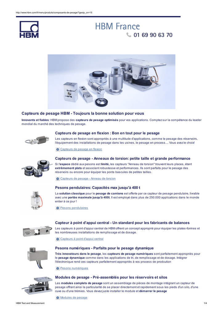 http://www.hbm.com/fr/menu/produits/composants-de-pesage/?geoip_cn=15 Capteurs de pesage HBM - Toujours la bonne solution pour vous Innovants et fiables: HBM propose des capteurs de pesage optimisés pour vos applications. Comptez sur la compétence du leader mondial du marché des techniques de pesage. Capteurs de pesage en flexion : Bon en tout pour le pesage Les capteurs en flexion sont appropriés à une multitude d'applications, comme le pesage des réservoirs, l'équipement des installations de pesage dans les usines, le pesage en process.... Vous avez le choix! Capteurs de pesage en flexion Capteurs de pesage - Anneaux de torsion: petite taille et grande performance Si l'espace dédié aux pesons est limité, les capteurs "Anneau de torsion" trouvent leurs places, étant extrêmement plats et associent robustesse et performances. Ils sont parfaits pour le pesage des réservoirs ou encore pour équiper les ponts bascules de petites tailles. Capteurs de pesage - Anneau de torsion Pesons pendulaires: Capacités max jusqu'à 400 t La solution classique pour le pesage de camions est offerte par ce capteur de pesage pendulaire, livrable avec une portée maximale jusqu'à 400t. Il est employé dans plus de 250.000 applications dans le monde entier à ce jour ! Pesons pendulaires Capteur à point d'appui central - Un standard pour les fabricants de balances Les capteurs à point d'appui central de HBM offrent un concept approprié pour équiper les plates-formes et les nombreuses installations de remplissage et de dosage. Capteurs à point d'appui central Pesons numériques - Parfaits pour le pesage dynamique Très innovateurs dans le pesage, les capteurs de pesage numériques sont parfaitement appropriés pour le pesage dynamique comme dans les applications de tri, de remplissage et de dosage. Intégrer l'électronique rend ces capteurs parfaitement appropriés à vos process de prodcution Pesons numériques Modules de pesage - Pré-assemblés pour les réservoirs et silos Les modules complets de pesage sont un assemblage de pièces de montage intégrant un capteur de pesage offrant ainsi la particularité de se placer directement et rapidement sous les pieds d'un silo, d'une cuve ou d'une trémies. Vous devez juste installer le module et démarrer le pesage Modules de pesage HBM Test and Measurement 1/4 http://www.hbm.com/fr/menu/produits/composants-de-pesage/?geoip_cn=15 Modules de pesage Trouvez le bon capteur de pesage pour votre application: Pesons pour ponts bascules pour camions Capteurs de pesage anneau de torsion (faible hauteur) C16 pesons pendulaires pour des charges maxi jusqu'à 200 t Pesons pour pesage de cuves , silo, surveillance de niveau, etc. Capteurs en flexion Capteurs - anneau de torsion (hauteur faible) Modules de pesage HBM Pesons pour les fabricants de balances Pour équiper par exemple les plates-formes avec un seul ou plusieurs capteurs, les convoyeurs, les balances aériennes, les balances de comptoir, les cuves supendues: Capteurs à point d'appui central Pour les machines de contrôle de poids, les trieuses pondérales, les installations de remplissage: Capteurs numériques Pesons pour le pesage dynamique Capteurs numériques Capteurs à point d'appui central (associés au convertisseur numérique AED) Pesons pour machines de remplissage et de dosage Capteurs de pesage numériques Capteurs à point d'appui central Capteurs de pesage spécifiques clients A la demande, des capteurs spécifiques peuvent être développés et fabriqués pour vous selon vos besoins particuliers. Capteurs spécifiques clients Autres produits HBM Electroniques de pesage Accessoires pour capteurs Brochure HBM Test and Measurement 2/4 http://www.hbm.com/fr/menu/produits/composants-de-pesage/?geoip_cn=15 HBM - Your Trusted Load Cell Manufacturer Good reasons for HBM: The world's #1 for load cell technology. Learn more about our load cell manufacturing facilities Sûreté avec certification des capteurs Capteurs de pesage de haute précision avec les certificats d'essai nationaux et internationaux valides Différents capteurs de pesage HBM du programme standard sont disponibles en version ATEX95 pour une utilisation dans diverses zones explosives Approbations internationales rendant les capteurs de pesage HBM facilement et rapidement utilisables (NTEP, GOS, OIML …) Capteurs de pesage avec différentes classes de précision HBM Test and Measurement 3/4 http://www.hbm.com/fr/menu/produits/composants-de-pesage/?geoip_cn=15 Voir l'aperçu Bonnes raisons pour HBM Leader mondial dans le développement et la production de capteurs de pesage pour des applications statiques et dynamiques, depuis plus de 60 ans! Haute qualité grandement approuvée, robustesse et précision tout en étant compétitif en prix Solutions allant des capteurs au logiciel en passant par les électroniques, utilisées dans des millions d'applications ainsi que des services adaptés . HBM Test and Measurement 4/4