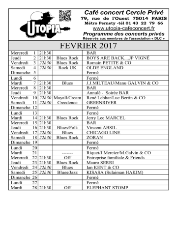 Café concert Cercle Privé 79, rue de l'Ouest 75014 PARIS Métro Pernety -tél 01 43 22 79 66 www.utopia-cafeconcert.fr Programme des concerts privés Réservés aux membres de l’association « DLC » FEVRIER 2017 Mercredi Jeudi Vendredi Samedi Dimanche Lundi Mardi Mercredi Jeudi Vendredi Samedi Dimanche Lundi Mardi Mercredi Jeudi Vendredi Samedi Dimanche Lundi Mardi Mercredi Jeudi Vendredi Samedi Dimanche 7Lundi Mardi 1 2 3 4 5 6 7 8 9 10 11 12 13 14 15 16 17 18 19 20 21 22 23 24 25 26 27 28 21h30 21h30 22h30 22h30 Blues Rock Blues Rock Rock UK 21h30 Blues 21h30 21h30 22h30 Mayall/Cream 22h30 Creedence 21h30 21h30 21h30 22h30 22h30 Blues Rock Blues/Folk Blues Blues Rock 21h30 21h30 22h30 22h30 ------Off Blues Rock Blues Blues/Jazz 21h30 Off BAR BOYS ARE BACK....JP VIGNÉ Romain PETITE & CO OLDE ENGLAND Fermé Relache Fermé J.J.MILTEAU/Manu GALVIN & CO BAR Annulé - Soirée BAR René Lebhar/Luc Bertin & CO GREENRIVER Fermé Fermé Jerry Lee MARCEL BAR Vincent ABSIL CHICAGO LINE ZORAN Fermé Fermé Riquet/J.Mercier/M.Galvin & CO Entreprise familiale & Friends Mauro SERRI Ian KENT & CO KISASA (Sulaiman HAKIM) Fermé Fermé ELEPHANT STOMP