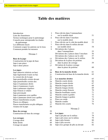 http://pagesperso-orange.fr/marie-louise.maggio/ Table des matières Introduction Liste des fournitures Termes techniques pour le patronnage Conseils pour entreprendre les études du patronnage Les différents tracés Comment couper les patrons sur le tissu Comment prendre les mesures 3 5 6 7 7 8 9 Niveau 1 Base de la jupe Construction de la jupe de base Jupe à une pince Jupe à deux pinces Les jupes Jupe entravée (rétrécie en bas) Jupe légèrement évasée en bas Le creusé dos de la jupe Jupe-portefeuille croisée devant Jupe-portefeuille croisée dos Jupe à 6 panneaux droits Jupe à 6 panneaux évasés Jupe à panneaux réguliers Jupe froncée à volants Jupe provençale Jupe à panneaux avec quilles Jupe à panneaux droits avec quilles Pinces transformées en plis Pinces en obliques Pinces transformées en plis obliques Aisance de la jupe 13 14 17 17 19 20 21 22 23 24 25 26 27 28 30 32 34 35 36 37 38 Pince déviée dans l’emmanchure sur le modèle droit Pince déviée dans l’encolure sur le modèle droit Pince déviée sur le côté du modèle droit Pince déviée dans le milieu devant sur modèle droit Déviations des 2 pinces dans l’emmanchure Déviations des 2 pinces dans l’encolure Déviations des 2 pinces sur le côté Déviations des 2 pinces sur le milieu Déviation de la pince de poitrine dans la pince de corsage Déviation de la pince corsage dans la pince de poitrine 51 52 53 54 55 56 57 58 59 60 Base de la manche droite Construction de base de la manche droite 61 62 Les manches droites Manche courte droite Manche courte étroite Manche longue droite Manche longue étroite Manche courte froncée Manche bouffante courte Manche courte à godets Manche longue à godets Pince au coude Manche coudée Manche très courte 65 66 67 68 69 70 71 72 73 74 75 76 Niveau 2 Base du corsage Construction de base du corsage 39 40 Les corsages Corsage droit Robe droite Corsage mi-ajusté 47 48 49 50 Les jupes Jupe à pli plat sur le milieu Jupe à pli creux sur le milieu Jupe à plis fermés Jupe à plis ouverts Jupe avec groupe de plis au devant 77 78 79 80 81 82 277 niveau 4-v001.indd 277 14/06/2006 08:59:45 Jupe avec groupe de plis au dos Jupes à godets Jupe trapèze Jupe à godets allant vers le haut Jupe à volants horizontaux à godets 84 86 90 91 92 Les corsages Décolleté en pointe Décolleté échancré en pointe Décolleté fantaisie Décolleté échancré fantaisie Décolleté en carré Décolleté à « l’italienne » Décolleté « bateau » Décolleté rond Croisure simple du devant Croisure simple du dos Double boutonnage sur vêtement cintré Double boutonnage sur vêtement droit Croisure fantaisie Parementure attenante ou parementure séparée du corsage Parementures de vêtements croisés Parementures d’encolure et d’emmanchure Corsage en cinq parties 97 98 99 100 101 102 103 104 105 106 108 110 113 116 Les pantalons Aisance au milieu dos du pantalon Aisance au milieu devant du pantalon Pantalon au dos rectifié à la largeur du bassin Pantacourt Pantalon classique Pantalon droit large du bas Pantalon large à fronces Pantalon à godets Pantalon étroit Pantalon croisé Combinaison-pantalon classique Short moulant 147 148 149 150 151 152 154 156 158 160 162 164 166 Niveau 3 Base de la jupe-culotte Construction de base de la jupe-culotte 167 168 171 172 119 120 Les jupes-culottes Jupe-culotte avec un pli creux au milieu Jupe-culotte avec un pli creux sur la ligne milieu de pince devant Jupe-culotte à godets Les cols Col « Mao » Col cassé Col « officier » Col chemisier simple Col chemisier avec pied de col attenant Col chemisier avec pied de col séparé Col Claudine plat Col Claudine à godets Col Claudine montant Col marin 123 124 125 125 126 127 128 129 130 131 132 Les manteaux Elargissement du corsage pour le manteau cintré Elargissement du corsage pour le manteau droit Elargissement du corsage pour le manteau ample Manteau à un godet Manteau à deux godets Cape droite Cape avec découpe 177 Base de la manche tailleur Construction de base de la manche tailleur 133 Base du pantalon Construction de la base du pantalon Pantalon à une pince Pantalon à deux pinces Pantalon à plis 139 140 144 145 146 Les manches droites Elargissement de la manche droite pour le manteau cintré Elargissement de la manche droite pour le manteau droit Elargissement de la manche droite pour le manteau ample Manche croisée Manche gigot 117 118 134 174 175 178 180 182 184 185 186 188 189 190 191 192 193 194 278 niveau 4-v001.indd 278 14/06/2006 08:59:45 Les manches tailleurs Manche tailleur élargie au coude Manche tailleur rétrécie au coude Manche tailleur rétrécie à l’arrondi Elargissement de la manche tailleur pour le manteau cintré Elargissement de la manche tailleur pour le manteau droit Elargissement de la manche tailleur pour le manteau ample Manche tailleur avec patte boutonnée 195 196 197 198 Les jupes Jupe en forme dans un quart de cercle Jupe en forme dans un demi-cercle Jupe avec déviation de pince sur le côté Jupe avec déviation de pince sur le côté et découpe Jupe avec déviation de pince sur le milieu Jupe avec déviation de pince sur le milieu et découpe Jupe avec déviations de pinces dans découpe Jupe avec déviations de pinces dans découpe et avec pli Jupe avec pince en courbe Jupe avec déviations de pinces dans découpe en courbe Poche dans découpe Jupe avec déviations, découpe et drapés Jupe asymétrique avec déviations de pinces et plis drapés Jupe drapée au dos Jupe drapée asymétrique avec patte boutonnée 203 204 206 208 Les corsages Découpe bretelle 229 230 199 200 201 202 Découpe princesse Epaule tombante Emmanchure de la robe sans manche Carrure un peu élargie Les plastrons Corsage sans pince Empiècement devant sous l’épaule Empiècement devant et dos sous l’épaule Empiècement en pointe devant sous l’épaule Empiècement devant sous la poitrine Encolure montante La combinaison devant La combinaison d