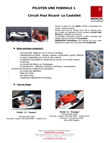 PILOTER UNE FORMULE 1 Circuit Paul Ricard- Le Castellet Prenez la place de vos idoles. Enfilez combinaison de course, casque et gants. Glissez-vous dans le cockpit d’une F1 et élancez-vous sur la piste du mythique et ultra moderne circuit Paul Ricard du Castellet en Provence. Ce privilège d’ordinaire réservé à l’élite mondiale des pilotes vous est aujourd’hui accessible. MEDIACOM Consulting vous propose de vivre cette expérience unique lors d’une journée inoubliable Notre package comprend : - - L’accueil petit- déjeuner sur le circuit et briefing L’équipement de pilote : casque, cagoule, combinaison, gants, bottines. La mise à disposition du circuit et des voitures Le déjeuner de qualité au restaurant du circuit, vin et café compris. L’open-bar Le cocktail de clôture au Champagne L’encadrement : hôtesses, mécanos, moniteurs, commissaires, services de prévention (médecins et pompiers) La remise des diplômes Visite de l’usine Les assurances L’assistance MEDIACOM Consulting Type de Stage STAGE F1 "Passion" Formule Opel Lotus Formule 1 moteur V8 (Prost AP02 – Jordan EJ11) STAGE F1 "Prestige" Formule Opel Lotus Formule 1 moteur V8 (Prost AP02 – Jordan EJ11) Formule 1 V10 (Arrows A20) et/ou 905 Peugeot Agence conseil en communication MEDIACOM Consulting International Business Park - Europa 1 - 74160 ARCHAMPS Tel : +33 (0) 4 50 43 15 15 - Fax : +33 (0) 4 50 43 15 24 SIRET 440 146 231 00012 www.mediacom-consulting.com PILOTER UNE FORMULE 1 Circuit Paul Ricard- Le Castellet TARIFS HT /PERSONNE TYPE DE STAGES STAGE F1 PASSION A) Stage complet F3 (10 tours) et 4 tours de F1 3 080 € B) Stage complet F3 (10 tours) et 5 tours de F1 3 520 € C) Stage complet F3 (10 tours) et 6 tours de F1 3 960 € D) Stage complet F3 (10 tours) et 7 tours de F1 4 430 € E) Stage complet F3 (10 tours) et 8 tours de F1 4 850 € F) Stage complet F3 (10 tours) et 9 tours de F1 5 230 € G) Stage complet F3 (10 tours) et 10 tours de F1 5 520 € Tour supplémentaire de F1 au delà du 10ème 360 € Accompagnateur (2 maxi/pilote) avec déjeuner 110,00 € Assurance complémentaire * 150 € *En cas de sinistre une franchise de 6000 € sera réclamée. Cette franchise pourra être réduite à 1 000 € par rachat partiel. Coût : 150 € Majoration de 10% pour les week-ends et jours fériés. 15 participants maxi. par journée organisée. Date à convenir en commun. Pour un nombre de participants inférieur à 15, nous consulter pour les dates de stages disponibles. Nous nous occupons aussi de votre séjour complet sur place. TYPE DE STAGES STAGE F1 PRESTIGE A) Stage complet F3 (5 tours) + 8 tours F1 V8 + 4 tours F1 Arrows V10 B) Stage complet F3 (5 tours) +8 tours F1 V8 + 4 tours 905 Peugeot C) Stage complet F3 (5 tours) +8 tours F1 V8 + 4 tours Arrows V10 + 4 tours 905 Peugeot 8 050 € 9 160 € 11 050 € Tour supplémentaire Arrows V10 660 € Tour supplémentaire Peugeot 905 750 € Accompagnateur (2 maxi/pilote) avec déjeuner 110,00 € Assurance complémentaire * 150 € Agence conseil en communication MEDIACOM Consulting International Business Park - Europa 1 - 74160 ARCHAMPS Tel : +33 (0) 4 50 43 15 15 - Fax : +33 (0) 4 50 43 15 24 SIRET 440 146 231 00012 www.mediacom-consulting.com PILOTER UNE FORMULE 1 Circuit Paul Ricard- Le Castellet Programme d'une journée de stage F1 07h45 • Accueil - Petit déjeuner - Présentation de l'équipe 08h00 • Vestiaire : prêt de l'équipement professionnel homologué : combinaison ignifugée, casque, cagoule, bottines, gants. 08h15 • Briefing "Pilotage" sur écran géant. 09h00 • Etude détaillée du circuit en minibus • Séries de tours de piste en Opel-Lotus F3 - Débriefing, corrections et conseils systématiques de l'équipe d'encadrement après chaque série. 12h15 • Déjeuner - Buffet 13h30 • Briefing FORMULE 1 14H00 • Tours de piste en FORMULE 1 et 905 Peugeot 17h30 • Remise des certificats de pilotage - cadeau souvenir de l’écurie Champagne. 18h00 • Fin de stage Agence conseil en communication MEDIACOM Consulting International Business Park - Europa 1 - 74160 ARCHAMPS Tel : +33 (0) 4 50 43 15 15 - Fax : +33 (0) 4 50 43 15 24 SIRET 440 146 231 00012 www.mediacom-consulting.com