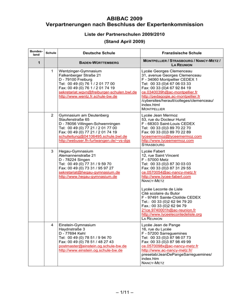 ABIBAC 2009 Verpartnerungen nach Beschluss der Expertenkommission Liste der Partnerschulen 2009/2010 (Stand April 2009) BundesSchule land 1 Deutsche Schule Französische Schule BADEN-WÜRTTEMBERG MONTPELLIER / STRASBOURG / NANCY-METZ / LA REUNION 1 Wentzinger-Gymnasium Falkenberger Straße 21 D - 79100 Freiburg Tel: 00 49 (0) 76 1 / 2 01 77 00 Fax: 00 49 (0) 76 1 / 2 01 74 19 [email protected] http://www.wentz.fr.schule-bw.de Lycée Georges Clemenceau 31, avenue Georges Clemenceau F - 34060 Montpellier CEDEX 1 Tel: 00 33 (0)4 67 06 03 33 Fax: 00 33 (0)4 67 92 84 19 [email protected] http://pedagogie.ac-montpellier.fr /cybersites/herault/colleges/clemenceau/ index.html MONTPELLIER 2 Gymnasium am Deutenberg Staufenstraße 65 D - 78056 Villingen-Schwenningen Tel: 00 49 (0) 77 21 / 2 01 77 00 Fax: 00 49 (0) 77 21 / 2 01 74 19 [email protected] http://webuser.fh-furtwangen.de/~vs-dgs Lycée Jean Mermoz 53, rue du Docteur Hurst F - 68303 Saint-Louis CEDEX Tel: 00 33 (0)3 89 70 22 70 Fax: 00 33 (0)3 89 70 22 89 [email protected] http://www.lyceemermoz.com STRASBOURG 3 Hegau-Gymnasium Alemannenstraße 21 D - 78224 Singen Tel: 00 49 (0) 77 31 / 9 59 70 Fax: 00 49 (0) 73 31 / 95 97 27 [email protected] http://www.hegau-gymnasium.de Lycée Fabert 12, rue Saint Vincent F - 57000 Metz Tel: 00 33 (0)3 87 30 03 03 Fax: 00 33 (0)3 87 31 29 55 [email protected] http://www.lycee-fabert.com NANCY-METZ Lycée Leconte de Lisle Cité scolaire du Butor F - 97491 Sainte-Clotilde CEDEX Tel.: 00 33 (0)2 62 94 79 20 Fax.: 00 33 (0)2 62 94 79 [email protected] http://www.lyceelecontedelisle.org LA REUNION 4 Einstein-Gymnasium Haydnstraße 3 D - 77694 Kehl Tel: 00 49 (0) 78 51 / 9 94 70 Fax: 00 49 (0) 78 51 / 48 27 43 [email protected] http://www.einstein.og.schule-bw.de – 1/11 – Lycée Jean de Pange 16, rue du Lycée F - 57200 Sarreguemines Tel: 00 33 (0)3 87 98 07 73 Fax: 00 33 (0)3 87 98 49 99 [email protected] http://www.ac-nancy-metz.fr/ presetab/JeanDePangeSarreguemines/ index.htm NANCY-METZ 5 Wagenburg-Gymnasium Wagenburgstraße 30 D - 70184 Stuttgart Tel: 00 49 (0) 71 1 / 46 20 36 Fax: 00 49 (0) 71 1 / 4 89 19 89 [email protected] http://www.wagenburg-gymnasium.de Lycée Général Leclerc 8, rue Poincaré F - 67703 Saverne CEDEX Tel: 00 33 (0)3 88 02 12 12 Fax: 00 33 (0)3 88 91 17 04 [email protected] http://www.lycee-leclerc.fr STRASBOURG 6 Bunsen-Gymnasium Humboldtstraße 23 D - 69120 Heidelberg Tel: 00 49 (0) 62 21 / 6 43 40 Fax: 00 49 (0) 62 21 / 41 94 21 [email protected] http://www.bg.hd.bw.schule.de Lycée Stanislas 7, rue du Lycée F - 67071 Wissembourg Tel: 00 33 (0)3 88 54 16 99 Fax: 00 33 (0)3 88 54 17 00 [email protected] http://www.lycee-stanislas.org STRASBOURG 7 Gymnasium in den Pfarrwiesen Pfarrwiesenallee 1-3 D - 71067 Sindelfingen Tel: 00 46 (0) 70 31 / 41 60 50 Fax: 00 49 (0) 70 31 / 41 60 525 [email protected] http://www.pfarrwiesen-gymnasium.de Lycée International des Pontonniers 1, rue des Pontonniers F - 67081 Strasbourg CEDEX Tel: 00 33 (0)3 88 37 15 25 Fax: 00 33 (0)3 88 37 98 94 [email protected] http://lyceepontonniers.free.fr STRASBOURG 8 Grimmelshausen Gymnasium Gymnasiumstraße 9 D - 77625 Offenburg Tel: 00 49 (0) 78 1 / 9 70 62 80 Fax: 00 49 (0) 78 1 / 9 70 62 90 [email protected] http://www.grimmelshausen-gymnasium.de Collège Episcopal Saint-Etienne 2, rue de la Pierre Large F - 67084 Strasbourg CEDEX Tel: 00 33 (0)3 88 76 75 88 Fax: 00 33 (0)3 88 76 75 89 [email protected] http://www.cse-strasbourg.com STRASBOURG 9 Martin-Schongauer-Gymnasium Leo-Wohlleb-Straße 2 D - 79206 Breisach Tel: 00 49 (0) 76 67 / 90 60 40 Fax: 00 49 (0) 76 67 / 90 60 41 09 [email protected] http://www.martin-schongauer-gymnasium.de Lycée Bartholdi 9, rue du lycée F - 68025 Colmar CEDEX Tel: 00 33 (0)3 89 20 83 30 Fax: 00 33 (0)3 89 20 83 38 [email protected] http://www.lyc-bartholdi-colmar.acstrasbourg.fr STRASBOURG 10 Fichte-Gymnasium Sophienstraße 12-16 D - 76133 Karlsruhe Tel: 00 49 (0) 72 1 / 1 33 45 08 Fax: 00 49 (0) 72 1 / [email protected] http://www.fichte-gymnasium.de Lycée Jwan-Henri Lambert 73, rue de Josue Heilman F - 68069 Mulhouse CEDEX Tel: 00 33 (0)3 89 33 16 55 Fax: 00 33 (0)3 89 33 16 50 [email protected] http://pagesperso-orange.fr/lycee.lambert STRASBOURG 11 Kepler-Gymnasium Uhlandstraße 30 D - 72072 Tübingen Tel: 00 49 (0) 70 71 / 2 04 12 15 Fax: 00 49 (0) 70 71 / [email protected] http://www.kp.tue.bw.schule.de Lycée Henri Meck 10, rue Henri Meck F - 67120 Molsheim Tel: 00 33 (0)3 88 49 44 88 Fax: 00 33 (0)3 88 49 44 90 [email protected] http://www.lyc-meck-molsheim.acstrasbourg.fr STRASBOURG – 2/11 – 12 Theodor-Heuss-Gymnasium Esslingen Breslauer Str. 19 D - 73730 Esslingen am Neckar Tel: 00 49 711 / 35122456 Fax: 00 49 (0) 71 1 / 35 12 32 22 [email protected] http://www.thg.es.bw.schule.de 2 3 BAYERN Collège International Europole 4, place de Sfax F - 38012 Grenoble CEDEX 1 Tel: 00 33 (0)4 38 12 25 00 Fax: 00 33 (0)4 38 12 25 20 [email protected] http://www.acgrenoble.fr/cite.scolaire.internationale GRENOBLE LYCEE FRANÇAIS / REIMS 13 Dante-Gymnasium Wackersberger Straße 61 D - 81371 München Tel: 00 49 (0) 89 / 23 34 33 00 Fax: 00 49 (0) 89 / 23 34 33 02 [email protected] http://www.dante-gymnasium.de Lycée Jean Renoir Berlepschstraße 3 D - 81373 München Tel: 00 49 (0) 89 / 7 21 00 70 Fax: 00 49 (0) 89 / 72 10 07 30 [email protected] http://www.lycee-jean-renoir.de LYCEE FRANÇAIS 14 Werner-Heisenberg-Gymnasium Professor-Angermair-Ring 40 D - 85748 Garching Tel: 00 49 (0) 89 / 3 20 69 69 Fax: 00 49 (0) 30 / 3 26 11 58 [email protected] http://www.whg-garching.de Lycée Jean Jaurès 17, rue Ruinart de Brimont F - 51062 Reims CEDEX Tel: 00 33 (0)3 26 40 22 50 Fax: 00 33 (0)3 26 40 00 66 [email protected] http://www.lyc-jaures.ac-reims.fr REIMS 15 Neues Gymnasium Nürnberg Weddingenstr. 21 D - 90478 Nürnberg Tel: 00 49 911 231 14230 Fax: 00 49 911 231 14235 [email protected] http://www.ngn-online.de/index.php Lycée Dr Koeberlé Boulevard Charlemegne - BP 