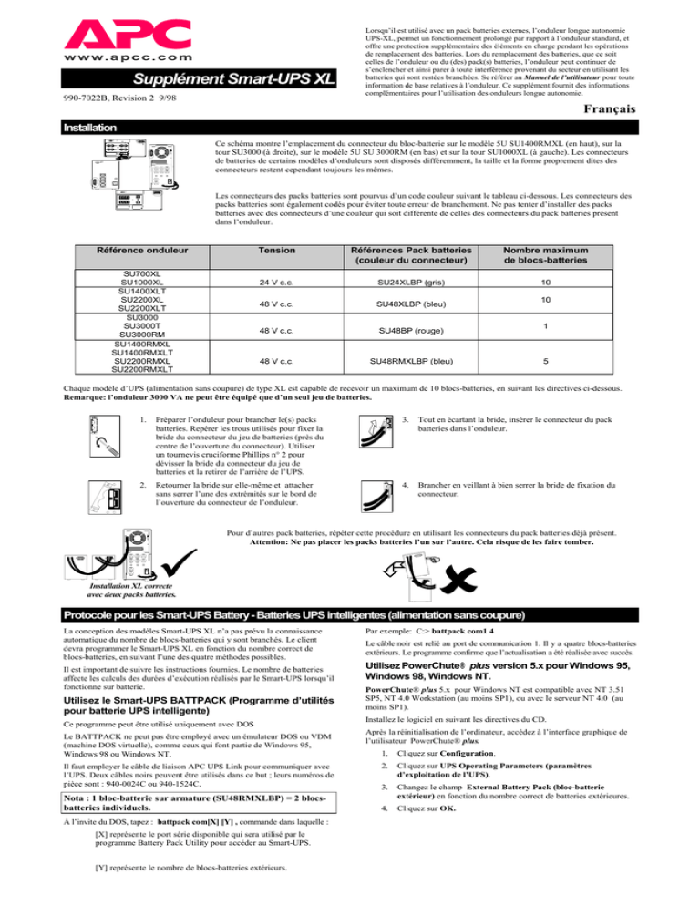Supplément Smart-UPS XL 990-7022B, Revision 2 9/98 Lorsqu’il est utilisé avec un pack batteries externes, l’onduleur longue autonomie UPS-XL, permet un fonctionnement prolongé par rapport à l’onduleur standard, et offre une protection supplémentaire des éléments en charge pendant les opérations de remplacement des batteries. Lors du remplacement des batteries, que ce soit celles de l’onduleur ou du (des) pack(s) batteries, l’onduleur peut continuer de s’enclencher et ainsi parer à toute interférence provenant du secteur en utilisant les batteries qui sont restées branchées. Se référer au Manuel de l’utilisateur pour toute information de base relatives à l’onduleur. Ce supplément fournit des informations complémentaires pour l’utilisation des onduleurs longue autonomie. Français Installation Ce schéma montre l’emplacement du connecteur du bloc-batterie sur le modèle 5U SU1400RMXL (en haut), sur la tour SU3000 (à droite), sur le modèle 5U SU 3000RM (en bas) et sur la tour SU1000XL (à gauche). Les connecteurs de batteries de certains modèles d’onduleurs sont disposés différemment, la taille et la forme proprement dites des connecteurs restent cependant toujours les mêmes. Les connecteurs des packs batteries sont pourvus d’un code couleur suivant le tableau ci-dessous. Les connecteurs des packs batteries sont également codés pour éviter toute erreur de branchement. Ne pas tenter d’installer des packs batteries avec des connecteurs d’une couleur qui soit différente de celles des connecteurs du pack batteries présent dans l’onduleur. Référence onduleur SU700XL SU1000XL SU1400XLT SU2200XL SU2200XLT SU3000 SU3000T SU3000RM SU1400RMXL SU1400RMXLT SU2200RMXL SU2200RMXLT Tension Références Pack batteries (couleur du connecteur) Nombre maximum de blocs-batteries 24 V c.c. SU24XLBP (gris) 10 48 V c.c. SU48XLBP (bleu) 48 V c.c. SU48BP (rouge) 48 V c.c. SU48RMXLBP (bleu) 10 1 5 Chaque modèle d’UPS (alimentation sans coupure) de type XL est capable de recevoir un maximum de 10 blocs-batteries, en suivant les directives ci-dessous. Remarque: l’onduleur 3000 VA ne peut être équipé que d’un seul jeu de batteries. 1. Préparer l’onduleur pour brancher le(s) packs batteries. Repérer les trous utilisés pour fixer la bride du connecteur du jeu de batteries (près du centre de l’ouverture du connecteur). Utiliser un tournevis cruciforme Phillips n° 2 pour dévisser la bride du connecteur du jeu de batteries et la retirer de l’arrière de l’UPS. 3. Tout en écartant la bride, insérer le connecteur du pack batteries dans l’onduleur. 2. Retourner la bride sur elle-même et attacher sans serrer l’une des extrémités sur le bord de l’ouverture du connecteur de l’onduleur. 4. Brancher en veillant à bien serrer la bride de fixation du connecteur. Pour d’autres pack batteries, répéter cette procédure en utilisant les connecteurs du pack batteries déjà présent. Attention: Ne pas placer les packs batteries l’un sur l’autre. Cela risque de les faire tomber. Installation XL correcte avec deux packs batteries. Protocole pour les Smart-UPS Battery - Batteries UPS intelligentes (alimentation sans coupure) La conception des modèles Smart-UPS XL n’a pas prévu la connaissance automatique du nombre de blocs-batteries qui y sont branchés. Le client devra programmer le Smart-UPS XL en fonction du nombre correct de blocs-batteries, en suivant l’une des quatre méthodes possibles. Il est important de suivre les instructions fournies. Le nombre de batteries affecte les calculs des durées d’exécution réalisés par le Smart-UPS lorsqu’il fonctionne sur batterie. Utilisez le Smart-UPS BATTPACK (Programme d’utilités pour batterie UPS intelligente) Ce programme peut être utilisé uniquement avec DOS Le BATTPACK ne peut pas être employé avec un émulateur DOS ou VDM (machine DOS virtuelle), comme ceux qui font partie de Windows 95, Windows 98 ou Windows NT. Il faut employer le câble de liaison APC UPS Link pour communiquer avec l’UPS. Deux câbles noirs peuvent être utilisés dans ce but ; leurs numéros de pièce sont : 940-0024C ou 940-1524C. Nota : 1 bloc-batterie sur armature (SU48RMXLBP) = 2 blocsbatteries individuels. À l’invite du DOS, tapez : battpack com[X] [Y] , commande dans laquelle : [X] représente le port série disponible qui sera utilisé par le programme Battery Pack Utility pour accéder au Smart-UPS. [Y] représente le nombre de blocs-batteries extérieurs. Par exemple: C:> battpack com1 4 Le câble noir est relié au port de communication 1. Il y a quatre blocs-batteries extérieurs. Le programme confirme que l’actualisation a été réalisée avec succès. Utilisez PowerChute® plus version 5.x pour Windows 95, Windows 98, Windows NT. PowerChute® plus 5.x pour Windows NT est compatible avec NT 3.51 SP5, NT 4.0 Workstation (au moins SP1), ou avec le serveur NT 4.0 (au moins SP1). Installez le logiciel en suivant les directives du CD. Après la réinitialisation de l’ordinateur, accédez à l’interface graphique de l’utilisateur PowerChute® plus. 1. Cliquez sur Configuration. 2. Cliquez sur UPS Operating Parameters (paramètres d’exploitation de l’UPS). 3. Changez le champ External Battery Pack (bloc-batterie extérieur) en fonction du nombre correct de batteries extérieures. 4. Cliquez sur OK. Changez le nombre de blocs-batteries extérieurs avec le programme Terminal Changez le nombre de blocs-batteries extérieurs avec le programme HyperTerminal Terminal fonctionne sous Windows 3.1x, Windows for Workgroups et Windows NT 3.51. HyperTerminal est utilisé avec Windows 95, Windows 98, et Windows NT 4.0 1. QUITTEZ le serveur PowerChute® plus. Dans le cas de Windows NT, le service de l’UPS doit être interrompu. 1. QUITTEZ le serveur PowerChute® plus. Dans le cas de Windows NT, le service de l’UPS doit être interrompu. 2. Allez à : Program Manager (Gestionnaire des p
