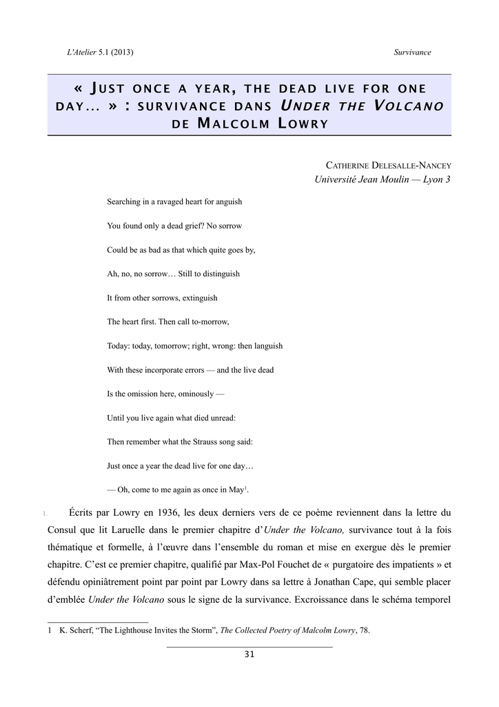 L'Atelier 5.1 (2013) Survivance « JUST ONCE A YEAR, THE DEAD LIVE FOR ONE DAY… » : SURVIVANCE DANS UNDER THE VOLCANO DE MALCOLM LOWRY CATHERINE DELESALLE-NANCEY Université Jean Moulin — Lyon 3 Searching in a ravaged heart for anguish You found only a dead grief? No sorrow Could be as bad as that which quite goes by, Ah, no, no sorrow… Still to distinguish It from other sorrows, extinguish The heart first. Then call to-morrow, Today: today, tomorrow; right, wrong: then languish With these incorporate errors — and the live dead Is the omission here, ominously — Until you live again what died unread: Then remember what the Strauss song said: Just once a year the dead live for one day… — Oh, come to me again as once in May1. Écrits par Lowry en 1936, les deux derniers vers de ce poème reviennent dans la lettre du 1. Consul que lit Laruelle dans le premier chapitre d’Under the Volcano, survivance tout à la fois thématique et formelle, à l’œuvre dans l’ensemble du roman et mise en exergue dès le premier chapitre. C’est ce premier chapitre, qualifié par Max-Pol Fouchet de « purgatoire des impatients » et défendu opiniâtrement point par point par Lowry dans sa lettre à Jonathan Cape, qui semble placer d’emblée Under the Volcano sous le signe de la survivance. Excroissance dans le schéma temporel 1 K. Scherf, “The Lighthouse Invites the Storm”, The Collected Poetry of Malcolm Lowry, 78. 31 L'Atelier 5.1 (2013) Survivance du roman dont il vient contrarier l’unité de temps, il présente le point de vue d’un survivant, Jacques Laruelle, témoin de la tragédie qui s’est déroulée un an plus tôt et a vu disparaître Yvonne et le Consul. Lieu et temps se conjuguent pour marquer ce chapitre — et le roman — du sceau de la survivance puisqu’il se déroule le Jour des Morts, jour de fête au Mexique, cette terre palimpseste où se côtoient pyramides indiennes et églises baroques, traces superposées des différentes civilisations qui ont laissé leur empreinte sur le pays. Les fresques de Diego Rivera sur le palais de Cortés, surinscription d’un idéal révolutionnaire sur les vestiges de la colonisation, sont en ellesmêmes le signe de cette superposition des temps, que vient encore souligner le dialogue suivant entre le Consul et Laruelle : “The slow darkening of the murals as you look from right to left. It seems somehow to symbolize the gradual imposition of the Spaniards' conquering will upon the Indians. Do you see what I mean?” “If you stood at a greater distance still it might seem to symbolize for you the gradual imposition of the Americans’ conquering friendship from left to right upon the Mexicans,” the Consul said with a smile, removing his dark glasses, “upon those who have to look at the frescoes and remember who paid for them2.”(255) L’histoire se prêterait donc à une lecture de droite à gauche comme de gauche à droite, mettant à mal toute perception chronologique du temps, à l’instar de ce premier chapitre qui nous projette vers l’avenir de la narration tout en nous replongeant dans un passé révolu et pourtant encore bien présent. La tension temporelle au cœur de la survivance est également celle qui habite Under the 2. Volcano, roman de la hantise, tant dans l’histoire qu’il raconte que dans l’écriture même. Le premier chapitre, nous le verrons, est tout entier habité par cette tension entre nostalgie et survivance, entre repli sur un passé à jamais disparu et ouverture du présent sur le passé et l’avenir. Cette ouverture fait en réalité effraction dans le présent, effraction dont jaillit le texte, sa forme portant l’empreinte de la survivance, ainsi que nous tenterons de le montrer dans un second temps. Or s’il est une forme qui partout s’inscrit dans Under the Volcano, c’est bien celle du cercle : cercle de la répétition tragique, de l’éternel retour, du temps cyclique ou encore de la bobine de cinéma ; c’est cette forme ambivalente dont la révolution entraîne passé, présent et avenir dans un ballet paradoxal que nous interrogerons dans une dernière partie. 2 Toutes les références sont à l’édition Penguin de 1985. 32 L'Atelier 5.1 (2013) Survivance Entre nostalgie et survivance Deux chaînes montagneuses, deux volcans, deux hommes après une partie de tennis : c’est sur 3. le chiffre deux, chiffre de la tension, que s’ouvre le premier chapitre d’Under the Volcano. A une première vision panoramique qui place la ville de Quauhnahuac dans un vaste réseau planétaire succède une plongée dans ses rues tortueuses et défoncées à l’abri de hautes murailles, préfigurant ainsi la tension entre repli nostalgique et trouée sur d’autres temps. C’est en suivant Laruelle, l’ami d’enfance du Consul resté seul à Quauhnahuac après les morts d’Yvonne et du Consul et le départ de Hugh un an plus tôt, que le lecteur pénètre dans l’univers du roman. A la veille de quitter à son tour le Mexique, Laruelle parcourt une dernière fois les lieux où il a vécu ces cinq dernières années. Mais ce parcours est tout entier tourné vers le passé : sa passion pour Yvonne qui ramène à sa mémoire le souvenir extatique de la Cathédrale de Chartres, son amitié avec le Consul et les vacances passées avec lui et les Taskerson sur les rives anglaise ou normande de la Manche, ou encore les liens quasi paternels tissés avec Hugh au soir de la tragédie qui s’est déroulée un an plus tôt, le 2 novembre 1938. Il s’agit bien ici de nostalgie au sens étymologique du terme, retour (nostos) douloureux (algos) sur ce qui est désormais loin, la distance venant en quelque sorte embellir les souvenirs et rendre plus difficile la séparation. Les relations de Laruelle avec Yvonne, le Consul et Hugh, le demi-frère de ce dernier, marquées au coin de la trahison, de l’adultère et de la jalousie, n’ont en effet pas toujours revêtu ce caract