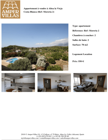 Appartement à vendre à Altea la Vieja Costa Blanca (Ref: Moreria 2) Type: apartement Réference: Ref: Moreria 2 Chambres à coucher: 2 Salles de bain: 2 Surface: 70 m2 Logement Location Prix: 550 € 2016 © AmperVillas S.L. C/ Callosa, nº 78 Bajo, Altea La Vella (Alicante) Spain (+34) 620 470 641 | (+34) 96 584 80 00 [email protected] | [email protected] | [email protected] Powered by TCPDF (www.tcpdf.org)