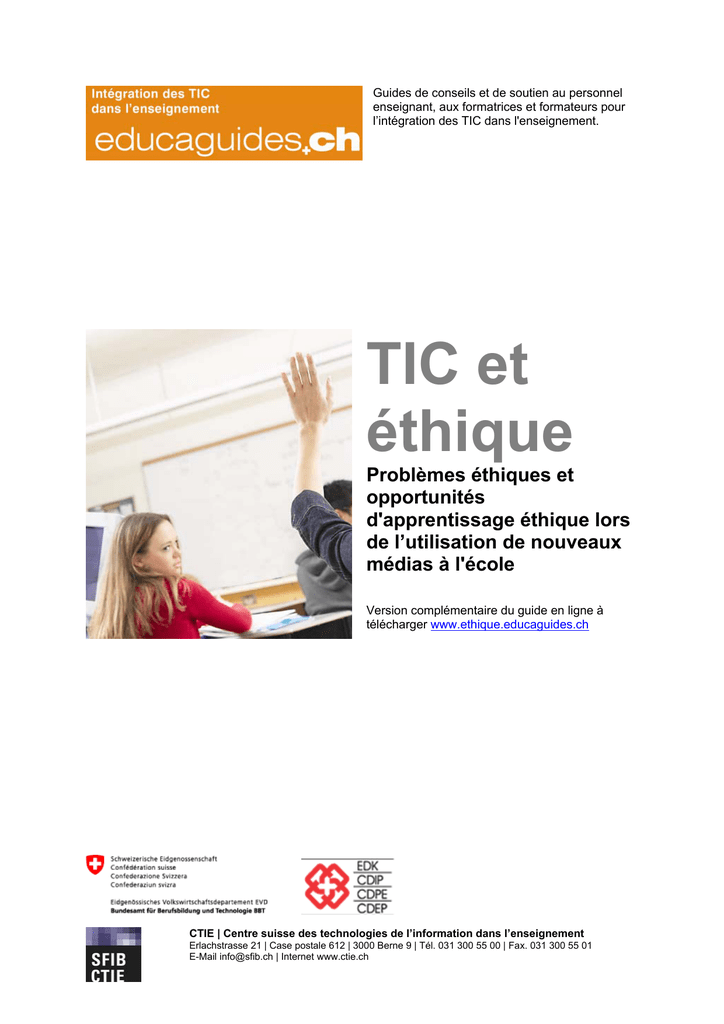 Guides de conseils et de soutien au personnel enseignant, aux formatrices et formateurs pour l’intégration des TIC dans l'enseignement. TIC et éthique Problèmes éthiques et opportunités d'apprentissage éthique lors de l’utilisation de nouveaux médias à l'école Version complémentaire du guide en ligne à télécharger www.ethique.educaguides.ch CTIE | Centre suisse des technologies de l’information dans l’enseignement Erlachstrasse 21 | Case postale 612 | 3000 Berne 9 | Tél. 031 300 55 00 | Fax. 031 300 55 01 E-Mail [email protected] | Internet www.ctie.ch Impressum Mandant Le projet educaguides a vu le jour dans le cadre de l'initiative PPP-ésn "L’école sur le net", sur mandat de l'Office fédéral de la formation professionnelle et de la technologie (OFFT) et avec le soutien de la Conférence suisse des directeurs cantonaux de l’instruction publique (CDIP). Editeur Centre suisse des technologies de l'information dans l'enseignement (CTIE) Direction de projet du guide Prof. Dr. Dominik Petko, Institut für Medien und Schule: www.ims.phz.ch Pädagogische Hochschule Zentralschweiz – Hochschule Schwyz Co-auteurs et autrices Daniela Knüsel (IMS, PHZ Schwyz) Yvonne Büttner (Fachstelle Erwachsenenbildung Baselland) Prof. Dr. Christina Class (HTA Luzern) Guido Estermann (PHZ Schwyz) François Filliettaz (SATW working group e-education) Louis-Joseph Fleury (F3 MITIC BEJUNE) Prof. Dr. Bruno Frischherz (HSW Luzern) Marcel Gübeli (Interkantonale Lehrmittelzentrale) Jean-François Jobin (F3 MITIC BEJUNE) Raymond Morel (SATW) Prof. Dr. Dominik Petko (PHZ Schwyz) Illustration DigiOnline GmbH, Cologne Version linguistique Le Guide est également disponible en allemand. Copyright educa.ch, Berne 2006 | Reproduction – hormis à des fins commerciales – autorisée avec indication de la source. Dans le cadre de PPP-ésn "L’école sur le net", il a été décidé en 2005 de mettre l'accent sur "les conseils et l’assistance pédagogiques et didactiques aux enseignants pour l’utilisation des TIC pendant les cours". Des spécialistes respecté-e-s d'institutions reconnues et renommées dans le domaine de la formation continue ont élaboré, dans le cadre d'une collaboration intercantonale et interinstitutionnelle, des guides sur les thèmes suivants: - Ethique: TIC et éthique Infrastructure: acquisition et exploitation des outils informatiques dans les écoles Literacy: lire, écrire et nouveaux médias Droit: droit des TIC Didactique: ordinateur dans l’enseignement – didactique et méthodologie Hétérogénéité: enseignement dans les classes hétérogènes Ces guides sont présentés en détail sur le site www.educaguides.ch. Vous y trouvez également la présente version complémentaire à télécharger. Table des matières 1. Nouveaux médias – nouveaux problèmes éthiques ............................................................................................ 3 2. Flous juridiques ................................................................................................................................................... 3 3. Barrières techniques, règles de comportement et devoir de surveillance............................................................ 4 4. Formation éthique................................................................................................................................................ 5 5. Situations problématiques en tant qu'opportunités d'apprentissage .................................................................... 5 5.1. Contenus interdits et présentant un risque pour la jeunesse ........................................................................ 6 5.2. Informations douteuses................................................................................................................................. 7 5.3. Droit d’auteur ................................................................................................................................................ 7 5.4. Communication et Netiquette........................................................................................................................ 8 5.5. Sphère privée................................................................................................................................................ 9 5.6. Fossé numérique ........................................................................................................................................ 10 5.7. Usage abusif de la technologie ................................................................................................................... 11 5.8. Consommation et publicité.......................................................................................................................... 11 6. Utilisation productive des médias en tant qu'opportunité de formation éthique ................................................. 12 6.1. Utiliser des contenus intelligents pour l'apprentissage personnel ............................................................... 13 6.2. Communiquer avec des personnes vivant dans d'autres contextes et cultures .......................................... 13 6.3. Apprendre le "fair-play" avec des jeux d'ordinateur..................................................................................... 13 6.4. Produire et diffuser des contenus intelligents.............................................................................................. 13 7. Conclusion......................................................................................................................................................... 14 8. Bibliographie...................................................................................................................................................... 14 www.ethique.educaguides.ch 2 1. Nouveaux médias – nouveaux problèmes éthiques L’intégration des nouveaux médias à l'école e