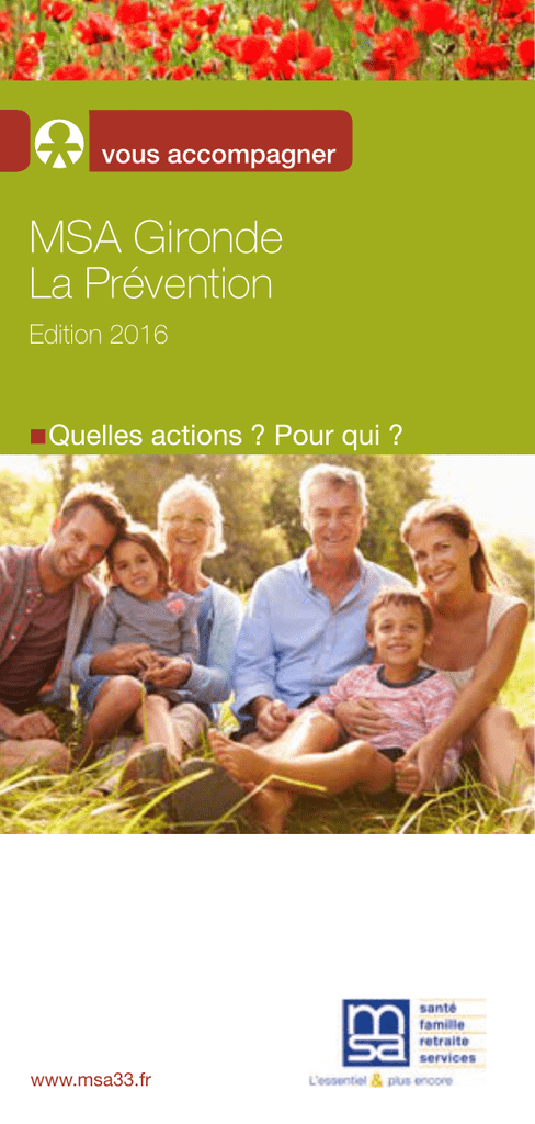 vous accompagner MSA Gironde La Prévention Edition 2016 Quelles actions ? Pour qui ? www.msa33.fr La PRÉVENTION Un enjeu majeur pour la Santé des assurés agricoles et leur famille Le programme de prévention du régime agricole prend en compte les objectifs prioritaires de Santé Publique. Sur le champ professionnel, il est en cohérence avec les orientations du futur plan national « Santé sécurité au travail ». Parcours de prévention « Les Instants Santé » C’est un bilan de santé, qui est proposé gratuitement, tous les 10 ans aux adhérents du régime agricole entre 25 et 74 ans, avec un contenu différent selon l’âge de l’assuré. Ces examens de santé sont organisés par canton. Quant aux jeunes assurés de 16 ans, ils bénéficient d’une consultation de prévention auprès de leur médecin généraliste et reçoivent en retour un chèque sport d’une valeur de 30 €. Parcours de prévention pour les personnes en situation de précarité La MSA met en place un dispositif complet, qui comprend des actions individuelles et/ou collectives : bilan de santé spécifique, prise en charge bucco-dentaire, ateliers « prendre soin de sa santé »… Ateliers « Mettez de la santé dans votre assiette » Cette action de prévention permet de travailler sur trois axes essentiels : manger équilibré à moindre coût, créer un lieu d’échange et de convivialité, lutter contre l’isolement, respecter un budget alloué, sensibiliser au coût des produits. Dépistage Du cancer du sein Cette campagne nationale dans laquelle la MSA est engagée depuis 2003, concerne toutes les femmes de 50 à 74 ans. Au niveau local, elle est gérée par l’AGIDECA (Association GIrondine de DEpistage des CAncers), qui adresse la prise en charge aux assurées, tous les 2 ans, leur permettant ainsi la dispense d’avance de frais chez le radiologue. Du cancer colo-rectal Ce dispositif cible les hommes et les femmes de 50 à 74 ans, invités à retirer le nouveau test de dépistage, disponible depuis juin 2015, chez leur médecin traitant. C’est également l’AGIDECA qui opère en Gironde. Santé du pied - Surveillance de la peau La MSA Gironde vous accueille dans ses locaux, pour un examen gratuit, délivré par un spécialiste (podologue, dermatologue). Modalités pratiques : se renseigner sur le site www.msa33.fr pour connaître précisément le jour et le lieu d’organisation de chaque évènement annuel. Troubles des apprentissages chez l’enfant La MSA Gironde a piloté une action de formation des médecins généralistes, au repérage des troubles « DYS », ainsi qu’une session de sensibilisation, en direction du personnel des MFR (Maisons Familiales Rurales). Addictions Aide au sevrage tabagique La prise en charge des substituts nicotiniques fait partie des dispositions du plan d’aide au sevrage tabagique élaboré par le Ministère de la Santé. La MSA Gironde applique ce dispositif, en prenant en charge, sur prescription médicale, les produits concernés, dans la limite de 50 € par bénéficiaire et par an et 150 € pour les femmes enceintes, les bénéficiaires de la CMU-C, les patients atteints d’ALD et les jeunes entre 20 et 30 ans. Vaccination La campagne «ROR» (Rougeole, Oreillons, Rubéole) Le vaccin ROR est recommandé à partir de 12 mois pour la 1ère dose, puis entre 16 et 18 mois pour la seconde. Un courrier de sensibilisation adressé par la MSA, invite les parents à demander une prescription à leur médecin, afin d’obtenir gratuitement le vaccin (pris en charge jusqu’à 17 ans). La campagne anti-grippale Dans le cadre de cette action nationale, la MSA délivre un bon de prise en charge aux plus de 65 ans, à certaines personnes en ALD (Affection Longue Durée) et aux femmes enceintes. Ces bénéficiaires peuvent se faire vacciner gratuitement contre la grippe. La campagne démarre habituellement au début de l’automne. Prévention bucco-dentaire Plan institutionnel de prévention bucco-dentaire Ce plan, spécifique au régime agricole, prévoit l’accompagnement dentaire à des moments importants de la vie, afin de réduire les risques pathologiques. Il consiste à inviter les enfants de 3 ans et les personnes âgées de 65 ans, à un bilan bucco-dentaire chez le chirurgien dentiste de leur choix. Dispositif conventionnel de prévention buccodentaire « M’t dents» Il s’agit d’inviter les jeunes de 6, 9, 12, 15 et 18 ans à consulter gratuitement un chirurgien dentiste pour réaliser un bilan dentaire. A date anniversaire, la MSA envoie un courrier de prise en charge aux jeunes concernés. Examen bucco-dentaire chez la femme enceinte L’objectif est d’inciter les femmes enceintes à réaliser un examen bucco-dentaire chez un chirurgien dentiste, qui sera pris en charge à 100 %. Dès réception de la déclaration de grossesse, la MSA adresse un courrier d’invitation, permettant la dispense d’avance de frais. Santé et seniors « Seniors, soyez acteurs de votre santé » C’est le titre d’une conférence interactive, ouverte à tous, animée par un professionnel de santé. Elle est organisée à la demande, au sein de structures de proximité du lieu de vie et prioritairement en zone rurale. « PEPS EUREKA » Ce programme d’activation cérébrale permet de faire travailler sa mémoire à travers des exercices pratiques et ludiques. C’est une méthode d’entraînement, pour réapprendre à apprendre, faire travailler sa mémoire et ses facultés cérébrales. « Ateliers du Bien Vieillir » Ce programme répond à une préoccupation de santé publique : la prévention et l’éducation à la santé des plus de 55 ans. La MSA propose à des groupes de 12 personnes un accompagnement prévention sur 7 ateliers interactifs traitant du sommeil, de l’alimentation, de l’usage des médicaments… L’objectif est de rendre les seniors acteurs de leur santé. La MSA Gironde a confié à l’ASEPT 33 (Association de Santé, d