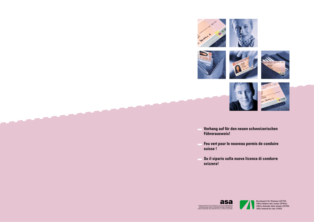 Vorhang auf für den neuen schweizerischen Führerausweis! Feu vert pour le nouveau permis de conduire suisse ! Su il sipario sulla nuova licenza di condurre svizzera! 1 Sécurité Les matières choisies pour le document brut du permis, les feuilles protectrices et holographiques avec caractéristiques de sécurité intégrées, les technologies de fabrication et de personnalisation répondent aux normes de sécurité les plus élevées. Sicherheit Die gewählten Materialien für die Führerausweis-Rohlinge, die Hologramm- und Schutzfolien mit integrierten Sicherheitsmerkmalen sowie die verwendeten Herstellungs- und Personalisierungstechnologien erfüllen hohe Sicherheitsanforderungen. Praktisch: Ein Ausweis, vier Sprachen Der neue, praktische schweizerische Führerausweis im handlichen Kreditkartenformat kennt keine Kantons- und Sprachgrenzen. Er ist in allen vier Landessprachen (Deutsch, Französisch, Italienisch, Rätoromanisch) erhältlich und bleibt auch bei einem Kantonswechsel in der ganzen Schweiz unbegrenzt gültig. Pratique : un permis, quatre langues Le nouveau permis de conduire suisse pratique, dans le format carte de crédit, transcende les frontières cantonales et linguistiques. Il est en effet disponible dans les quatre langues nationales (allemand, français, italien, rhéto-roman) et reste valable de manière illimitée dans toute la Suisse même en cas de déménagement dans un autre canton. Pratica: un documento, quattro lingue La nuova licenza di condurre svizzera nel pratico formato carta di credito non conosce confini cantonali o linguistici. È disponibile nelle quattro lingue nazionali (tedesco, francese, italiano e romancio) e rimane valida senza alcun limite anche in caso di trasferimento in un qualsiasi altro cantone della Svizzera. Der Nachweis ist mit forensischen Untersuchungen des Urkundenlabors der Kantonspolizei Zürich erbracht worden. Der neue schweizerische Führerausweis erfüllt die einschlägigen ISO-Normen und ist optimal gegen Verfälschungen und Totalfälschungen gesichert. Der neue schweizerische Führerausweis enthält viele Sicherheitsmerkmale. Sichtbar sind: – OVI (Optically Variable Ink): Farbwechsel-Effekt (Änderung der Farbe bei verändertem Blickwinkel) – Microprint-Text – Dreidimensionale Abbildung des Objektes CH+ – Iridescent Ink La preuve a été fournie à l’aide d’études légales effectuées par le laboratoire des actes authentiques de la police cantonale de Zurich. Le nouveau permis de conduire suisse satisfait aux normes ISO correspondantes et est protégé de manière optimale contre les contre-façons et falsifications totales. Le nouveau permis de conduire suisse est assorti de nombreuses caractéristiques de sécurité. Eléments visibles : – OVI (Optically Variable Ink) : effet de commutation des couleurs (changement de couleur suivant l’angle de vue) – Texte microprint – Illustration en trois dimensions de l’objet CH+ – Iridescent Ink Sicurezza I materiali di supporto scelti, l’applicazione di ologrammi e di pellicole di protezione con caratteristiche di sicurezza integrate, nonché le tecnologie di fabbricazione e di personalizzazione adottate soddisfano criteri di sicurezza elevati. La prova è fornita dagli esami forensi condotti dal Servizio documenti della Polizia cantonale di Zurigo. La nuova licenza di condurre svizzera soddisfa le norme ISO vigenti in materia ed è protetta in modo ottimale contro le contraffazioni e falsificazioni. La nuova licenza di condurre svizzera contiene tutta una serie di caratteristiche di sicurezza. Quelle visibili sono: – OVI (Optically Variable Ink): inchiostro variabile otticamente (cambiamento del colore a seconda dell’inclinazione) – Microscrittura – Riproduzione tridimensionale del soggetto CH+ – Inchiostro iridescente Sicherheitselemente Neue Führerausweiskategorien Eléments de sécurité Kategorien/Unterkategorien Elementi di sicurezza A A A1 B CH+ Objekt Objet CH+ Soggetto CH+ B1 C C1 D Microprint Text Texte microprint Microscrittura D1 BE CE C1E Microprint Text Texte microprint Microscrittura Spezialfarbe OVI Couleur spéciale OVI Colore speciale OVI DE D1E Ärztliche Untersuchung Motorräder mit einer Motorleistung von nicht mehr als 25 kW und einem Verhältnis von Motorleistung und Leergewicht von nicht mehr als 0,16 kW/kg. nein Motorräder mit einer Motorleistung von mehr als 25 kW und einem Verhältnis von Motorleistung und Leergewicht von mehr als 0,16 kW/kg. nein Motorräder mit einem Hubraum von nicht mehr als 125 cm3 und einer Motorleistung von höchstens 11 kW. nein Motorwagen und dreirädrige Motorfahrzeuge mit einem Gesamtgewicht von nicht mehr als 3500 kg und nicht mehr als acht Sitzplätzen ausser dem Führersitz; mit einem Fahrzeug dieser Kategorie darf ein Anhänger mit einem Gesamtgewicht von nicht mehr als 750 kg mitgeführt werden. Fahrzeugkombinationen aus einem Zugfahrzeug der Kategorie B und einem Anhänger von mehr als 750 kg, sofern das Gesamtzugsgewicht 3500 kg und das Gesamtgewicht des Anhängers das Leergewicht des Zugfahrzeuges nicht übersteigen. nein Klein- und dreirädrige Motorfahrzeuge mit einem Leergewicht von höchstens 550 kg. nein Motorwagen – ausgenommen jene der Kategorie D – mit einem zulässigen Gesamtgewicht von mehr als 3500 kg; mit einem Motorwagen dieser Kategorie darf ein Anhänger mit einem Gesamtgewicht von nicht mehr als 750 kg mitgeführt werden. ja Motorwagen – ausgenommen jene der Kategorie D – mit einem Gesamtgewicht von mehr als 3500 kg, aber nicht mehr als 7500 kg; mit einem Motorwagen dieser Unterkategorie darf ein Anhänger mit einem Gesamtgewicht von nicht mehr als 750 kg mitgeführt werden. ja Motorwagen zum Personentransport mit mehr als acht Sitzplätzen ausser dem Führersitz; mit einem Motorwagen dieser Kategorie darf ein Anhänger mit einem Gesamtgewicht von nicht mehr als 750 kg mitgeführt werden. ja Motorwagen zum Personentransport mit mehr als acht, aber nicht mehr