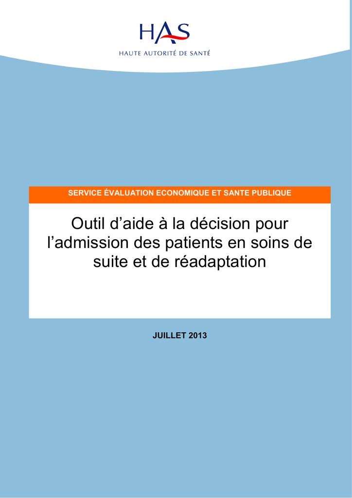 Outil d’aide à la décision pour l’admission des patients en soins de suite et de réadaptation Recommandations SERVICE ÉVALUATION ECONOMIQUE ET SANTE PUBLIQUE Outil d’aide à la décision pour l’admission des patients en soins de suite et de réadaptation JUILLET 2013 HAS / Service évaluation économique et santé publique / Juillet 2013 1 Outil d’aide à la décision pour l’admission des patients en soins de suite et de réadaptation www.has-sante.fr Haute Autorité de Santé Service documentation – information des publics 2 avenue du Stade de France - F 93218 Saint-Denis La Plaine CEDEX Tél. :+33 (0)1 55 93 70 00 - Fax :+33 (0)1 55 93 74 00 Ce document a été validé par le Collège de la Haute Autorité de Santé en juillet 2013. © Haute Autorité de Santé – 2013 HAS / Service évaluation économique et santé publique / Juillet 2013 2 Outil d’aide à la décision pour l’admission des patients en soins de suite et de réadaptation Sommaire 1 Introduction.................................................................................................................. 4 2 Saisine et objectifs ...................................................................................................... 4 3 Contexte ....................................................................................................................... 4 3.1 3.2 4 Autorisations .......................................................................................................... 5 Organisation et modalités d’admission ................................................................... 6 Champ de l’évaluation ................................................................................................. 6 4.1 4.2 5 Objectif de l’évaluation ........................................................................................... 6 Méthode de travail retenue .................................................................................... 7 Modalités de réalisation .............................................................................................. 7 5.1 Groupe de travail ................................................................................................... 8 5.1.1 Modalités de constitution .................................................................................... 8 5.1.2 Modalités de consultation ................................................................................... 8 5.2 Groupes d’essai et d’évaluation ............................................................................. 8 5.2.1 Groupe d’essai ................................................................................................... 8 5.2.2 Groupe d’évaluation ........................................................................................... 9 5.3 Documents d’appui utilisé pour construire l’outil ................................................... 10 5.4 Périmètre de l’outil défini par le groupe de travail ................................................. 11 5.5 Modalités de consultation des groupes d’essai et d’évaluation............................. 12 5.6 Apport des groupes d’essai et d’évaluation .......................................................... 13 5.7 Positionnement de l’outil dans le processus de décision d’orientation du patient . 13 6 Présentation de l’outil pilote d’aide à la décision.................................................... 14 6.1 Contexte d’utilisation ............................................................................................ 15 6.2 Architecture de l’outil ............................................................................................ 15 6.2.1 Présentation des différents filtres de décision et de leurs explications associées 16 6.2.2 Présentation de l’outil sous forme d’algorithme ................................................ 23 7 Questions complémentaires ..................................................................................... 24 8 Limites de l’évaluation .............................................................................................. 24 9 Perspectives .............................................................................................................. 25 10 Participants ................................................................................................................ 26 10.1 10.2 10.3 10.4 Equipe projet........................................................................................................ 26 Groupe de travail ................................................................................................. 26 Groupe d’essai ..................................................................................................... 27 Groupe d’évaluation ............................................................................................. 27 11 Références ................................................................................................................. 29 12 Annexes ..................................................................................................................... 31 Annexe 1. Liste des sociétés savantes, fédérations et associations sollicitées ................ 31 Annexe 2. Notice explicative ayant été communiquée aux médecins participant au groupe d’essai ............................................................................................................................. 32 Annexe 3. Notice explicative ayant été communiquée aux médecins participant au groupe d’évaluation ..................................................................................................................... 35 Annexe 4. Questionnaire d’évaluation GraAL .................................................................. 37 HAS / Service évaluation économique et santé publique / Juillet 2013 3 Outil d’ai