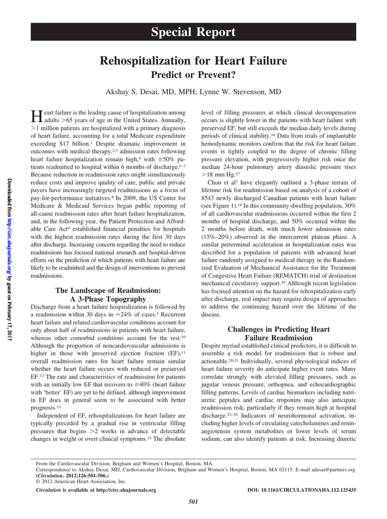 Special Report Rehospitalization for Heart Failure Predict or Prevent? Akshay S. Desai, MD, MPH; Lynne W. Stevenson, MD H Downloaded from http://circ.ahajournals.org/ by guest on February 17, 2017 eart failure is the leading cause of hospitalization among adults ⬎65 years of age in the United States. Annually, ⬎1 million patients are hospitalized with a primary diagnosis of heart failure, accounting for a total Medicare expenditure exceeding $17 billion.1 Despite dramatic improvement in outcomes with medical therapy,2,3 admission rates following heart failure hospitalization remain high,4 with ⱖ50% patients readmitted to hospital within 6 months of discharge.5–7 Because reduction in readmission rates might simultaneously reduce costs and improve quality of care, public and private payers have increasingly targeted readmissions as a focus of pay-for-performance initiatives.8 In 2009, the US Center for Medicare & Medicaid Services began public reporting of all-cause readmission rates after heart failure hospitalization, and, in the following year, the Patient Protection and Affordable Care Act9 established financial penalties for hospitals with the highest readmission rates during the first 30 days after discharge. Increasing concern regarding the need to reduce readmissions has focused national research and hospital-driven efforts on the prediction of which patients with heart failure are likely to be readmitted and the design of interventions to prevent readmissions. level of filling pressures at which clinical decompensation occurs is slightly lower in the patients with heart failure with preserved EF, but still exceeds the median daily levels during periods of clinical stability.16 Data from trials of implantable hemodynamic monitors confirm that the risk for heart failure events is tightly coupled to the degree of chronic filling pressure elevation, with progressively higher risk once the median 24-hour pulmonary artery diastolic pressure rises ⬎18 mm Hg.17 Chun et al7 have elegantly outlined a 3-phase terrain of lifetime risk for readmission based on analysis of a cohort of 8543 newly discharged Canadian patients with heart failure (see Figure 1).18 In this community-dwelling population, 30% of all cardiovascular readmissions occurred within the first 2 months of hospital discharge, and 50% occurred within the 2 months before death, with much lower admission rates (15%–20%) observed in the intercurrent plateau phase. A similar preterminal acceleration in hospitalization rates was described for a population of patients with advanced heart failure randomly assigned to medical therapy in the Randomized Evaluation of Mechanical Assistance for the Treatment of Congestive Heart Failure (REMATCH) trial of destination mechanical circulatory support.19 Although recent legislation has focused attention on the hazard for rehospitalization early after discharge, real impact may require design of approaches to address the continuing hazard over the lifetime of the disease. The Landscape of Readmission: A 3-Phase Topography Discharge from a heart failure hospitalization is followed by a readmission within 30 days in ⬇24% of cases.5 Recurrent heart failure and related cardiovascular conditions account for only about half of readmissions in patients with heart failure, whereas other comorbid conditions account for the rest.10 Although the proportion of noncardiovascular admissions is higher in those with preserved ejection fraction (EF),11 overall readmission rates for heart failure remain similar whether the heart failure occurs with reduced or preserved EF.12 The rate and characteristics of readmission for patients with an initially low EF that recovers to ⱖ40% (heart failure with ‘better’ EF) are yet to be defined, although improvement in EF does in general seem to be associated with better prognosis.13 Independent of EF, rehospitalizations for heart failure are typically preceded by a gradual rise in ventricular filling pressures that begins ⬎2 weeks in advance of detectable changes in weight or overt clinical symptoms.15 The absolute Challenges in Predicting Heart Failure Readmission Despite myriad established clinical predictors, it is difficult to assemble a risk model for readmission that is robust and actionable.20,21 Individually, several physiological indices of heart failure severity do anticipate higher event rates. Many correlate strongly with elevated filling pressures, such as jugular venous pressure, orthopnea, and echocardiographic filling patterns. Levels of cardiac biomarkers including natriuretic peptides and cardiac troponins may also anticipate readmission risk, particularly if they remain high at hospital discharge.22–26 Indicators of neurohormonal activation, including higher levels of circulating catecholamines and reninangiotensin system metabolites or lower levels of serum sodium, can also identify patients at risk. Increasing diuretic From the Cardiovascular Division, Brigham and Women’s Hospital, Boston, MA. Correspondence to Akshay Desai, MD, Cardiovascular Division, Brigham and Women’s Hospital, Boston, MA 02115. E-mail [email protected] (Circulation. 2012;126:501-506.) © 2012 American Heart Association, Inc. Circulation is available at http://circ.ahajournals.org DOI: 10.1161/CIRCULATIONAHA.112.125435 501 502 Circulation July 24, 2012 Inial discharge death Readmission Rate “Palliaon and Priories” “Transion Phase” “Plateau Phase” Median Time from hospital discharge Downloaded from http://circ.ahajournals.org/ by guest on February 17, 2017 Figure 1. Three-phase terrain of lifetime readmission risk after heart failure hospitalization. Figure drawn to schematically depict data from Chun et al7 and Russo et al.19 The shaded red areas depict periods of highest risk for readmission immediately following discharge and just before death; the shaded yellow area reflects the lower risk plateau phase; and the shaded green reflects the ass