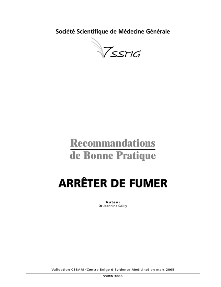 Société Scientifique de Médecine Générale Recommandations de Bonne Pratique ARRÊTER DE FUMER Auteur Dr Jeannine Gailly Validation CEBAM (Centre Belge d’Evidence Medicine) en mars 2005 SSMG 2005 AVANT-PROPOS La SSMG présente ici une nouvelle recommandation de bonne pratique. Les recommandations de bonne pratique (RBP) sont avant tout un outil pour le médecin de famille en vue de l’amélioration de la qualité de sa pratique quotidienne et par là de la qualité des soins apportés aux patients et à la collectivité. Rigoureusement fondées sur des bases et évidences scientifiques, leur élaboration s’est étalée sur de nombreux mois. Si chaque recommandation est sous la responsabilité rédactrice d’un seul ou de deux auteurs, le texte final est l’œuvre collégiale d’une équipe de médecins généralistes. En aucune façon, ces recommandations ne doivent être considérées comme contraignantes. Chaque RBP doit faire l’objet d’une évaluation de sa faisabilité chez chaque patient pris individuellement et le praticien estimera, de bonne foi, si la RBP s’applique ou non. Elle n’entravera en rien la relation du médecin avec son patient. Par ailleurs, les RBP constituent des repères ou des références reconnues par la profession, et auxquelles le médecin peut se rallier en toute sécurité. Si la découverte de ces recommandations éveillait chez le lecteur mille et une questions, commentaires ou encore objections et de là le souhait de les partager avec des confrères au sein de cercles de pairs, nous aurions atteint notre objectif. Le groupe de travail des Recommandations de Bonne Pratique de la SSMG RBP : arrêter de fumer 2 TABLE DES MATIÈRES Synthèse de la RBP « Arrêter de fumer » . . . . . . . . . . . . . . . . . . . . . . . . . . . . . . . . . . . . . . . . . . . . . . . . . p. 5 1. Exposé du problème . . . . . . . . . . . . . . . . . . . . . . . . . . . . . . . . . . . . . . . . . . . . . . . . . . . . . . . . . . . . . . p. 7 2. Objectifs et limites de cette recommandation . . . . . . . . . . . . . . . . . . . . . . . . . . . . . . . . . . . . . . . . . . p. 7 3. Questions cliniques abordées . . . . . . . . . . . . . . . . . . . . . . . . . . . . . . . . . . . . . . . . . . . . . . . . . . . . . . . p. 7 4. Les belges et le tabac . . . . . . . . . . . . . . . . . . . . . . . . . . . . . . . . . . . . . . . . . . . . . . . . . . . . . . . . . . . . . . p. 7 5. Connaître le fumeur . . . . . . . . . . . . . . . . . . . . . . . . . . . . . . . . . . . . . . . . . . . . . . . . . . . . . . . . . . . . . . . p. 8 5.1. La carrière du fumeur. . . . . . . . . . . . . . . . . . . . . . . . . . . . . . . . . . . . . . . . . . . . . . . . . . . . . . . . . . . . . . . . . . . . . 8 5.2. La dépendance à la nicotine. . . . . . . . . . . . . . . . . . . . . . . . . . . . . . . . . . . . . . . . . . . . . . . . . . . . . . . . . . . . . . . . 9 5.2.1. La dépendance physique et psychologique. . . . . . . . . . . . . . . . . . . . . . . . . . . . . . . . . . . . . . . . . . . . . . . . . . . 9 5.2.2. L’autotitration et le tabagisme compensatoire . . . . . . . . . . . . . . . . . . . . . . . . . . . . . . . . . . . . . . . . . . . . . . . . 9 5.3. Le syndrome de sevrage . . . . . . . . . . . . . . . . . . . . . . . . . . . . . . . . . . . . . . . . . . . . . . . . . . . . . . . . . . . . . . . . . 10 5.4. L’évaluation de la dépendance physique . . . . . . . . . . . . . . . . . . . . . . . . . . . . . . . . . . . . . . . . . . . . . . . . . . . . 10 5.5. Les marqueurs biologiques . . . . . . . . . . . . . . . . . . . . . . . . . . . . . . . . . . . . . . . . . . . . . . . . . . . . . . . . . . . . . . . 10 6. Le public concerné . . . . . . . . . . . . . . . . . . . . . . . . . . . . . . . . . . . . . . . . . . . . . . . . . . . . . . . . . . . . . . . p. 11 7. La stratégie d’arrêt du tabac . . . . . . . . . . . . . . . . . . . . . . . . . . . . . . . . . . . . . . . . . . . . . . . . . . . . . . . p. 11 7.1. La stratégie des « 5 A » . . . . . . . . . . . . . . . . . . . . . . . . . . . . . . . . . . . . . . . . . . . . . . . . . . . . . . . . . . . . . . . . . . 12 7.2. L’identification des fumeurs . . . . . . . . . . . . . . . . . . . . . . . . . . . . . . . . . . . . . . . . . . . . . . . . . . . . . . . . . . . . . . 12 7.3. Le conseil d’arrêt du tabac . . . . . . . . . . . . . . . . . . . . . . . . . . . . . . . . . . . . . . . . . . . . . . . . . . . . . . . . . . . . . . . 13 7.4. Le fumeur est-il prêt à faire une tentative d’arrêt ? . . . . . . . . . . . . . . . . . . . . . . . . . . . . . . . . . . . . . . . . . . . . 13 7.5. Le fumeur n’est pas prêt à faire une tentative d’arrêt . . . . . . . . . . . . . . . . . . . . . . . . . . . . . . . . . . . . . . . . . 14 7.5.1. Augmenter la motivation en fonction du stade du changement de comportement . . . . . . . . . . . . . . . . . . . 14 7.5.2. L’entretien de motivation . . . . . . . . . . . . . . . . . . . . . . . . . . . . . . . . . . . . . . . . . . . . . . . . . . . . . . . . . . . . . 14 7.5.3. L’intervention brève . . . . . . . . . . . . . . . . . . . . . . . . . . . . . . . . . . . . . . . . . . . . . . . . . . . . . . . . . . . . . . . . . 14 7.5.4. Les autres formes d’accompagnement . . . . . . . . . . . . . . . . . . . . . . . . . . . . . . . . . . . . . . . . . . . . . . . . . . . 15 7.5.5. Le matériel de self-help . . . . . . . . . . . . . . . . . . . . . . . . . . . . . . . . . . . . . . . . . . . . . . . . . . . . . . . . . . . . . . 15 7.5.6. Les actes techniques . . . . . . . . . . . . . . . . . . . . . . . . . . . . . . . . . . . . . . . . . . . . . . . . . . . . . . . . . . . . . . . . 15 7.6. Le fumeur est prêt à faire une tentative d’arrêt . . . . . . . . . . . . . . . . . . . . . . . . . . . . . . . . . . . . . . . . . . . . . . 15 7.6.1. L’accompagnement du fumeur prêt à l’arrêt . . . . . . . . . . . . . . . . . . . . . . . . 