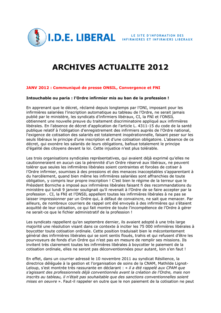 LE SITE D'INFORMATION DES INFIRMIERES ET INFIRMIERS LIBERAUX ARCHIVES ACTUALITE 2012 JANV 2012 : Communiqué de presse ONSIL, Convergence et FNI Intouchable ou paria : l’Ordre infirmier mis au ban de la profession ! En apprenant que le décret, réclamé depuis longtemps par l’ONI, imposant pour les infirmières salariées l’inscription automatique au tableau de l’Ordre, ne serait jamais publié par le ministère, les syndicats d’infirmiers libéraux, CI, la FNI et l’ONSIL obtiennent une nouvelle preuve du traitement discriminatoire appliqué aux infirmières libérales. En l'absence de décret d'application de l'article L. 4311-15 du code de la santé publique relatif à l'obligation d'enregistrement des infirmiers auprès de l'Ordre national, l'exigence de cotisation des salariés est totalement inopérationnelle, faisant peser sur les seuls libéraux le principe d’une inscription et d’une cotisation obligatoire. L’absence de ce décret, qui exonère les salariés de leurs obligations, bafoue totalement le principe d’égalité des citoyens devant la loi. Cette injustice n’est plus tolérable. Les trois organisations syndicales représentatives, qui avaient déjà exprimé qu’elles ne cautionneraient en aucun cas la pérennité d’un Ordre réservé aux libéraux, ne peuvent tolérer que seules les infirmières libérales soient contraintes et forcées de cotiser à l’Ordre infirmier, soumises à des pressions et des menaces inacceptables s’apparentant à du harcèlement, quand bien même les infirmières salariées sont affranchies de toute obligation, y compris leur propre inscription ! C’est bien le régime de la terreur que le Président Borniche a imposé aux infirmières libérales faisant fi des recommandations du ministère qui lundi 9 janvier soulignait qu’il revenait à l’Ordre de se faire accepter par la profession . CI, la FNI et l’ONSIL appellent toutes les infirmières libérales à ne pas se laisser impressionner par un Ordre qui, à défaut de convaincre, ne sait que menacer. Par ailleurs, de nombreux courriers de rappel ont été envoyés à des infirmières qui s’étaient acquitté de leur cotisation, ce qui fait montre de toute l’incompétence de l’Ordre à gérer ne serait-ce que le fichier administratif de la profession ! Les syndicats rappellent qu’en septembre dernier, ils avaient adopté à une très large majorité une résolution visant dans ce contexte à inciter les 75 000 infirmières libérales à boycotter toute cotisation ordinale. Cette position traduisait bien le mécontentement général des infirmières libérales qui se sont sentis floués, trahis et qui refusent d’être les pourvoyeurs de fonds d’un Ordre qui n’est pas en mesure de remplir ses missions. Ils invitent très clairement toutes les infirmières libérales à boycotter le paiement de la cotisation ordinale, elles ne seront pas déconventionnées pour autant, loin s’en faut ! En effet, dans un courrier adressé le 10 novembre 2011 au syndicat Résilience, la directrice déléguée à la gestion et l’organisation de soins de la CNAM, Mathilde LignotLeloup, s’est montrée très rassurante en déclarant : « il a été rappelé aux CPAM que s’agissant des professionnels déjà conventionnés avant la création de l’Ordre, mais non inscrits au tableau, il n’était pas souhaitable que des sanctions conventionnelles soient mises en oeuvre ». Faut-il rappeler en outre que le non paiement de la cotisation ne peut légalement et, en aucun cas, conduire à un déconventionnement de la part de l’Assurance Maladie ? Les infirmières ne doivent donc pas se laisser intimider par un Ordre largement contesté, discrédité de toutes parts et vidé de toute substance par le simple fait qu’il est réduit à une simple instance administrative. Même la déontologie, au sujet de laquelle l’Ordre affirmait encore dans un communiqué en date du 19 décembre être le seul garant, n’est de fait pas reconnue comme faisant partie de ses missions, puisque le code de déontologie ne sera ni validé ni publié par le ministère . Fin novembre, c’était le mandat des conseillers ordinaux nationaux qui a dû être prolongé de 2 ans par le ministère devant l’incapacité de l’Ordre à organiser et à financer ses propres élections. Nous sommes de toute évidence maintenant très éloignés de l’idée d’unification de la profession autour de ses valeurs communes qui a présidé, il faut le rappeler, à la création d’un Ordre. Face à l’acharnement et à la discrimination dont sont victimes les infirmières libérales, les trois syndicats les exhortent à ne pas céder à des peurs dont les fondements s’effondrent les uns après les autres. Pour le chef du bureau de l’exercice, de la déontologie et du développement professionnel continu de la DGOS, Guy Boudet, les infirmières ne seront pas poursuivies pour exercice illégal : « nous travaillons en étroite collaboration avec la chancellerie sur cette question et les procureurs ont reçu des instructions claires à ce sujet ». Dans ce contexte, CI, la FNI et l’ONSIL appellent à une résistance collective et massive des libéraux par le boycott de toute cotisation ordinale réclamée de façon discriminatoire à la fraction minoritaire de la profession sous les menaces et les pressions, ultimes émanations d’une institution ordinale moribonde, mise au ban de la profession par l’attitude de ses dirigeants. JANV 2012 : Fraude, fautes et abus CNAMTS La CNAMTS précise les notions de fraude, faute et abus La définition et le champ des activités relevant de la fraude, de fautes ou d'abus pour l'assurance maladie sont précisés par la Caisse nationale d'assurance maladie des travailleurs salariés (CNAMTS) dans une circulaire diffusée depuis lundi à son réseau de caisses. Cette circulaire de cinq pages vise à harmoniser les pratiques des responsables en charge du contrô