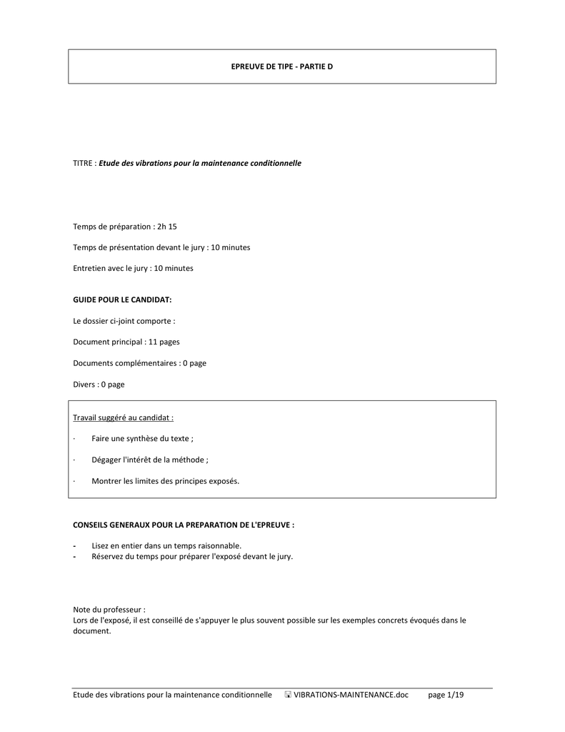 EPREUVE DE TIPE - PARTIE D TITRE : Etude des vibrations pour la maintenance conditionnelle Temps de préparation : 2h 15 Temps de présentation devant le jury : 10 minutes Entretien avec le jury : 10 minutes GUIDE POUR LE CANDIDAT: Le dossier ci-joint comporte : Document principal : 11 pages Documents complémentaires : 0 page Divers : 0 page Travail suggéré au candidat : · Faire une synthèse du texte ; · Dégager l'intérêt de la méthode ; · Montrer les limites des principes exposés. CONSEILS GENERAUX POUR LA PREPARATION DE L'EPREUVE : - Lisez en entier dans un temps raisonnable. Réservez du temps pour préparer l'exposé devant le jury. Note du professeur : Lors de l'exposé, il est conseillé de s'appuyer le plus souvent possible sur les exemples concrets évoqués dans le document. Etude des vibrations pour la maintenance conditionnelle VIBRATIONS-MAINTENANCE.doc page 1/19 1. - Les études des vibrations Toutes les machines en fonctionnement produisent des vibrations. La détérioration du fonctionnement se traduit par une « modification de répartition de l'énergie vibratoire » conduisant le plus souvent à un accroissement du niveau des vibrations. En observant l'évolution de ce niveau, il est par conséquent possible d'obtenir des informations très utiles sur l'état de la machine. L'utilisation des vibrations pour surveiller les machines n'est pas nouvelle - puisque les mécaniciens posaient autrefois leur tournevis sur un moteur pour en « écouter les mouvements internes - mais ces techniques « sensitives » se sont aujourd'hui modernisées grâce à l'apparition de matériels nouveaux, au point de faire de l'étude des vibrations, un des outils les plus utiles à la maintenance moderne. 1.1 - Généralités Le principe de l'analyse des vibrations est basé sur l'idée que les structures de machines, excitées par des efforts dynamiques, donnent des signaux vibratoires dont la fréquence est identique à celle des efforts qui les ont provoqués ; et la mesure globale prise en un point est la somme des réponses vibratoires de la structure aux différents efforts excitateurs. On peut donc, grâce à des capteurs placés en des points particuliers, enregistrer les vibrations transmises par la structures de la machine et, grâce à leur analyse, identifier l'origine des efforts auxquels elle est soumise. De plus, si l'on possède la « signature » vibratoire de la machine lorsqu'elle était neuve, ou réputée en bon état de fonctionnement, on pourra, par comparaison, apprécier l'évolution de son état ou déceler l'apparition d'efforts dynamiques nouveaux consécutifs à une dégradation en cours de développement. La mesure d'une vibration transmise par la structure d'une machine sous l'effet d'efforts dynamiques sera fonction de multiples paramètres que l'on peut séparer en trois groupes 1er groupe Masse, rigidité et coefficient d'amortissement de la structure qui véhicule les vibrations. Caractéristiques de fixation de la machine sur le sol qui oppose des réactions aux vibrations et modifie l'intensité. Positionnement de la prise de mesure. Ces éléments sont généralement regroupés sous le terme de « fonction de transfert » caractéristique de la structure. 2ème groupe Position et fixation du capteur sur la machine. Caractéristiques du capteur. Préamplification et transmission du signal. Performance de l'appareil analyseur. Ces paramètres concernent les caractéristiques de la chaîne de mesure que l'on doit s'efforcer de rendre invariables d'une mesure à l'autre. 3ème groupe Vitesse de rotation et puissance absorbée. Etat des liaisons de la chaîne cinématique (alignement, balourd, engrenages, roulements, etc.). Etude des vibrations pour la maintenance conditionnelle VIBRATIONS-MAINTENANCE.doc page 2/19 1.2 Nature des vibrations Les vibrations mécaniques sont des mouvements oscillant autour d'une position moyenne d'équilibre. Ces mouvements oscillants caractéristiques de l'effort qui les génère, peuvent être, soit périodiques, soit apériodiques (transitoires ou aléatoires) selon qu'ils se répètent ou non, identiquement à eux-mêmes après une durée déterminée. Les vibrations périodiques peuvent correspondre à un mouvement sinusoïdal pur comme celui d'un diapason ou, plus généralement, à un mouvement complexe périodique que l'on peut décomposer en une somme de mouvements sinusoïdaux élémentaires, plus faciles à analyser. Les mouvements sinusoïdaux élémentaires sont appelés « composantes harmoniques » et leurs fréquences sont des multiples entiers de la fréquence du mouvement étudié qui est appelée «fréquence fondamentale» ou fréquence de l'harmonique d'ordre 1. Les vibrations transitoires (comme par exemple la vibration provoquée par un marteau pilon) sont générées par des forces discontinues (chocs). Elles peuvent présenter ou non un aspect oscillatoire revenant à une position d'équilibre après amortissement. Lorsqu'il existe des oscillations, comme pour une structure qui vibre après un choc et pour laquelle le coefficient d'amortissement est faible, on dit qu'il y a un amortissement sub-critique, et le mouvement est pseudo-périodique. Si l'amortissement est très important, la structure revient à sa position d'équilibre sans oscillation, on dit alors que l'amortissement est sur-critique et le mouvement est apériodique. Ces deux types de mouvements transitoires peuvent être décrits par des fonctions mathématiques. Etude des vibrations pour la maintenance conditionnelle VIBRATIONS-MAINTENANCE.doc page 3/19 Les vibrations aléatoires (comme par exemple la vibration générée par le phénomène de cavitation sur une pompe) sont caractérisées par un mouvement oscillant aléatoire qui ne se produit pas identiquement à lui-même comme les mouvements périodiques. Les vibrations aléatoires ne peuvent être représentées mathématiquement que par une série de relations de probabi