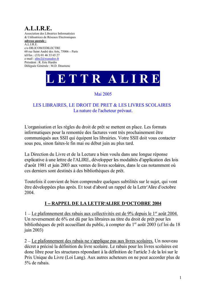 A.L.I.R.E. Association des Librairies Informatisées & Utilisatrices de Réseaux Electroniques adresse postale : A.L.I.R.E. c/o DILICOM/EDILECTRE 60 rue Saint André des Arts, 75006 Paris tél/fax : (33) 01 46 33 65 27 e-mail : [email protected] Président : R. Eric Hardin Déléguée Générale : M.D. Doumenc LETTR ALIRE Mai 2005 LES LIBRAIRES, LE DROIT DE PRET & LES LIVRES SCOLAIRES La nature de l acheteur prévaut. L organisation et les règles du droit de prêt se mettent en place. Les formats informatiques pour la remontée des factures vont très prochainement être communiqués aux SSII qui équipent les librairies. Votre SSII doit vous contacter sous peu, sinon faites-le fin mai ou début juin au plus tard. La Direction du Livre et de la Lecture a bien voulu dans une longue réponse explicative à une lettre de l ALIRE, développer les modalités d application des lois d août 1981 et juin 2003 aux ventes de livres scolaires, dans le cas notamment où ces derniers sont destinés à des bibliothèques de prêt. Toutefois il convient de bien comprendre quelques subtilités sur le sujet, qui vont être développées plus après. Et tout d abord un rappel de la Lettr Alire d octobre 2004. I RAPPEL DE LA LETTR ALIRE D OCTOBRE 2004 1 Le plafonnement des rabais aux collectivités est de 9% depuis le 1er août 2004. Un reversement de 6% est dû par les libraires au titre du droit de prêt pour les bibliothèques de prêt accueillant du public, à compter du 1er août 2003 (cf loi du 18 juin 2003) 2 Le plafonnement des rabais ne s applique pas aux livres scolaires. Un nouveau décret a précisé la définition du livre scolaire. Le rabais pour les livres scolaires est donc libre pour les structures répondant à la définition de l article 3 de la loi sur le Prix Unique du Livre (Loi Lang). Aux autres acheteurs on ne peut accorder plus de 5% de rabais. 1 3 Le fichier FEL est le référentiel. Les ouvrages scolaires y sont clairement identifiés. Le FEL fait référence et autorité. Les libraires, dans leurs relations clientèles pour la vente de livres scolaires et dans le cadre d une concurrence loyale conforme à la loi du 18 juin 2003, s appuient sur un fichier commercial unique le Fichier Exhaustif du Livre (FEL) - présentant des indicateurs fiables et complets. L enrichissement du FEL avec l indicateur Livres scolaires est donc bien une nécessité, dont la qualité voulue par l ALIRE a demandé forcément beaucoup de temps, les éditeurs scolaires n ayant pas tous toujours fait preuve de la même diligence en la matière, pour identifier leurs livres scolaires. Seuls les livres identifiés comme scolaires sur le FEL et destinés à des bénéficiaires de l article 3 de la loi Lang peuvent faire l objet d une remise supérieure à 9%. 4 En cas de doute ou de contestation, interrogez : la CLIL [email protected] qui est le maître d ouvrage du FEL ou DILICOM [email protected] qui est le maître d uvre du fichier. Rappel : le FEL est consultable sur le site DILICOM : www.dilicom.net Votre SSII doit vous proposer un abonnement au FEL et son intégration dans votre réseau informatique. La mention des livres scolaires doit apparaître clairement. II INFORMATIONS NOUVELLES L acquisition de livres scolaires par des bibliothèques relevant du droit de prêt : - le plafonnement à 9% ne s applique pas du fait qu il s agit de livres scolaires, - l achat de livres scolaires est toutefois soumis au reversement du droit de prêt de 6%. Les cas sont rares, mais peuvent exister, et vous devez donc connaître cette subtilité. Application aux livres scolaires de la loi du 18 juin 2003, relative à la rémunération au titre du prêt en bibliothèque. Aux termes de l article 1er de la loi du 18 juin 2003, « la seconde part (de la rémunération au titre du prêt en bibliothèque) est assise sur le prix public de vente hors taxes des livres achetés, 2 pour leurs bibliothèques accueillant du public pour le prêt, par les personnes morales mentionnées au troisième alinéa de l article 3 de la loi du 10 août 1981 ». La loi ne distinguant pas, au sein de ces achats de livres, entre livres scolaires et autres livres, le reversement des 6% au titre de la redevance du droit de prêt, s applique à l ensemble des ouvrages. Tableau récapitulatif Application des lois du 10 août 1981 et du 18 juin 2003 aux livres scolaires : NATURE DE L'ACHETEUR Taux de rabais maximum Reversement des 6% Etat, collectivité territoriale, Etablissement d'enseignement Rabais libre Non, sauf si les achats de livres scolaires sont destinés à des bibliothèques de prêt Association facilitant l'acquisition de livres scolaires par ses membres Rabais libre Non Etablissement de formation professionnelle ou de recherche, syndicat représentatif, comité d'entreprise 9% Oui Personnes morales gérant des bibliothèques accueillant du public 9% Oui Autres (particuliers, associations ) 5% Non Les achats par l Etat, les collectivités locales ou les établissements d enseignement, de livres scolaires destinés à des bibliothèques de prêt. 1 - Les achats de livres scolaires par l Etat, les collectivités locales ou les établissements d enseignement, pourraient ainsi d une part s effectuer avec un taux de rabais supérieur à 9% du prix de vente au public et d autre part être soumis à la contribution au droit de prêt à l achat, dès lors qu ils seraient destinés à des bibliothèques de prêt. L intégralité ou presque des achats de manuels scolaires par l Etat, les collectivités territoriales ou les établissements d enseignement sont destinés à être prêtés, durant l année scolaire, directement aux élèves des écoles, collèges ou lycées. Ces achats, pour lesquels le taux de rabais est libre, ne sont en aucun cas soumis au 3 reversement puisque ce type de prêt ne rentre pas dans le cadre de la loi du 18 juin 2003. 2 - Les achats de livres scolaires destinés aux bibliothèques de lecture publique ou aux bibliot