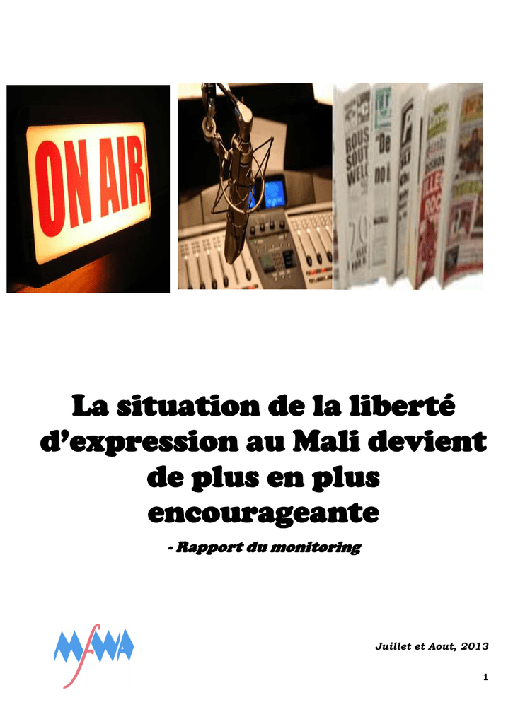 La situation de la liberté d’expression au Mali devient de plus en plus encourageante - Rapport du monitoring Juillet et Aout, 2013 1 I. Introduction: La situation de la Liberté d’Expression, le Développement des Media et la sécurité des journalistes ainsi que la situation générale des droits humains et conditions sociales au Mali, ne cessent de s’améliorer de manière appréciable, selon le rapport du monitoring effectué par la Fondation pour les Media en Afrique de l’Ouest. Les rapports du monitoring recueilli par le réseau des moniteurs de la MFWA au Mali indiquent que les conditions générales des droits humains, de la Liberté d’expression et des activités des media progressent de façon régulière. Ces améliorations louables sont dues aux nombrables interventions et efforts deployées par les militaires ainsi que les organisations et groupes internationaux, régionaux et nationaux. Par exemple, à part des efforts concertés des militaires sous la direction des Francais pour combattre les groupes des insurgés afin de restaurer la paix, les groups des droits de l’homme ont entrepris des activités exceptionnelles en vue de sensibiliser les acteurs politiques, les citoyens et les media en matiere des processus de sécurité et de la construction de la paix. Il est remarquable de noter que les promesses faites par les gouvenements internationaux et les agences des bailleurs des fonds pour doter le Mali d’assisatnce financière (si un governement démocratiqument élu est mis en place ont contribué de maniere significative à l’organisation des élections présidentielles. Il est à espérer que l’élection d’un nouveau président entrainera d’importantes réformes suceptibles de renforcer les structures de la Liberté d’Expression, la liberté de la presse et la situation générale des droits humains au Mali. Le programme du monitoring de la MFWA fait partie d’un projet conjoint initié par la MFWA, l’Institut Panos de l’Afrique de l’Ouest (PIWA) et l’International Media Support (IMS) basé au Copenhague et lance en mai 2013 en vue d’aider à renforcer le media 2 malien aux fins de le rendre capable à contribuer de façon efficace à la construction de la paix et aux processus de démocratisions dans le pays. A l’heure actuelle, la MFWA dispose d’un réseau des moniteurs des droits à la liberté d’expression qui suivent et signalent les incidents de violations des droits à la liberté d’expression au sein du pays. De manière spécifique, les moniteurs sont en mission dans les trois régions du nord du pays, à savoir Gao, Kidal et Tombouctou ainsi que la capitale, Bamako. Le tout dernier rapport du monitoring fait la synthèse des rapports transmis par les moniteurs pour les mois de juillet et aout 2013. Il s’agit du second rapport à être publié par la MFWA. Ce rapport met en exergue les principales questions relatives à la liberté d’expression et à la sécurité des journalistes, à l’état du développement des media et à la situation générale des conditions humaines et sociales au Mali. Le rapport est divisé en sections ci-après indiquées : La situation générale des droits humains et des conditions sociales Le développement des Media La Liberté d’Expression et la Sécurité des journalistes A. La situation générale des Droits humains et conditions Sociales au Mali Principalement, les améliorations constatées en matière de la situation générale des droits humains et conditions sociaux pendant la période du monitoring (juillet et aout) furent caractérisées par les élections présidentielles paisiblement organisées, l’amélioration de sécurité et le retour des réfugiés maliens qui avaient fui le pays à la recherche de sécurité. Il a fallu deux tours d’élections pour élire un président de parmi les 28 candidats au Mali. Le premier tour qui a eu lieu le 28 juillet 2013 n’avait pas abouti puisque aucun des 28 candidats n’avait pas eu les 51% des voix requis. Le deuxième tour du 11 aout 2013 a vu l’élection d’Ibrahim Boubacar Keita avec 71% des voix ; L’élection a été louée par la communauté internationale pour la manière paisible dont elle s’est déroulée et pour le nombre remarquable des électeurs qui y avaient participé. Même dans les trois régions du nord, plus particulièrement à Kidal, ou l’on craignait l’apathie des électeurs, il y avait un nombre impressionnant de participation. 3 » En effet le deuxième tour des élections fut conduite dans le calme et la sérénité » a confirmé le moniteur de la MFWA à Kidal. Le succès des élections a pleinement rassuré les Maliens d’importantes réformes sociales et démocratiques puisque la voie est maintenant ouverte à la gouvernance démocratique. Ce succès donne également un signe positif aux gouvernements internationaux et aux baileurs de fonds que le pays est pret à retrouver son statut démocratique et ainsi ouvrir la porte à l’assistance/ au soutien en provenance de l’extérieur. Nettement, les rapports du monitoring ont indiqué que la situation globale des droits humains au Mali ne cesse de s’améliorer. Plus spécifiquement, on ressent une amélioration considérable de la situation de l’éducation. A titre d’exemple « les étudiants et professeurs des régions du nord ont regagné la salle de classe et sont en train de préparer pour les examens qui devaient se dérouler en juin 2013 mais qu’il a fallu remettre à la fin du mois d’octobre. » Aussi, des réfugiés surtout les femmes et enfants qui avaient fui le pays pour s’installer aux pays voisins comme la Maurétanie et le Niger ont commencé à rentrer. D’après le monitoring, la situation de sécurité s’est améliorée de façon générale, mais dans les régions de nord on constate toujours des défis. Selon nos moniteurs, on pense généralement que quelques groupes des rebelles et bandits qui s