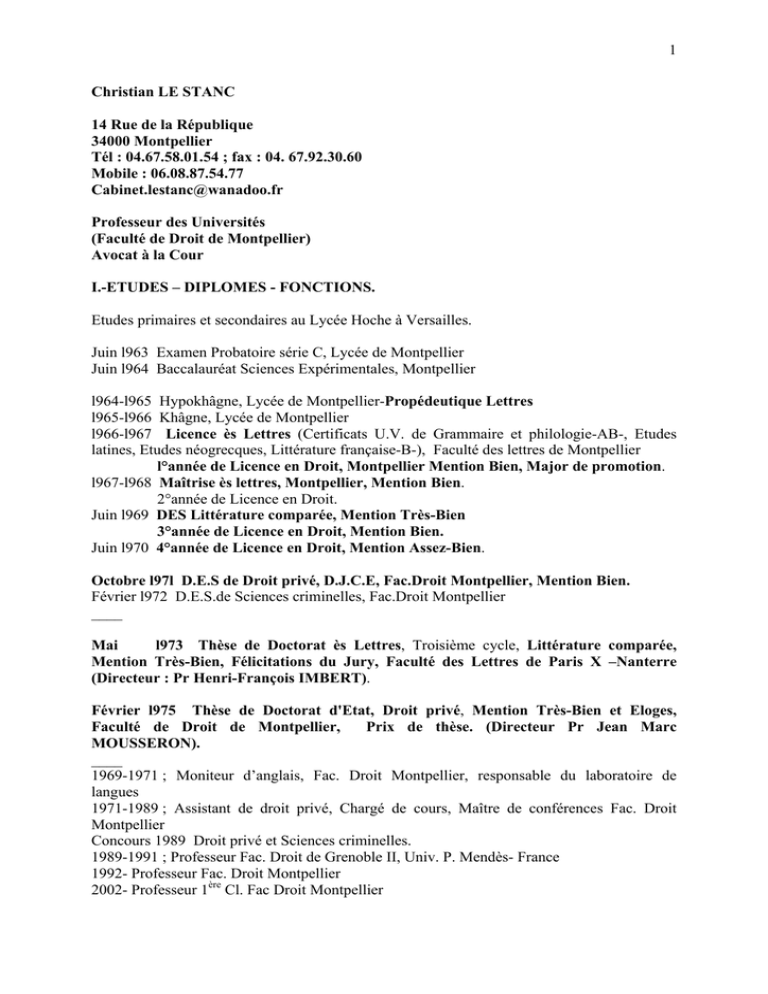 1 Christian LE STANC 14 Rue de la République 34000 Montpellier Tél : 04.67.58.01.54 ; fax : 04. 67.92.30.60 Mobile : 06.08.87.54.77 [email protected] Professeur des Universités (Faculté de Droit de Montpellier) Avocat à la Cour I.-ETUDES – DIPLOMES - FONCTIONS. Etudes primaires et secondaires au Lycée Hoche à Versailles. Juin l963 Examen Probatoire série C, Lycée de Montpellier Juin l964 Baccalauréat Sciences Expérimentales, Montpellier l964-l965 Hypokhâgne, Lycée de Montpellier-Propédeutique Lettres l965-l966 Khâgne, Lycée de Montpellier l966-l967 Licence ès Lettres (Certificats U.V. de Grammaire et philologie-AB-, Etudes latines, Etudes néogrecques, Littérature française-B-), Faculté des lettres de Montpellier l°année de Licence en Droit, Montpellier Mention Bien, Major de promotion. l967-l968 Maîtrise ès lettres, Montpellier, Mention Bien. 2°année de Licence en Droit. Juin l969 DES Littérature comparée, Mention Très-Bien 3°année de Licence en Droit, Mention Bien. Juin l970 4°année de Licence en Droit, Mention Assez-Bien. Octobre l97l D.E.S de Droit privé, D.J.C.E, Fac.Droit Montpellier, Mention Bien. Février l972 D.E.S.de Sciences criminelles, Fac.Droit Montpellier ____ Mai l973 Thèse de Doctorat ès Lettres, Troisième cycle, Littérature comparée, Mention Très-Bien, Félicitations du Jury, Faculté des Lettres de Paris X –Nanterre (Directeur : Pr Henri-François IMBERT). Février l975 Thèse de Doctorat d'Etat, Droit privé, Mention Très-Bien et Eloges, Faculté de Droit de Montpellier, Prix de thèse. (Directeur Pr Jean Marc MOUSSERON). ____ 1969-1971 ; Moniteur d’anglais, Fac. Droit Montpellier, responsable du laboratoire de langues 1971-1989 ; Assistant de droit privé, Chargé de cours, Maître de conférences Fac. Droit Montpellier Concours 1989 Droit privé et Sciences criminelles. 1989-1991 ; Professeur Fac. Droit de Grenoble II, Univ. P. Mendès- France 1992- Professeur Fac. Droit Montpellier 2002- Professeur 1ère Cl. Fac Droit Montpellier 2 II.-TRAVAUX ET PUBLICATIONS Littérature l968 Sociologie des romans de Marivaux, Mém. Maîtrise, dactyl. l20p. l973 Stendhal et les romans "fashionable", Thèse de doctorat en Littérature comparée, dactyl. 420p. Droit l97l Le droit de possession personnelle antérieure sur invention brevetée, Mem.DES, dactyl. l50 p. ____ l974 L'élément intentionnel dans la contrefaçon de brevet, Rapport à la 3°rencontre de Propriété industrielle, Lyon l974, Paris, Litec, Coll. CEIPI, l975( en collaboration avec le Pr J M MOUSSERON). ____ l975 L'acte de contrefaçon de brevet d'invention, Thèse l975, Paris, Litec, coll. CEIPI, l977. l975 La réservation du Know how par le droit de possession personnelle antérieure, rapport à la 5°rencontre de Propriété industrielle, l975, in Le Know how, Paris Litec, l976. ____ l976 V°Propriété industrielle, Juris-classeur notarial, déc.l976, 2 fasc.(en collaboration avec R.FABRE). ____ l977 Existe-t-il une responsabilité postcontractuelle? Chronique au JCP-CI, l978, l2735. ____ l978-l980 Chronique d'Informations rapides -brevets d'invention, Recueil Dalloz (en collaboration avec le Pr. JM MOUSSERON). l978 Dix ans de droit des brevets d'invention in Dix ans de droit de l'entreprise, Paris, Litec l979, p.715 s.(en collaboration avec JM MOUSSERON, J.SCHMIDT, M.VIVANT). l978 L'exception de possession antérieure, rapport au colloque de Lyon, Centre Paul Roubier, l978: "Inventions et droits antérieurs" Paris, Litec, Coll. CEIPI l979, p. l09s. l978 V°Propriété industrielle-Protection internationale, Juris-classeur Chef d'entreprise, oct.l978. l978 (depuis) Rubrique "France" à la European Intellectual Property Review (EIPR), Oxford. Mensuel depuis oct.l978 (jusqu’en 2009). ____ l979 La réforme du droit des brevets d'invention, Loi du l3 juillet l978, Juris-classeur commercial annexe Brevets, fevr.l979, fasc. saumon. l979 La protection des programmes d'ordinateur par le droit d' auteur dans les pays d'Europe continentale, Dossiers Brevets l979 ; Copyright protection for computer software 3 in continental Europe, in"The legal protection for computer software", ESC publishing ltd, Oxford l980. ____ l980 Refonte et codirection avec le Pr.MOUSSERON du Juris-classeur commercial annexe Brevets d'invention. Jusqu’en 1985. l980 V°Transferts de technologie, Juris-classeur Chef d'entreprise, 2 fasc. ____ l981 Le nouveau droit des inventions de salariés, Revue Sciences et Techniques, Janvier l981. l981 The new french law on employees'inventions in ouvrage collectif : Employees' inventions, a comparative study, Fernsway publications, Oxford l98l, p.41 s. l981 Trade secrets law, the protection of Know how in France, EIPR l981,l l981 V° Marques de fabrique, de commerce et de services, Juris-classeur chef d'entreprise, l981 l981 Les inventions de salariés, Juris-classeur Brevets, l fasc. (en collaboration avec JM Mousseron). ____ l982 Programs of video games, protection in France of author's copyright, EIPR l982, Oct. p.293 ____ l983 The protection of computer programs by copyright in France EIPR august l983,222. l983 L'élément légal de l'acte de contrefaçon, JCL Brevets, l fasc. l983 L'élément matériel de l'acte de contrefaçon, JCL Brevets, l fasc. l983 L'élément moral de l'acte de contrefaçon, JCL Brevets, l fasc. l983 Analyse des conditions juridiques et déontologiques applicables aux prestataires de services participant à l'expérience TELETEL, (Minitel) Revue de l'IDATE, p.263. l983 Note au Recueil Dalloz sous Trib. gr. inst. 21 septembre l983, aff. Apple c. Ségimex, D. 1983,79. ____ l984 La protection juridique des logiciels, JCP.CI N°spécial, 1984, 3, p 13 à 27. l984 V°Dessins et modèles, Juris-classeur chef d'entreprise, 1 fasc. ____ l985 La protection du logiciel par les techniques autres que le droit d'auteur, Paris, Intelligencia, 1985. 1985 Comparative advertising in french law, EIPR 1985, febr., p.35 s. l985 Banques de données et