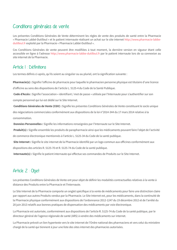 Conditions générales de vente Les présentes Conditions Générales de Vente déterminent les règles de vente des produits de santé entre la Pharmacie « Pharmacie Labbé-Dutilleul » et le patient internaute réalisant un achat sur le site internet http://www.pharmacie-labbedutilleul.fr exploité par la Pharmacie « Pharmacie Labbé-Dutilleul ». Ces Conditions Générales de vente peuvent être modifiées à tout moment, la dernière version en vigueur étant celle accessible en ligne à l’adresse http://www.pharmacie-labbe-dutilleul.fr par le patient internaute lors de sa connexion au site internet de la Pharmacie. Article 1 : Définitions Les termes définis ci-après, qu’ils soient au singulier ou au pluriel, ont la signification suivante : Pharmacie(s) : Signifie l’officine de pharmacie pour laquelle le pharmacien personne physique est titulaire d’une licence d’officine au sens des dispositions de l’article L. 5125-4 du Code de la Santé Publique. Code d’Accès : Signifie l’association « identifiant / mot de passe » utilisée par l’Internaute pour s’authentifier sur son compte personnel qui lui est dédié sur le Site Internet. Conditions Générales de Vente (CGV) : Signifie les présentes Conditions Générales de Vente constituant le socle unique des négociations commerciales conformément aux dispositions de la loi n°2014-344 du 17 mars 2014 relative à la consommation. Données Personnelles : Signifie les informations renseignées par l’Internaute sur le Site Internet. Produit(s) : Signifie ensemble les produits de parapharmacie ainsi que les médicaments pouvant faire l’objet de l’activité de commerce électronique mentionnés à l’article L. 5125-34 du Code de la santé publique. Site Internet : Signifie le site internet de la Pharmacie identifié par un logo commun aux officines conformément aux dispositions des articles R. 5125-70 et R. 5125-74 du Code de la santé publique. Internaute(s) : Signifie le patient internaute qui effectue ses commandes de Produits sur le Site Internet. Article 2 : Objet Les présentes Conditions Générales de Vente ont pour objet de définir les modalités contractuelles relatives à la vente à distance des Produits entre la Pharmacie et l’Internaute. Le Site Internet de la Pharmacie comporte un onglet spécifique à la vente de médicaments pour faire une distinction claire par rapport aux autres Produits vendus par la Pharmacie. Le Site Internet est, pour les médicaments, dans la continuité de la Pharmacie physique conformément aux dispositions de l’ordonnance 2012-1247 du 19 décembre 2012 et de l’arrêté du 20 juin 2013 relatifs aux bonnes pratiques de dispensation des médicaments par voie électronique. La Pharmacie est autorisée, conformément aux dispositions de l’article R. 5125-74 du Code de la santé publique, par le directeur général de l’agence régionale de santé (ARS) à vendre des médicaments sur internet. La Pharmacie prévoit un lien hypertexte vers le site internet de l’Ordre national des pharmaciens et vers celui du ministère chargé de la santé qui tiennent à jour une liste des sites internet des pharmacies autorisées. Article 3 : Modalités d’exécution 3.1 Information - Commande Les informations sur la Pharmacie, conformément aux dispositions de l’arrêté du 20 juin 2013 concernant les médicaments, sont accessibles à tout moment sur l’ensemble des pages du Site Internet par un lien renvoyant à une page dédiée, dans une rubrique qui s’intitule « qui sommes-nous ? ». L’Internaute a accès à un espace privé intitulé « mon compte », par un Code d’Accès, recensant notamment les commandes passées ainsi que l’intégralité de ses échanges avec la Pharmacie. Le Code d’Accès est personnel et confidentiel et ne peut être modifié que sur demande de l’Internaute ou à l’initiative de l’hébergeur agréée des Données Personnelles dans le cadre de sa mission légale et réglementaire et de son agrément. L’information sur le médicament est présentée de façon objective, claire et non trompeuse. Une mention spéciale indiquant que les informations relatives aux précautions d’emploi (interactions médicamenteuses, contre-indications, mises en garde spéciales, effets indésirables) ainsi que la posologie sont détaillées par la notice du médicament. La notice est disponible en format PDF et imprimable. Les photos du conditionnement présentent le médicament tel qu’il est proposé à la vente à la Pharmacie et comportent la mention « photo non contractuelle » . Toutes les photos sont de la même taille et présentent le médicament de façon claire et non ambiguë. Le Site Internet est conçu de façon qu’aucun médicament ne soit vendu sans qu’un échange interactif pertinent ne soit rendu possible avant la validation de la commande. La Pharmacie met en ligne un formulaire dans lequel l’Internaute doit renseigner son âge, son poids, son sexe, ses traitements en cours, ses antécédents allergiques et, le cas échéant, son état de grossesse ou d’allaitement. L’Internaute remplit le formulaire lors de la première commande au cours du processus de validation de la commande. La Pharmacie propose une actualisation du formulaire à chaque commande. La Pharmacie valide le formulaire avant de valider la commande. La Pharmacie propose un dialogue pertinent avec l’Internaute par des moyens sécurisés propres à préserver la confidentialité des échanges. Ce dialogue repose sur l’utilisation de techniques de communication favorisant un échange simultané, tel que l'email et la boîte de dialogue en ligne. Lors des échanges, la Pharmacie s’assure que l’Internaute a bien compris les conseils qui lui ont été prodigués. Lors de la commande, l’Internaute à l’obligation de consulter la notice du médicament qui s’affiche systématiquement au cours du processus de la commande. La Pharmacie, lorsq