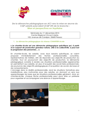 De la démarche pédagogique en ACI vers la mise en œuvre du CQP salarié polyvalent (CQP SP) de la branche : Bilan et perspectives en Aquitaine Séminaire du 1er décembre 2015 Centre Régional Vincent Merle, 102, avenue de Canéjan, 33600 Pessac 1. La démarche pédagogique du réseau CHANTIER école « Le chantier-école est une démarche pédagogique spécifique qui, à partir d’un support de production grandeur nature, utile à la collectivité, a pour but la progression des personnes… ». En chantier-école, les salariés, avec leurs besoins spécifiques, se voient proposer immédiatement des tâches professionnelles concrètes, représentatives de métiers, afin de répondre aux objectifs de production du chantier. Tout en poursuivant des objectifs de production, la démarche pédagogique consiste à rendre ces situations professionnelles apprenantes en permettant aux salariés, en plus d’acquérir des savoir-faire professionnels, de poursuivre des objectifs pédagogiques d’acquisition de savoirs de base et de comportements. L’ancrage dans la réalité professionnelle, rend les situations formatives plus mobilisatrices, plus motivantes pour des adultes, en donnant un sens aux apprentissages de base que les situations professionnelles génèrent. Ainsi, en chantier-école, chaque tâche professionnelle peut donc être un prétexte pour organiser et accompagner une séance d’apprentissage. De gauche à droite : Isabelle ZAOUI, directrice du GARIE, Éric BROUCARET, Président de CHANTIER école Aquitaine, Luis SEMEDO, délégué national de CHANTIER école national 1 Des outils pédagogiques CHANTIER école Pour faciliter les apprentissages puis l’évaluation des acquis en situation de travail dans le but d’attester des compétences professionnelles, voire de permettre la certification de compétences professionnelles, CHANTIER école a développé une ingénierie pédagogique qui a conduit à l’élaboration de 4 types d’outils pour mieux répondre aux exigences de la formation des salariés en insertion (axe 3) : Des référentiels traduits en « livrets de suivi », indispensables pour le repérage, l’évaluation et l’attestation des acquis. Des « guides d’apprentissage » pour accompagner les salariés à l’accès aux comportements et aux connaissances de base par la réalisation des tâches professionnelles. Des « fiches d’expérience professionnelle » pour accompagner les personnes dans l’expression et la valorisation de leurs acquis. Des supports « d’attestation de compétences professionnelles » pour faciliter la synthèse et la formalisation des compétences acquises en situation de travail. Un portefeuille de compétences CHANTIER école Le portefeuille CHANTIER école permet la capitalisation des acquis de la personne. Il rassemble l’ensemble des outils ayant permis l’évaluation et l’attestation des compétences tout au long de son parcours en chantierécole. Il permet ainsi de garder une trace des actions réalisées et des compétences développées. C’est un moyen de valorisation des acquis pour faciliter : L’écriture d’un curriculum vitae La préparation d’un entretien avec un employeur potentiel L’élaboration d’un parcours de formation complémentaire L’accompagnement vers la certification des compétences professionnelles Les activités du chantier permettent aux salariés d’acquérir et de mettre en œuvre des capacités qui se traduisent par le développement de compétences professionnelles. 2. La formation des permanents à la démarche pédagogique « Réussir un chantier-école » La formation-action « Réussir un chantier-école » pour s’approprier la démarche pédagogique et les outils était, jusqu’en 2013, constituée de 12 jours répartis en 5 modules de formation. Les encadrants techniques, directeurs et accompagnateurs des ACI étaient mobilisé pendant presque un an pour s’approprier l’ingénierie de qualification et développer l’ingénierie de formation en chantier-école, en s'appuyant sur les supports de production des chantiers. La première formation à la démarche pédagogique en Aquitaine a démarré en 2012 sur le département des Pyrénées-Atlantiques. 2 Depuis 2012, 4 sessions de formation ont eu lieu (deux en Pyrénées Atlantiques et deux en Gironde). Au total, 49 stagiaires en provenance de 21 ACI aquitains ont suivi la démarche. 3. De la mise en œuvre de la démarche pédagogique vers la certification des compétences des salariés polyvalents en ACI Le Certificat de Qualification Professionnel Salarié Polyvalent (CQP SP) de la branche ACI Suite à une décision en date de novembre 2011, la CPNEFP1 de la branche des ACI a sollicité le réseau CHANTIER école aux fins de structurer l’ingénierie d’un certificat de qualification professionnelle (CQP) visant à certifier les compétences acquises par les salariés polyvalents en situation de production. 1 Commission Nationale Paritaire Emploi Formation Professionnelle 3 A l’issue de plusieurs réunions, la CPNEFP a validé, en date du 14 février 2013 le référentiel de certification et l’organisation des jurys permettant de lancer le dispositif d’accès au CQP au niveau national. Le CQP est accessible à tous les salariés polyvalents dont les structures relèvent de la branche ACI et souhaitant faire reconnaître leur maîtrise d’un socle de compétences en matière de savoirs de base, savoir être, savoirs procéduraux et professionnels liés à une situation de production. Pour favoriser l’accès au CQP salarié polyvalent, une formation adaptée aux besoins de chaque salarié est mise en place dans une triple alternance intégrant des temps de formation en situation de production, des temps de formation en salle et une période d’immersion en entreprise. Les temps de formation bénéficient, pour les structures relevant de la branche et cotisant à UNIFORMATION, d’un financement assuré