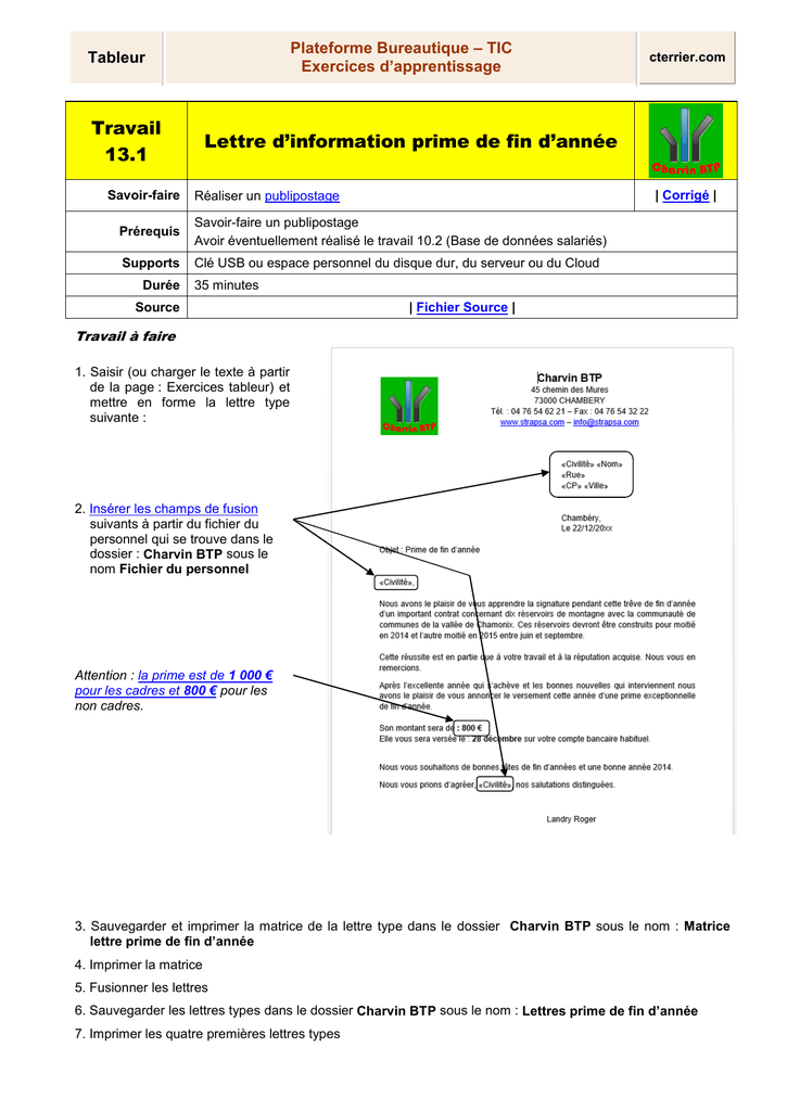Plateforme Bureautique – TIC Exercices d’apprentissage Tableur Travail 13.1 Savoir-faire Lettre d’information prime de fin d’année | Corrigé | Réaliser un publipostage Prérequis Savoir-faire un publipostage Avoir éventuellement réalisé le travail 10.2 (Base de données salariés) Supports Clé USB ou espace personnel du disque dur, du serveur ou du Cloud Durée cterrier.com 35 minutes Source | Fichier Source | Travail à faire 1. Saisir (ou charger le texte à partir de la page : Exercices tableur) et mettre en forme la lettre type suivante : 2. Insérer les champs de fusion suivants à partir du fichier du personnel qui se trouve dans le dossier : Charvin BTP sous le nom Fichier du personnel Attention : la prime est de 1 000 € pour les cadres et 800 € pour les non cadres. 3. Sauvegarder et imprimer la matrice de la lettre type dans le dossier Charvin BTP sous le nom : Matrice lettre prime de fin d’année 4. Imprimer la matrice 5. Fusionner les lettres 6. Sauvegarder les lettres types dans le dossier Charvin BTP sous le nom : Lettres prime de fin d’année 7. Imprimer les quatre premières lettres types
