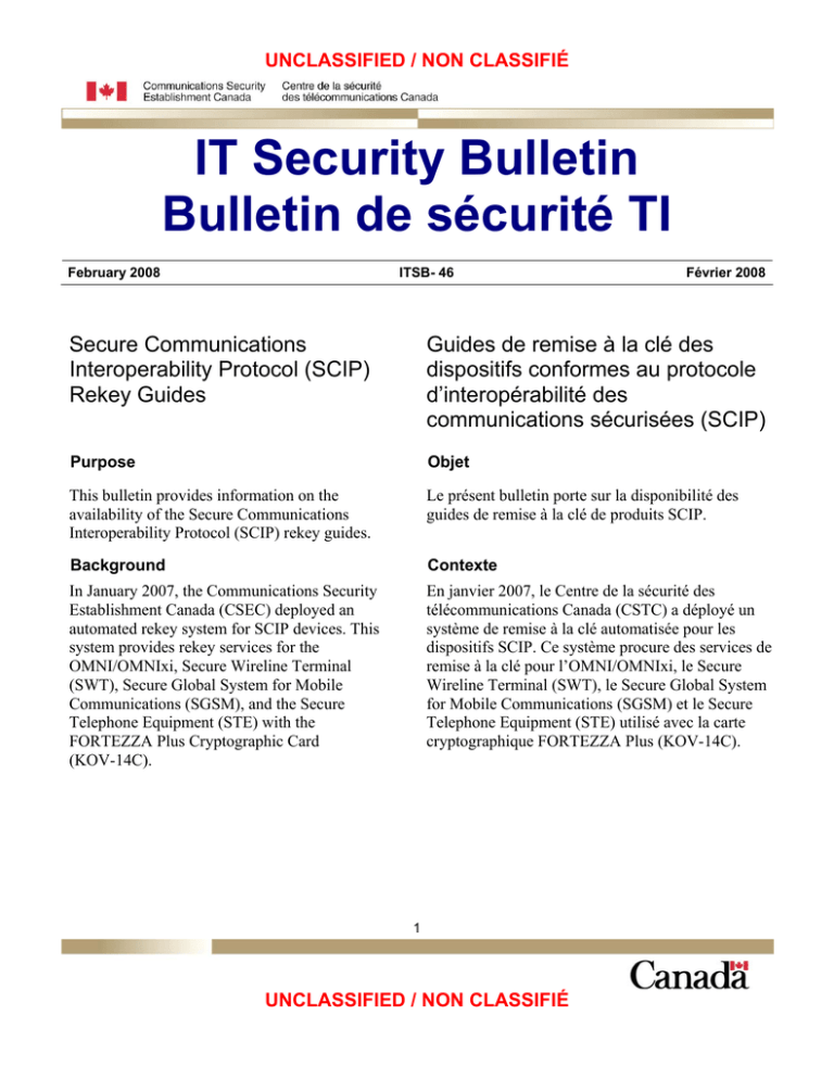UNCLASSIFIED / NON CLASSIFIÉ IT Security Bulletin Bulletin de sécurité TI February 2008 ITSB- 46 Février 2008 Secure Communications Interoperability Protocol (SCIP) Rekey Guides Guides de remise à la clé des dispositifs conformes au protocole d’interopérabilité des communications sécurisées (SCIP) Purpose Objet This bulletin provides information on the availability of the Secure Communications Interoperability Protocol (SCIP) rekey guides. Le présent bulletin porte sur la disponibilité des guides de remise à la clé de produits SCIP. Background Contexte In January 2007, the Communications Security Establishment Canada (CSEC) deployed an automated rekey system for SCIP devices. This system provides rekey services for the OMNI/OMNIxi, Secure Wireline Terminal (SWT), Secure Global System for Mobile Communications (SGSM), and the Secure Telephone Equipment (STE) with the FORTEZZA Plus Cryptographic Card (KOV-14C). En janvier 2007, le Centre de la sécurité des télécommunications Canada (CSTC) a déployé un système de remise à la clé automatisée pour les dispositifs SCIP. Ce système procure des services de remise à la clé pour l’OMNI/OMNIxi, le Secure Wireline Terminal (SWT), le Secure Global System for Mobile Communications (SGSM) et le Secure Telephone Equipment (STE) utilisé avec la carte cryptographique FORTEZZA Plus (KOV-14C). 1 UNCLASSIFIED / NON CLASSIFIÉ UNCLASSIFIED / NON CLASSIFIÉ February 2008 ITSB-46 Février 2008 Additional Rekey Resources Ressources additionnelles During the deployment of the rekey system, one page rekey guides were distributed to Government of Canada (GC) COMSEC custodians for onwards distribution to SCIP End Crypto Unit (ECU) users. A number of additional rekey guidance resources have been prepared and are ready for distribution. The new rekey information resources available include: Durant le déploiement du système de remise à la clé, les gardiens COMSEC du gouvernement du Canada (GC) ont reçu des guides d’une page pour qu’ils les distribuent à leur tour aux utilisateurs des unités cryptographiques de destination (ECU pour End Crypto Unit) SCIP. Un certain nombre de ressources additionnelles sur la remise à la clé ont été préparées depuis, à savoir : 1. Detailed Rekey Guide: This guide describes the steps required to rekey an ECU and the ECU display responses, in greater detail than previously provided in the one page guides. This long guide also describes in detail the specific differences a user will experience between the various types of ECUs. This detailed rekey guide has been attached as Annex A to this bulletin. 1. Guide détaillé de remise à la clé : Ce guide décrit la marche à suivre pour remettre à la clé une ECU, de même que les messages affichés par l’ECU, de façon plus détaillée que dans les guides d’une page distribués à l’origine. Il décrit également les différences auxquelles l’utilisateur peut s’attendre à retrouver entre les diverses ECU. Un exemplaire du guide détaillé est joint comme Annexe A du présent bulletin. 2. Rekey Phone Numbers Card: Phone number cards containing the Canadian national rekey phone number and the US Combined Communications Electronic Board (CCEB) phone number (for CCEB, NATO and Coalition key). This card will provide easy and fast access to these numbers for SCIP ECU users. These cards must not be affixed to SCIP equipment. 2. Carte des numéros de téléphone pour la remise à la clé : Cartes sur lesquelles figurent les numéros de téléphone à composer pour remplacer les clés nationales canadiennes et les clés américaines de la Combined Communications Electronic Board (CCEB, OTAN et coalition). La carte permettra aux utilisateurs des dispositifs SCIP de toujours avoir ces numéros à portée de la main. Les cartes ne doivent pas être apposées sur le matériel SCIP. 3. Rekey Guides on the CSEC Web Site: The long and short rekey guides will be posted on the CSEC web site and available for download to all GC SCIP ECU clients. The site location is: 3. Guides de remise à la clé sur le site Web du CSTC : Les versions longues et abrégées des guides de remise à la clé seront publiées sur le site Web du CSTC et aux fins de téléchargement par tous les clients du GC qui utilisent des ECU SCIP. Le site se trouve à l’adresse suivante : http://www.cse-cst.gc.ca/publications/govpubs/itsb/itsb-e.html#scip_rekey 2 UNCLASSIFIED / NON CLASSIFIÉ UNCLASSIFIED / NON CLASSIFIÉ February 2008 ITSB-46 Février 2008 http://www.cse-cst.gc.ca/publications/gov-pubs/itsb/itsbf.html#remise_a_la_cle_scip Distribution Strategy Stratégie de distribution Departmental custodians are asked to give the rekey guides and the rekey phone number cards the widest possible distribution. Custodians are also asked to ensure that information on the availability of the rekey guides on the CSEC web site is also forwarded to SCIP ECU users. Les gardiens des ministères sont priés de faire une distribution aussi large possible des guides et des cartes de remise à la clé. On leur demande également d’informer les utilisateurs d’ECU SCIP sur la disponibilité des guides sur le site du CSTC. Contacts and Assistance Aide et renseignements For further information or guidance please contact the Crypto Material Assistance Centre (CMAC) at (613)991-8600 or [email protected]. Pour de plus amples renseignements ou pour des conseils, prière de communiquer avec le Centre d’assistance en matière de matériel cryptographique (CAMC) au 613-991-8600 ou [email protected]. La directrice de la Gestion de la mission de la Sécurité des TI, Originally signed by / Signé initialement par ______________________________________ Gwen Beauchemin Director, IT Security Mission Management 3 UNCLASSIFIED / NON CLASSIFIÉ