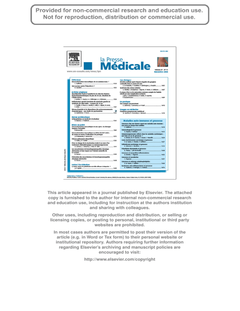 This article appeared in a journal published by Elsevier. The attached copy is furnished to the author for internal non-commercial research and education use, including for instruction at the authors institution and sharing with colleagues. Other uses, including reproduction and distribution, or selling or licensing copies, or posting to personal, institutional or third party websites are prohibited. In most cases authors are permitted to post their version of the article (e.g. in Word or Tex form) to their personal website or institutional repository. Authors requiring further information regarding Elsevier’s archiving and manuscript policies are encouraged to visit: http://www.elsevier.com/copyright Author's personal copy en ligne sur / on line on www.em-consulte.com/revue/lpm www.sciencedirect.com Schizophrénies et réactivité à la douleur Revue systématique Presse Med. 2008; 37: 1561–1568 ß 2008 Elsevier Masson SAS. Tous droits réservés. Olivier Bonnot1,2, Sylvie Tordjman2 1. Centre référent maladies rares à expression psychiatrique, Service de psychopathologie de l’enfant et de l’adolescent, APHP, Groupe Hospitalier Pitié Salpêtrière, 47-83 boulevard de l’hôpital, F-75013 Paris, France 2. Laboratoire CNRS psychologie de la perception, Université Paris 5 & Service hospitalo-universitaire de psychiatrie de l’enfant et de l’adolescent de Rennes, France Reçu le 21 novembre 2007 Accepté le 7 mai 2008 Correspondance : Disponible sur internet le : 6 septembre 2008 Olivier Bonnot, Service de psychiatrie de l’enfant et de l’adolescent, APHP, Groupe Hospitalier Pitié Salpêtrière, 47-83 boulevard de l’hôpital, F-75013 Paris, France. [email protected] Schizophrenia and pain reactivity Introduction > Medical practitioners do not for a long time pay enough attention to patient’s pain. This approach is in the line of society feelings. Pain was long consider to be a contingency to withstand as showed in Christian’s bible or Stoicism’s principle. Changes in mentality appear in present times. It Seems obvious that for sociological and scientific reasons pain’s care in medical and psychiatric disorders is now an important subject. Recent research in autistic disorders suggest that insensitivity observed in autism is not and analgesic phenomenon but a different behavioural reactivity to pain. Prevalence of schizophrenic disorder is from 0.5 to 1%. It is also a complex disorder that has defied decades of concerted efforts to uncover its origins and attenuate its symptoms. The most promising hypotheses suggest that neurodevelopmental impairment increases the risk of later schizophrenia. Most of recent researches in this topic did focus to trait or state markers. According to the vulnerability models of schizophrenia, trait marker are clinical, psychological, physiological, anatomical or cognitive impairments found in patients with schizophrenia during all the course of the illness and even before the onset. Several lines of evidence (case report, epidemiological studies, experimental studies) suggest that patients with schizophrenia shows a relative insensitivity to physical pain. We will tome 37 > n811 > novembre 2008 doi: 10.1016/j.lpm.2008.05.013 Résumé Introduction > La réactivité à la douleur chez les patients schizophrènes est fortement suggérée par la pratique clinique et des études de cas, en particulier dans la littérature historique. Il n’existe pas de consensus sur les mécanismes en cause. Méthode > Nous avons utilisé les moteurs de recherche Medline/ Oldmedline nous permettant d’identifier 50 articles que nous avons classés en 3 groupes : 30 articles cliniques ou épidémiologiques ; 15 articles expérimentaux ; 5 revues de la littérature. Résultats > L’analyse de la littérature ne permet pas de conclure à une réelle analgésie chez les schizophrènes mais plus sûrement à un mode d’expression différent de la douleur, en lien avec la pathologie. Cependant, des études expérimentales intégrant électrophysiologie, aspect neurovégétatif et comportement sont nécessaires. Les hypothèses seront discutées ainsi que les implications pratiques de ce phénomène. Cette discussion permettra de dégager et de proposer de nouvelles perspectives de recherche. 1561 Summary Author's personal copy O Bonnot, S Tordjman review and critic the scientific literature in this specific topic. We will see if datas are relevant with the neurodevelopmental hypothesis and vulnerability models. Methods > An OLDMEDLINE/MEDLINE query was performed to identify 50 articles relevant to our subject. 9 were case report or case series, 21 were clinical or epidemiological studies, 15 were experimental studies and we also found 5 previous review. Results > Clinical and experimental data strongly suggest a decrease of Behavioural Reactivity to Pain (BRP) but there is a lack of argument to prove a real analgesia. Because schizophrenia is a severe decease with impairment in communication and social skills it may be very difficult to affirm that the insensitivity to pain does really exist for patients. It seems inappropriate at this point to speak about insensitivity or analgesia. We could hypothesis that the decrease of BRP is less a consequence of analgesia than a different way to express emotion in general and pain in particular. It is well known that patients with schizophrenia show communication and thinking impairment, not adapted social skills and also a lack of body representation. However, this decrease of behavioural response seems to be frequent and may be explore by objective research protocol to understand if patients don’t feel pain or probably don’t express pain by adapted social skills. Furthermore, decrease of BRP may take place in a comprehensive theory of schizophrenia. in the line of stress-vulnerability model. Impairment or lack of behavioural pain reactivity could induce an increasing anxiety level for patient with vulnerabil