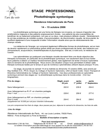 STAGE PROFESSIONNEL DE Photothérapie syntonique Résidence Internationale de Paris 14 – 15 octobre 2006 La photothérapie syntonique est une forme de thérapie non-invasive, en mesure d’apporter des améliorations majeures à des patients soigneusement choisis. Les patients les plus susceptibles de bénéficier de ce traitement présentent, non pas un ou deux, mais plusieurs défauts visuels. Généralement, ils ont des problèmes de mobilité oculaire, d’accommodation, de discrimination visuelle, de binocularité; ils souffrent également d’une incapacité à traiter l’information visuelle ainsi que de rétrécissements des champs visuels. La médecine de l’énergie, qui comprend également différentes formes de photothérapie, est en train de devenir rapidement un phénomène global utilisé par divers professionnels de santé, des médecins aux chiropracteurs, acupuncteurs, kinésithérapeutes et psychologues. Elle est, à notre avis, la médecine de l’avenir. Les optométristes qui pratiquent une thérapie visuelle devraient faire une étude objective des thérapies lumineuses, en particulier de la photothérapie syntonique, non seulement dans le but d’aider leurs patients à obtenir un meilleur fonctionnement global, mais également de tenter d’inclure l’optométrie dans le domaine de la photothérapie. Nous avons une situation unique nous permettant d’utiliser cette thérapie lumineuse testée par le temps et que de nombreux optométristes utilisent depuis presque 70 ans. Ce stage, (la journée du samedi 14 et la matinée du dimanche 15 octobre 2006), sera animé par Ray Gottlieb O.D., PH.D, Doyen du College of Syntonic Optometry, USA et Sarah Cobb, Vision Therapist et Directrice Administrative du College of Syntonic Optometry.. Ces deux professionnels en optométrie syntonique animent des stages sur la photothérapie syntonique dans le monde entier. (Voir leur biographies). Prix du stage : Réglé avant 30 juin après 1er juillet après 1er Septembre Sans hébergement .......................................... 202 € 235 € 254 € Avec hébergement au R.I.P. en chambre partagée Pour 1 nuit ...................................................... 228 € 258 € 277 € Avec hébergement au RIP, en chambre partagée Pour 2 nuits ..................................................... 254 € 284 € 298 € (Supplément de 18.50€ par nuit pour chambre individuelle) Les prix comprennent les frais du stage, deux pauses par jour, déjeuner le samedi et le dimanche, les frais de salle. .Lieu du stage : Résidence Internationale de Paris, 44, rue Louis Lumière, 75020 Paris, Métros : Porte de Bagnolet ou Porte de Montreuil Bulletin d’inscription ci-après Association L’Art de Voir, Pour tout renseignement : Téléphone 06 70 93 07 18 ou Email : [email protected] Le bulletin d’inscription peut-être téléchargé en vous rendant sur le site de l’association L’Art de Voir : www.artdevoir.asso.fr/xlagenda323/index.php#evenements L’admission à ce stage sera définitive après réception de votre bulletin d’inscription dûment rempli, signé et accompagné de votre chèque. Bulletin d’inscription Stage de Photothérapie Syntonique 14 et 15 octobre 2006, Paris animé par Ray Gottlieb O.D., PH.D et Sarah Cobb, Vision Therapist Mr □ Mme □ Mlle □ NOM ........................................... Prénom ................................................ Profession ....................................................................... Téléphone ............................................ Email ................................................................................ Fax ....................................................... Adresse ........................................................................................................................................... Code Postal .................................. Ville ........................................... Pays ................................. Je choisis la formule : réglée avant 30 juin après 1er juillet après 1er septembre □ Stage sans hébergement : 202 € 235 € 254 € □ Stage avec hébergement 1 nuit 228 € 258 € 277 € □ Stage avec hébergement 2 nuits 254 € 284 € 298 € Règlement par chèque à l’ordre de l’Association L’Art de Voir A adresser avec ce bulletin au : Hameau de Tournefort, F – 13840 Rognes Date et signature : ................................................................................................................ Association L’Art de Voir Hameau de Tournefort F – 13840 Rognes Tel : +33 (0)6 70 93 07 18 / Email : [email protected] Site : www.artdevoir.asso.fr N° Siren : 481 434 397, N° Siret : 481 434 00016, Code APE : 913E Ray Gottlieb : Optométriste fonctionnel, Ray Gottlieb, O.D., PH.D., FCOVD, FCSO, est connu pour son travail innovant dans l’éducation visuelle holistique, particulièrement en ce qui concerne le strabisme, l’amblyopie, les problèmes visio-moteurs et visio-perceptuels, la myopie, la presbytie, les lésions cérébrales et le stress visuel. Il est leader dans le développement de la thérapie par les lumières de couleur (syntonique) pour les troubles visuels et neurologiques. Il est actuellement doyen du College of Syntonic Optometry. Son expérience dans l’enseignement comprend deux écoles d’optométrie, une école médicale en ophtalmologie, deux hôpitaux psychiatriques ainsi que le département de piano d’une école de musique. Il était rédacteur de recherche et directeur général du Brain/Mind Bulletin, un bulletin concernant le cerveau et la société. En tant que jeune optométriste, Ray a utilisé la méthode Bates pour vaincre sa myopie, et plus tard, la presbytie. Il explore depuis de nombreuses années l’aspect holistique de l’amélioration visuelle en se formant à la thérapie de massage professionnel et en partageant un cabinet avec Meir Schneider au début de leur
