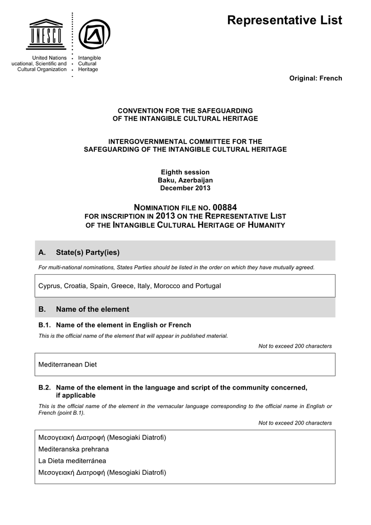 Representative List Original: French CONVENTION FOR THE SAFEGUARDING OF THE INTANGIBLE CULTURAL HERITAGE INTERGOVERNMENTAL COMMITTEE FOR THE SAFEGUARDING OF THE INTANGIBLE CULTURAL HERITAGE Eighth session Baku, Azerbaijan December 2013 NOMINATION FILE NO. 00884 FOR INSCRIPTION IN 2013 ON THE REPRESENTATIVE LIST OF THE INTANGIBLE CULTURAL HERITAGE OF HUMANITY A. State(s) Party(ies) For multi-national nominations, States Parties should be listed in the order on which they have mutually agreed. Cyprus, Croatia, Spain, Greece, Italy, Morocco and Portugal B. Name of the element B.1. Name of the element in English or French This is the official name of the element that will appear in published material. Not to exceed 200 characters Mediterranean Diet B.2. Name of the element in the language and script of the community concerned, if applicable This is the official name of the element in the vernacular language corresponding to the official name in English or French (point B.1). Not to exceed 200 characters Μεσογειακή Διατροφή (Mesogiaki Diatrofi) Mediteranska prehrana La Dieta mediterránea Μεσογειακή Διατροφή (Mesogiaki Diatrofi) La Dieta Mediterranea ( ﱢAttibakha al Moutaouassittiya) ﺍاﻟﻁطﺑَﺎﺧﺔ ﺍاﻝلﻡمﺕتﻭوﺱسﻁطﻱيﺓة A Dieta Mediterrânica B.3. Other name(s) of the element, if any In addition to the official name(s) of the element (point B.1) mention alternate name(s), if any, by which the element is known. C. Name of the communities, groups or, if applicable, individuals concerned Identify clearly one or several communities, groups or, if applicable, individuals concerned with the nominated element. Not to exceed 150 words The community represented by the element, in the framework of this nomination, is all national communities in the seven States Parties submitting it though, in the general context, it relates to the communities of the Mediterranean basin that found their identity and continuity in great part on the collective and ancestral experience of the Mediterranean Diet – the result of constant sharing, know-how, traditions and symbols transmitted from generation to generation, of cultural and social sharing and of a rich palette of regional tones. To ensure a more detailed and accurate approach, we have identified seven emblematic communities: the Mediterranean Diet is still alive, transmitted, protected and celebrated by the communities that recognize it as part of their common intangible cultural heritage: Agros (Cyprus), Brač and Hvar (Croatia), Soria (Spain), Koroni/Coroni (Greece), Cilento (Italy), Chefchaouen (Morocco), Tavira (Portugal). D. Geographical location and range of the element Provide information on the distribution of the element, indicating if possible the location(s) in which it is centred. If related elements are practised in neighbouring areas, please so indicate. Not to exceed 150 words The geographic location of the element falls within the territorial boundaries of the seven States Parties and involves their respective human communities. We specify the geographic location of the seven emblematic communities: -Agros (Αγρός)/Cyprus: 806 h (2012) village, in the centre of the island, on the Troodos mountain range, Pitsilia region. -Brač and Hvar/Croatia: islands of Central Dalmatia. Brač covers 13,012 h (2001) and 395 km2 and Hvar covers approximately 12,000 h and 300 km2. Brač is the largest island in Central Dalmatia. -Soria/Spain: capital of the province of the same name, located in north-eastern Spain. It covers 271 km2 and has a population of 39,987 people (2011). -Koroni/Coroni: town in Messenia, Peloponnese, Greece. Seat of Koroni county, belonging to Pylos-Nestoros municipality, covers 105,163 km2 and has a population of 5,067 people (2001). -Cilento/Italy: sub-region of Campania, southern Italy, covers 24,400 km2 and has a population of 269,759 people (2007). -Chefchaouen/Morocco: capital of the province and located in northwest Morocco, covers RL2013 – No. 00884 – page 2 435,000 ha and has a population of 54,562 people. -Tavira/Portugal: capital of the municipality of the same name, located in the Algarve, Portugal, covers 611 km2 and has a population of 26,167 people (2011). E. Contact person for correspondence Provide the name, address and other contact information of the person responsible for correspondence concerning the nomination. If an e-mail address cannot be provided, indicate a fax number. For multi-national nominations provide complete contact information for one person designated by the States Parties as the main contact person for all correspondence relating to the nomination, and for one person in each State Party involved. Coordonnateur : Portugal/Tavira Title (Ms/Mr, etc.): Family name: Given name: Institution/position: Address: Telephone number: Fax number: E-mail address : Other relevant information: M. QUEIROZ Jorge Municipalité de Tavira / Directeur du Département de Culture, Patrimoine et Tourisme Praça da República - 8800-951 Tavira – Portugal + 351 281 320 545 + 351 281 322 888 [email protected] Coordonnateurs at the national level : Cyprus/Agros: Titre (Mme/M., etc.) : Nom de famille : Prénom : Institution/fonction : Adresse : Numéro de téléphone : Numéro de fax : Adresse électronique : Mme. STYLIANOU Olympia Ministère de l’Education et de la Culture – Secrétaire Permanente du Ministère de l’Education et de la Culture Kimonos and Thoukididou Corner - Akropolis 1434 - Nicosie Cyprus +357 22800607 +357 22305974 [email protected], [email protected] Croatia/Brač et Hvar: Titre (Mme/M., etc.) : Nom de famille : Prénom : Institution/fonction : Adresse : Numéro de téléphone : Numéro de fax : Adresse électronique : Mme RADATOVIĆ-CVITANOVIĆ Katarina Ministère de la culture - Direction de la protection du patrimoine culturel - Département du patrimoine mobilier et immobilier Runjaninova ulica 2, 10000 Zagreb - Cro