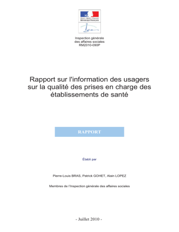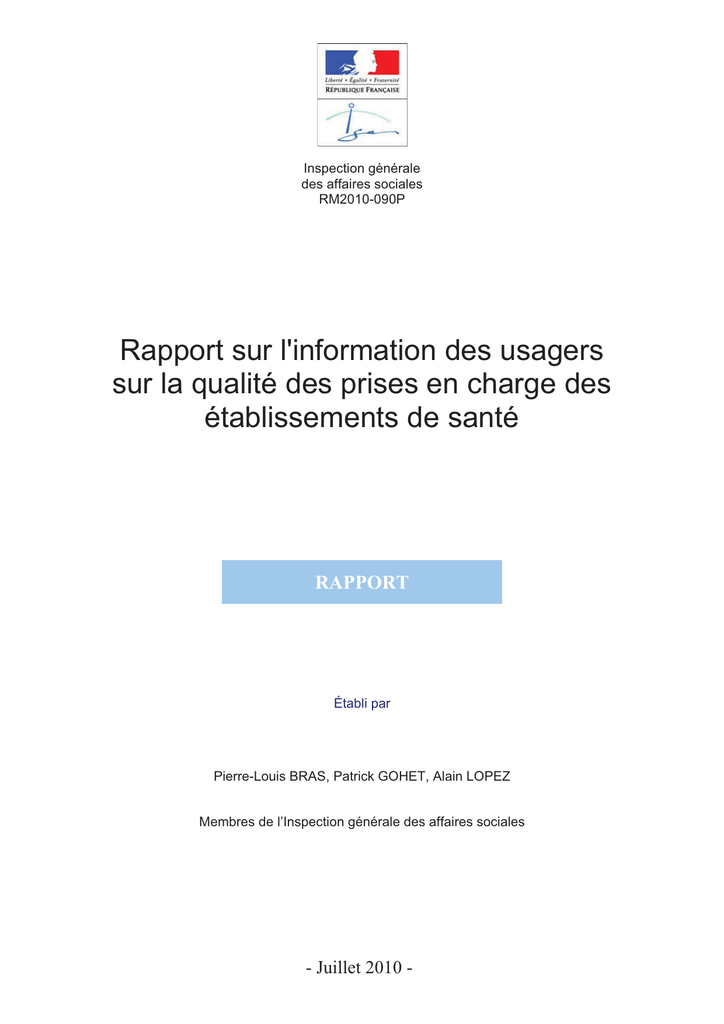 Inspection générale des affaires sociales RM2010-090P Rapport sur l'information des usagers sur la qualité des prises en charge des établissements de santé RAPPORT Établi par Pierre-Louis BRAS, Patrick GOHET, Alain LOPEZ Membres de l’Inspection générale des affaires sociales - Juillet 2010 - Synthèse L'IGAS a inscrit à son programme de travail une mission d'évaluation consacrée à l'information des usagers sur la qualité des prises en charge dans les établissements de santé. Dans le cadre de cette mission, l'usager a été considéré, d'une part comme un "consommateur" qui souhaite exercer de manière éclairée son droit au "libre choix" d'un établissement, d'autre part comme un "citoyen" qui, doté d'un mandat de représentation, intervient pour améliorer la qualité des prises en charge. La question de l'information du patient sur son cas personnel n'entre pas dans le cadre de ce rapport. L'examen de la situation française montre que les informations diffusées vers le grand public à l'initiative des pouvoirs publics sont actuellement très pauvres. Même si les indicateurs de processus se développent, il n'existe pas de données sur les résultats. L'information disponible est rarement présentée sous une forme comparative. La satisfaction des patients n'est pas mesurée de manière homogène. Les données ne sont pas présentées sous une forme synthétique et agrégée. Les informations sont dispersées sur plusieurs sites et sont d'accès difficiles. Les sites ne sont pas conçus pour faciliter les recherches et les comparaisons. Cette relative pauvreté de l'information d'origine publique s'explique, notamment, par l'émiettement du dispositif de pilotage de la production d'informations et par la faiblesse de l'investissement en ce domaine. De plus, l'information sur la qualité a été essentiellement conçue en direction des professionnels pour servir de support aux actions d'amélioration de la qualité. L'information des usagers n'est qu'un objectif subordonné ; ils sont rendus destinataires d'une information constituée pour les professionnels qu'il leur est difficile de lire et d'interpréter. Les représentants des usagers bénéficient quant à eux de nombreuses informations dans le cadre des fonctions qu’ils exercent dans diverses instances (conseil de surveillance, commission des relations avec les usagers de la qualité de la prise en charge (CRUQ), conférence régionale…) ou grâce aux retours d'expériences des patients. Pour autant, il leur est difficile d'ordonner des informations disparates et souvent très techniques. Ils ne disposent pas d'une information structurée, synthétique et comparative qui leur permettrait d'intervenir plus activement pour promouvoir la qualité. Il existe toutefois un besoin d'information dont témoigne le succès des publications qui fournissent des classements des établissements de santé. Mais les initiatives privées visant à diffuser de l'information sont dépendantes des données existantes ; les tentatives de constituer des informations sur la qualité à partir de données telles que celles issues du Programme de médicalisation des systèmes d'information (PMSI), données constituées dans une perspective de gestion, conduisent à des appréciations peu pertinentes. La relative pauvreté, en France, des informations destinées à l'usager contraste avec la situation anglaise. La politique anglaise de santé s'inscrit, depuis le début des années 2000, en rupture avec une tradition où le choix des usagers était très contraint. Le choix de l'usager est désormais promu et l'on attend qu'il se comporte en "consommateur" actif, avec l'espoir que les établissements soumis à cette concurrence amélioreront la qualité de leurs prestations. Aussi, non seulement des possibilités de choix ont été ouvertes, mais des investissements important ont été consentis pour diffuser des informations afin que ces choix soient éclairés. 4 IGAS, RAPPORT N°RM2010-090P ¯¯¯¯¯¯¯¯¯¯¯¯¯¯¯¯¯¯¯¯¯¯¯¯¯¯¯¯¯¯¯¯¯¯¯¯¯¯¯¯¯¯¯¯¯¯¯¯¯¯¯¯¯¯¯¯¯¯¯¯¯¯¯¯¯¯¯¯¯¯¯¯¯¯¯¯¯¯¯¯¯¯¯¯¯¯¯¯¯¯¯¯¯¯¯¯¯ Le niveau de qualité des établissements de santé est annuellement coté en quatre niveaux, par la Care Quality Commission, à partir d'une procédure qui combine, d'une part une appréciation du respect de "standards" en matière de qualité, d'autre part la position de l'établissement au regard d'indicateurs de process et de résultats. La satisfaction des usagers et leur expérience en matière de prise en charge, ainsi d'ailleurs que celles des personnels, sont évaluées par sondage sur une base homogène, ce qui permet des comparaisons. Des indicateurs de résultats en matière de mortalité, au niveau global pour l'établissement et plus spécifiquement pour certaines interventions, sont établis et publiés. Les délais d'attente sont également mesurés et publiés. L'information ainsi constituée est rassemblée sur un site de référence "NHS Choice". Ce site est conçu en fonction des besoins d'un usager qui veut pouvoir comparer les établissements qui lui sont accessibles (entrée par une localisation, informations comparatives…). Plus récemment, au-delà de l'usager "consommateur", le National Heath Service (NHS) a souhaité favoriser l'intervention des "communautés locales". La constitution de réseaux -"local involvment networks" LINKs - regroupant des individus et des associations locales a été encouragée. Ces réseaux ont vocation à intervenir auprès des établissements afin de favoriser les progrès dans la qualité des prises en charge. Pour servir de supports à ces interventions, les établissements du NHS sont tenus, à partir de 2010, de produire chaque année des comptes qualité qui seront soumis aux parties prenantes locales, dont les LINKs. Il s'agit de mettre à disposition des représentants des usagers une