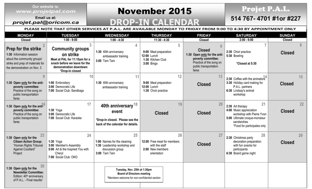 Projet P.A.L. November Our website is2015 www.projetpal.comEmail us at DROP-IN CALENDAR Our website is: www.projetpal.com Email us at: [email protected] 514 767- 4701 #1or #227 PLEASE NOTE THAT OTHER SERVICES AT P.A.L. ARE AVAILABLE MONDAY TO FRIDAY FROM 9:00 TO 4:30 BY APPOINTMENT ONLY MONDAY TUESDAY WEDNESDAY THURSDAY FRIDAY SATURDAY SUNDAY Closed 1:00 - 9:00 1:00 - 4:30 11:30 - 4:30 Closed 2:00 - 9:00 Closed 2 Prep for the strike 6 1:30 Information session about the community groups' strike and prep of materials for the demonstration on Nov. 3 1:30 9 Open only for the anti-6 poverty committee: Practice of the song on public transportation fares 3 Community groups 6 on strike Meet at PAL for 11:15am for a snack before we leave for the demonstration downtown *Drop-in closed 23 30 1:30 Open only for the Newsletter Committee: Edition: 40th anniversary of P.A.L. - Final results! 1:30 40th anniversary ambassador training 3:00 Tam Tam 10 17 5 9:00 12:00 1:30 3:00 Meal preparation Lunch Kitchen Club Bingo 13 Closed 20 19 Closed Closed *Drop-in closed. Please see the back of the calendar for details. 24 9 1:30 Yoga 3:00 Member's Assembly 5:00 Art & the Inspired You with Cheryl 7:00 Social Club: OKO 25 1:00 Names for the cleaning 1:30 Leadership workshop and discussion group 3:00 Tam Tam 26 12:00 Free meal for members with the staff 2:00 New members orientation Tuesday, Nov. 25th at 1:30pm Board of Directors meeting *Members welcome for non-confidential section 27 Closed 8 7 6 Closed 2:30 Choir practice 1:30 Open only for the anti- 5:30 Bowling poverty committee: Practice of the song on *Closed at 5:30 public transportation fares 9:00 Meal preparation 12:00 Lunch 1:30 Choir practice 40th anniversary 18 event Closed 12 11 1:30 40th anniversary ambassador training 1:00 Embroidery 3:00 Democratic Life 7:00 Social Club: Sandbags 16 1:30 Open only for the antipoverty committee: 1:30 Yoga Practice of the song on 3:00 Democratic Life public transportation 7:00 Social Club: Karaoke fares 1:30 Open only for the Citizen Action Group: “Human Rights Tribunal Against Couillard” Project 4 6 14 2:30 Coffee with the animators 3:30 Holiday card making for P.A.L. partners 6:30 Lindsay's animal workshop 15 Closed 21 2:30 Art therapy 4:00 Music appreciation workshop with Pierre Yvon 5:00 Ultimate croque-monsieur sandwiches *Food for participates only 22 Closed 28 2:30 Christmas party decoration preparation with fun snacks for participants 6:30 Board game night 29 Closed N o v e m b e r D r o p - i n Where is P.A.L. exactly? 2 0 1 5 c a l e n d a r 861 de l'Église, Verdun, QC H4G2N3 PROJET PAL 10 min. walk from metro station “De l’Eglise” or “Verdun” 108 Bus to the corner of Bannantyne and De l’Eglise and walk to 861 107 Bus to the corner of Verdun and De l’Église and walk to 861 Opening Hours: Monday Tuesday Wednesday Thursday Friday Saturday Sunday Drop-in CLOSED but offices open 1:00 pm - 9:00 pm 1:00 pm - 4:30 pm 11:30 am - 4:30 pm Drop-in CLOSED but offices open 2:00 pm - 9:00 pm Drop-in CLOSED For more information, you can contact PAL: Phone: 514 767- 4701 #1 or #227 Website: www.projetpal.com Email: [email protected] Info session and preparation for a demonstration - Monday, November 2nd at 1:30pm: Community groups will be on strike on November 3rd to advocate for better funding and for more recognition. Come participate in a meeting to discuss the reasons for this strike and to prepare the materials for the demonstration on November 3rd. Community groups on strike - Tuesday, November 3rd at 11:15am: Join us at PAL for coffee and a snack before we head out at 11:45am. We will be meeting up with other Verdun groups at 12:00pm at the de l'Église metro and then heading downtown to participate in the demonstration taking place there. 40th anniversary ambassador training - Wednesday, November 4th and 11th at 1:30pm: Now's your chance to come and learn how you can have a practical and important role in one of the big events coming up soon to celebrate PAL's 40th anniversary! These training sessions will enable interested members to be prepared to represent PAL at the musical gala evening at the Lion d'Or on November 18, 2015. PAL's 40th anniversary musical gala evening - Wednesday, November 18 at 7:00pm: PAL is inviting members of the community to celebrate 40 years with us! It will be a musical evening rich with fun entertainment, touching testimonies, performances by both PAL members and by musicians, and opportunities to meet new people! This awesome event is being held at the Lion d'Or and the doors open at 6:30pm. Members who would like to take part are asked to come talk to one of the Drop-in workers. (Please see info on "Ambassador training"). Kitchen Club - Thursday, November 5th at 1:30pm: The Kitchen Club is PAL's new group for members who would like to commit to being involved in the meal preparation and other tasks in the kitchen. In the next meeting, we will continue laying groundwork for this project and choose recipe's. Please see one of the Drop-in workers if you would like more information. Christmas celebration with PAL - Friday, December 11: Tickets will be on sale from November 10th until December 5th for our annual Christmas celebration. A surprise is planned this year in honour of PAL's 40th anniversary! Tickets will be 5.00$ for permanent members and 7.50$ for temporary and community members. Projet P.A.L. Novembre 2015 CALENDRIER DU DROP-IN Notre site web est: www.projetpal.com Envoyez un courriel électronique à: [email protected] 514 767- 4701 #1or #227 PRENEZ NOTE QUE LES AUTRES SERVICES DE P.A.L. SONT DISPONIBLES DU LUNDI AU VENDREDI DE 9H00 À 16H30 SUR RENDEZ-VOUS SEULEMENT LUNDI MARDI Fermé 2 Prep. de la grève 13h30 Session d’info sur la grève du communautaire et préparation de matériel pour la manif du 3 novembre 13h30 Ouvert seulement 9 pour le comité antipauvreté: Pratique de la chanson pour le 40e de P.A.L. 16 13h30 Ouvert seulement pour le comité 