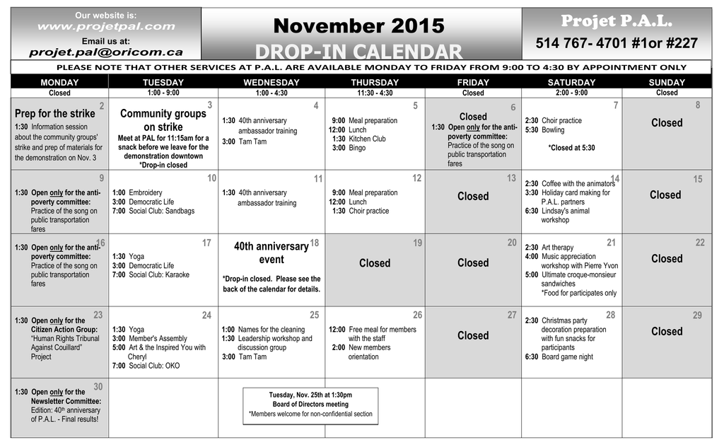 November 2015 DROP-IN CALENDAR