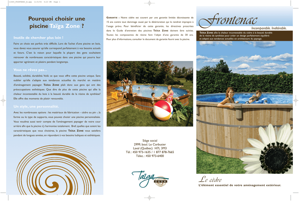 11649_FRONTENAC_B.qxp 11/6/06 4:23 PM Page 1 Pourquoi choisir une piscine Taïga Zone ? GARANTIE : Notre cèdre est couvert par une garantie limitée décroissante de 15 ans contre tout dommage causé par la détérioration qui le rendrait impropre à l’usage prévu. Pour bénéficier de cette garantie, les directives prescrites dans le Guide d’entretien des piscines TAÏGA ZONE doivent être suivies. Toutes les composantes de résine font l’objet d’une garantie de 30 ans. Inutile de chercher plus loin ! Pour plus d’informations, consulter le document de garantie fourni avec la piscine. Frontenac Incomparable. Inaltérable. TAÏGA ZONE allie la chaleur incontestable du cèdre à la beauté durable de la résine de synthèse pour créer un design parfaitement équilibré et adapté aux tendances actuelles en architecture du paysage. Faire un choix est parfois très difficile. Lors de l'achat d'une piscine en bois, vous devez vous assurer qu'elle correspond parfaitement à vos besoins actuels et futurs. C'est la raison pour laquelle la plupart des gens souhaitent retrouver de nombreuses caractéristiques dans une piscine qui pourra leur apporter agrément et plaisirs pendant longtemps. Vous ne rêvez pas... Beauté, solidité, durabilité. Voilà ce que vous offre cette piscine unique. Sans oublier qu'elle s'adapte aux tendances actuelles du marché en matière d'aménagement paysager. TAÏGA ZONE plaît donc aux gens qui ont des préoccupations esthétiques. Que dire de plus de cette piscine qui allie la chaleur incontestable du bois à la beauté durable de la résine de synthèse? Elle offre des moments de plaisir renouvelés. Un style, une personnalité. Avec les nombreuses options : les matériaux de fabrication - cèdre ou pin -, la forme ou le type de supports, vous pouvez choisir une piscine personnalisée. Vous voudrez aussi tenir compte de l'aménagement paysager de votre cour arrière afin que la piscine s'y harmonise totalement. Bref, quelles que soient les caractéristiques que vous choisirez, la piscine TAÏGA ZONE vous satisfera pendant de longues années, en répondant à vos besoins ludiques et esthétiques. Siège social 2999, boul. Le Corbusier Laval (Québec) H7L 3M3 Tél. : 450 973-1635 / 1 877 878-7665 Télec. : 450 973-6400 L e cèdre L’élément essentiel de votre aménagement extérieur. 11649_FRONTENAC_B.qxp 11/6/06 4:23 PM Page 2 Frontenac Solidité et fiabilité En plus de se marier parfaitement à l’environnement, les piscines de bois TAÏGA ZONE offrent l’avantage de la solidité et de la durabilité. Leur structure rigide résiste aux intempéries et aux chutes de neige abondantes. Lorsqu’elles sont traitées selon les recommandations du fabricant, elles vieillissent en beauté et en harmonie avec les autres éléments naturels de l’aménagement. Outre sa beauté incontestable, le cèdre présente des avantages marqués pour la construction de structures exposées aux éléments. En effet, cette essence de bois bénéficie d'une résistance naturelle à la moisissure et aux termites, ce qui élimine le besoin de traiter le bois à l'aide de produits chimiques ou autres. De plus, le cèdre présente une stabilité exceptionnelle, ce qui réduit tout risque de fendillement, d'écaillage et de torsion. Fiche technique Les ensembles de piscines TAÏGA ZONE comprennent des panneaux de bois prêts à installer, ainsi que des composantes de résine et d’acier. Ovale avec Ronde Circulaire, cette piscine offre une grande stabilité. S'harmonisant parfaitement avec les éléments de la nature, elle permet de créer un environnement des plus agréables. Caractéristiques spécifiques l l l l l l l l l l Panneaux rigides et flexibles préassemblés et préperforés pour en faciliter l’installation; Les composantes de résine comprennent les joints de margelle, les supports de courroies, les colonnes et les attaches de panneaux; Toile accrochée avec bordure décorative; Mousse isolante de première qualité; Quincaillerie traitée contre la corrosion; La piscine Frontenac est offerte pour l’installation hors terre et semi-creusée. 1,31 m (51 po) 4 m (13 pi) 4,6 m (15 pi) 5,5 m (18 pi) 6 m (20 pi) 7 m (23 pi) 7,9 m (26 pi) *Toutes les dimensions indiquées sont approximatives. Les dimensions réelles peuvent varier. Courroies Ses larges margelles aux rebords droits et ses joints élégants donnent à la piscine Frontenac son charme unique et sophistiqué. Les panneaux flexibles sont préassemblés et perforés pour en faciliter l'installation. Les planches permettent l'expansion et la contraction selon les conditions changeantes d'humidité. Deux solides courroies d'acier inoxydable encerclent la piscine. Leur solidité a été conçue et testée pour retenir la pression exercée par l'eau dans la piscine. Ovale sans jambes de force Caractéristiques spécifiques l l l l l l l l l l l Panneaux rigides et flexibles préassemblés et préperforés pour en faciliter l’installation; Les composantes de résine comprennent les joints de margelle, les supports de courroies, les colonnes et les attaches de panneaux; Toile accrochée avec bordure décorative; offerte avec option de dénivellation pour son application semi-creusée (ill.1); Mousse isolante de première qualité; Quincaillerie traitée contre la corrosion; La piscine Frontenac ovale est offerte pour installation hors terre (ill.2) ou semi-creusée (ill.1). Caractéristiques spécifiques Jambes de force La piscine Frontenac ovale est fournie avec des jambes de force qui lui assurent toute la stabilité voulue. l l l l ill.1 - Semi-creusée (toile avec section profonde) l l l l ill.2 - Hors terre (nécessite un système de courroies) l l Panneaux rigides et flexibles préassemblés et préperforés pour en faciliter l’installation; Les composantes de résine comprennent les joints de margelle, les supports de courroies, les colonnes et les attaches de panneaux; Toile accrochée avec bord