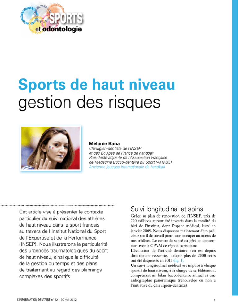 SpoRTS sports à risque et odontologie Sports de haut niveau gestion des risques Mélanie Bana Chirurgien-dentiste de l’INSEP et des Equipes de France de handball Présidente adjointe de l’Association Française de Médecine Bucco-dentaire du Sport (AFMBS) Ancienne joueuse internationale de handball Cet article vise à présenter le contexte particulier du suivi national des athlètes de haut niveau dans le sport français au travers de l’Institut National du Sport de l’Expertise et de la Performance (INSEP). Nous illustrerons la particularité des urgences traumatologiques du sport de haut niveau, ainsi que la difficulté de la gestion du temps et des plans de traitement au regard des plannings complexes des sportifs. L’INFORMATION DENTAIRE n° 22 - 30 mai 2012 Suivi longitudinal et soins Grâce au plan de rénovation de l’INSEP, près de 220 millions auront été investis dans la totalité du bâti de l’institut, dont l’espace médical, livré en janvier 2009. Nous disposons maintenant d’un précieux outil de travail pour nous occuper au mieux de nos athlètes. Le centre de santé est géré en convention avec la CPAM de région parisienne. L’évolution de l’activité dentaire s’en est depuis directement ressentie, puisque plus de 2000 actes ont été dispensés en 2011 (fig. 1). Un suivi longitudinal médical est imposé à chaque sportif de haut niveau, à la charge de sa fédération, comprenant un bilan buccodentaire annuel et une radiographie panoramique (renouvelée ou non à l’initiative du chirurgien-dentiste). 1 SpoRTS et odontologie 1. Évolution de l’activité dentaire à l’INSEP. Cela représente une population très jeune, entre 15 et 35 ans, ce qui est l’occasion idéale pour : - mettre en évidence de mauvaises habitudes alimentaires : exemple de jeunes tennismen qui consomment en excès des boissons énergisantes, recommandées et dosées par leurs entraîneurs, mais ont une trop faible consommation d’eau, ce qui provoque une acidose buccale et la présence accrue de caries interproximales ; - dépister les lésions carieuses et planifier les plans de traitement ; - dépister préventivement des dents de sagesse à risque de péricoronarites, ainsi que les dents incluses à risque d’induire une fracture mandibulaire (sports de combat) ; - mettre en évidence un trouble postural et/ou un trouble occlusal (fig. 2) ; - et conseiller sur les protections intra-buccales (PIB) sur mesure de type III. Urgences et gestion de plannings complexes Même un suivi longitudinal performant ne permet pas de restreindre l’acte d’urgence au seul accident traumatologique. Le planning complexe des sportifs de haut niveau rend parfois ardu l’enchaînement des séances, privilégiant ainsi des soins multiples, des séances plus longues et par secteurs dentaires. Malgré de réelles prises de consciences des fédérations sportives et un investissement constant pour leurs athlètes, nous pouvons encore bouleverser les cultures et inciter certains sports à se protéger et d’autres à mieux se protéger. 2 2. Examen de micro-occlusion, T-Scan III et BioEMG II. Absence de PIB : SE PROTÉGER pour éviter les traumatismes Un dimanche après-midi au Palais Omnisport de Paris Bercy : c’est la veille d’un championnat d’Europe difficile, la fin du match approche, la fatigue s’installe, les gestes deviennent moins précis et c’est le choc (fig. 3), “tête contre tête”, un handballeur est touché à l’arcade, l’autre expulse des fragments dentaires. L’arbitre arrête le temps, les joueurs se mettent à quatre pattes à la recherche des dents, un rapide examen sur le banc de touche vérifie l’absence d’effraction pulpaire… Vingt-quatre heures plus tard, le joueur doit partir disputer un championnat d’Europe. Il faut immédiatement se prononcer sur sa participation et le remettre en état de rejouer sans risque (fig. 4 à 6). Le sportif de haut niveau est un patient très “exposé” sur le plan de la traumatologie, par le simple fait que la quantité d’heures consacrées à l’activité sportive augmente considérablement la probabilité des incidents, tout comme l’intensité qui s’accroît avec le niveau d’engagement physique. À nous de mettre l’accent sur la prévention et la nécessité de mettre en garde nos patients sur les risques réels encourus du fait de leur pratique. Un choc involontaire en sport collectif est courant, l’impact des articulations étant bien souvent plus dévastateurs qu’un gant en cuir ! L’INFORMATION DENTAIRE n° 22 - 30 mai 2012 sports à risque 3. Expulsion de fragments dentaires norvégiens (dans le cercle rouge) à la suite d’un choc involontaire contre une arcade française, lors d’un match amical international de handball. 4. Fracture amélo-dentaires : vue vestibulaire. 5. Fractures amélo-dentaires : vue occlusale. 6. Collage des fragments dentaires et prescription d’une protection intra-buccale sur mesure ! 3 4 5 PIB non adaptée : MIEUX SE PROTÉGER Un lundi matin à l’INSEP : un boxeur de la Savate (boxe française) se présente avec des fractures radiculaires sur 21 et 22 (fig. 7 et 8) et des fêlures sur la 11 (fig. 9). Il me montre son protège-dents du commerce, une PIB adaptable de type « Boil and Bite », relativement bon marché (moins de 25 €), avec laquelle il boxe tous les jours (fig. 10). Il est fabriqué par une entreprise américaine spécialisée dans les articles de protection pour sports de combat qui revendique « une protection de grande qualité, considérant cette protection comme étant haut de gamme, une conception avec une couche externe qui protège et un gel interne qui amortit le choc ». Cependant, cette différence de viscosité crée une concentration de l’énergie d’impact qui n’est donc pas répartie dans l’ensemble de la protection, mais bel et bien localisée sur cette limite. Les fêlures de la 11 (fig. 9) sont dans le m