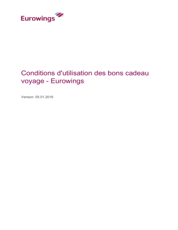 Conditions d'utilisation des bons cadeau voyage - Eurowings Version: 05.01.2016 Conditions d'utilisation des bons cadeau voyage - Eurowings Acquisition et validité 1. Les bons cadeau voyage peuvent uniquement être achetés en ligne sur eurowings.com. Les bons cadeau voyage ainsi que le code de bon cadeau correspondant sont envoyés par e-mail au format PDF à l'adresse e-mail renseignée. 2. Les bons cadeau voyage peuvent uniquement être délivrés en euros. 3. Les bons cadeau sont valables jusqu'à la fin de la troisième année suivant leur date d'achat. Pour connaître la date d'expiration, veuillez vous référer au bon cadeau. Toute prolongation ou tout remboursement du bon cadeau est exclu. 4. L'avoir des bons cadeau est mis à disposition du destinataire dès que le montant que vous avez choisi pour le bon cadeau a été crédité à Eurowings et au plus tôt 24 heures après l'achat. Utilisation 5. Les bons cadeau achetés peuvent uniquement être utilisés en ligne sur eurowings.com. Ils ne peuvent être utilisés que pour la réservation de vols Eurowings signalés par un numéro de vol EW ou 4U ainsi que pour les prestations complémentaires directement liées à un vol Eurowings (comme les suppléments pour bagages en soute ou spéciaux ou la réservation d'un siège). Ces prestations complémentaires peuvent être réglées à l'aide d'un bon cadeau aussi bien lors de la réservation qu'en cas de réservation ultérieure. Les modifications de réservation sont possibles conformément à nos Conditions générales de transport (CGT). En revanche, les bons cadeau ne peuvent pas servir à régler la réservation d'offres de partenaires (telles que un hôtel, la location d'un véhicule ou des assurances). De même, les bons cadeau ne peuvent pas servir à acquérir d'autres bons cadeau. 6. Les bons cadeau délivrés en euros peuvent être utilisés pour les vols dont le paiement s'effectue dans d'autres devises. 7. Si le montant à payer est supérieur au montant du bon cadeau, la différence peut être réglée à l'aide d'un autre mode de paiement autorisé ou d'un autre bon cadeau, en fonction de quoi des frais de transaction peuvent être facturés conformément à nos CGT. 8. Si la valeur du bon cadeau est supérieure au montant à payer, le montant résiduel reste à la disposition du titulaire pour une future réservation avec le même code de bon cadeau pendant toute la durée de validité du bon cadeau. Veuillez noter 2 Conditions d'utilisation des bons cadeau voyage - Eurowings que vous ne recevez pas de nouveau bon cadeau pour le montant résiduel. Tout remboursement des avoirs restants est exclu. 9. Les bons cadeau ne peuvent pas être pris en compte de façon rétroactive pour une réservation effectuée avant l'achat du bon cadeau. Informations sur le droit de rétractation 10. Droit de rétractation Vous disposez d'un délai de quatorze jours pour exercer, sans avoir à justifier votre décision, votre droit de rétractation par écrit (par exemple par courrier, fax ou email). Le délai court à compter de la réception du bon cadeau par le destinataire. Afin d'exercer le droit de rétractation dans les temps, il suffit d'envoyer la demande dans le délai imparti. La notification de rétractation doit être adressée à : Germanwings GmbH Germanwings-Str. 1 D-51147 Cologne Fax : 0231 222 42 420 E-mail : [email protected] Conséquences de la rétractation En cas d'utilisation valide du droit de rétractation, les deux parties sont tenues de restituer les prestations reçues ainsi que les éventuels bénéfices induits. En cas de rétractation de l'achat d'un bon cadeau, nous annulerons le code de bon cadeau et procéderons au remboursement de la valeur correspondante. Remarques spécifiques Le droit de rétractation ne peut être exercé pour les prestations exécutées en totalité par les deux parties avec votre accord avant la fin du délai de quatorze jours. Fin de l'information sur le droit de rétractation 3 Conditions d'utilisation des bons cadeau voyage - Eurowings Généralités 11. Chaque code de bon cadeau correspond à un compte interne auquel vous avez accès par le biais du code de votre bon cadeau. Les bons cadeau, qu'ils soient imprimés ou sous forme d'e-mail, ont uniquement un caractère déclaratoire et ne justifient pas un avoir séparé. Afin d'éviter toute fraude, nous vous recommandons de conserver votre bon cadeau à l'abri de tout accès par des tiers. En effet, toute personne disposant du code de bon cadeau peut effectuer une réservation avec votre avoir. Ceci est également valable dans le cas de la transmission d'un bon cadeau, le titulaire original pouvant toujours utiliser le code du bon cadeau. 12. Eurowings décline toute responsabilité en cas d'erreur de saisie de l'adresse e-mail du bénéficiaire du bon cadeau ou de perte du bon cadeau ou du code correspondant. Aucun duplicata ne sera délivré. 13. Les bons cadeau sont réservés aux particuliers. Toute revente des bons cadeau est interdite sans l'autorisation préalable de Eurowings. Il est en particulier interdit de mettre, personnellement ou via des tiers, les bons cadeau en vente sur des sites de ventes aux enchères ou tout autre site Internet. 14. En cas de fraude, de tentative de fraude ou de soupçon de toute autre activité illégale liée à l'achat ou à l'utilisation d'un bon cadeau, Eurowings est en droit de bloquer le code en question et/ou d'exiger un autre moyen de paiement. Toute réclamation portant sur le déblocage ou le remboursement des bons cadeau concernés est exclue. 15. L'utilisation des bons cadeau est soumise au droit allemand. Si une ou plusieurs dispositions de ces conditions d'utilisation s'avéraient ou devenaient invalides, la validité des autres dispositions n'en serait pas affectée. En outre, l'utilisation des bons cadeau est soumise aux Conditions générales de transport (CGT) ainsi qu'à la charte de confidentialité de Eurowings con